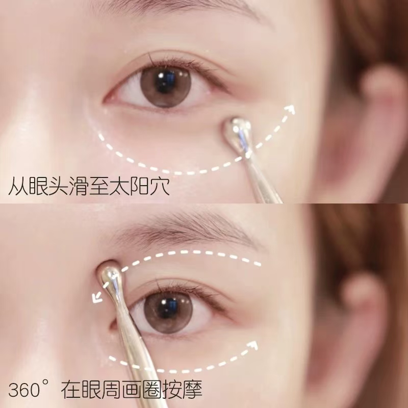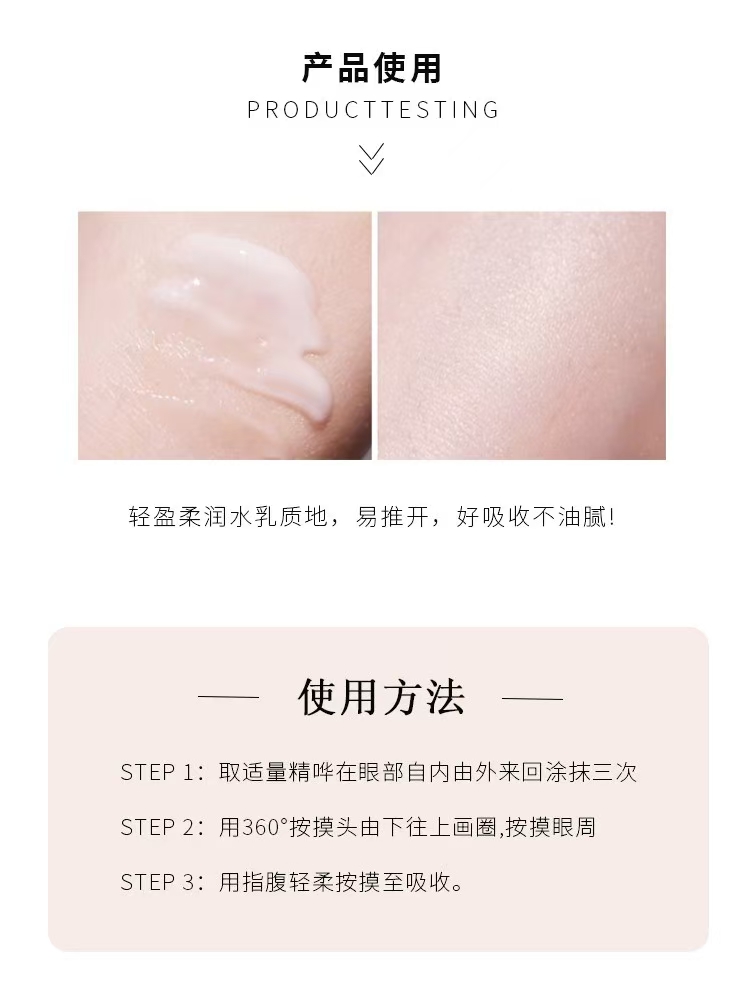 第1步:取适量精华,在眼部下方自内眼角向外,来回涂抹三次;第2步:360°按摩头依次由眼部下方至眼睑上方画圈,按摩眼周肌肤;第3步:最后用指腹轻拍眼周至完全吸收。*眼霜前一步,促进眼周更快吸收,放大眼部保养功效。