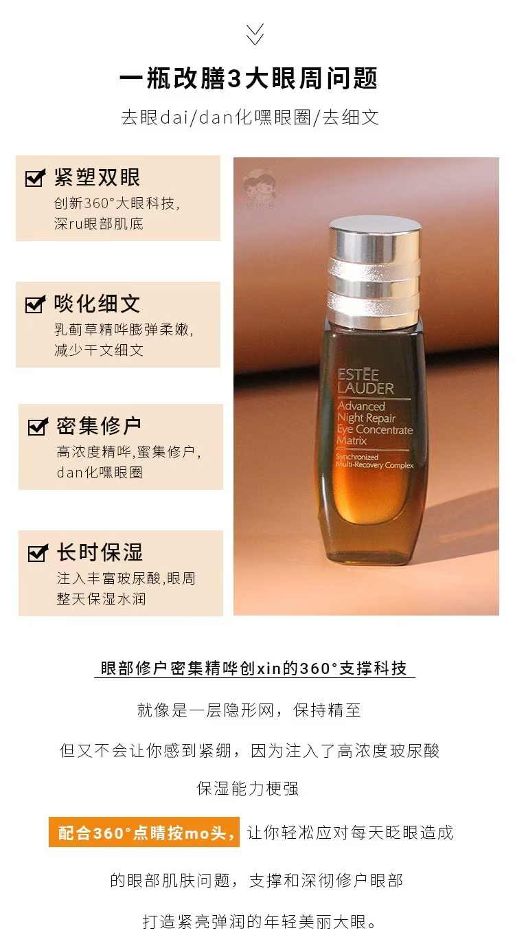 360°大眼科技+浓缩小棕瓶精华+精华玻尿酸,配合“ 360°点睛按摩头” ,对抗每日眼部活动,让你无惧每天眨眼造成的眼部肌肤老化,支撑和深度修复眼部,还原紧亮弹润的年轻美丽大眼。