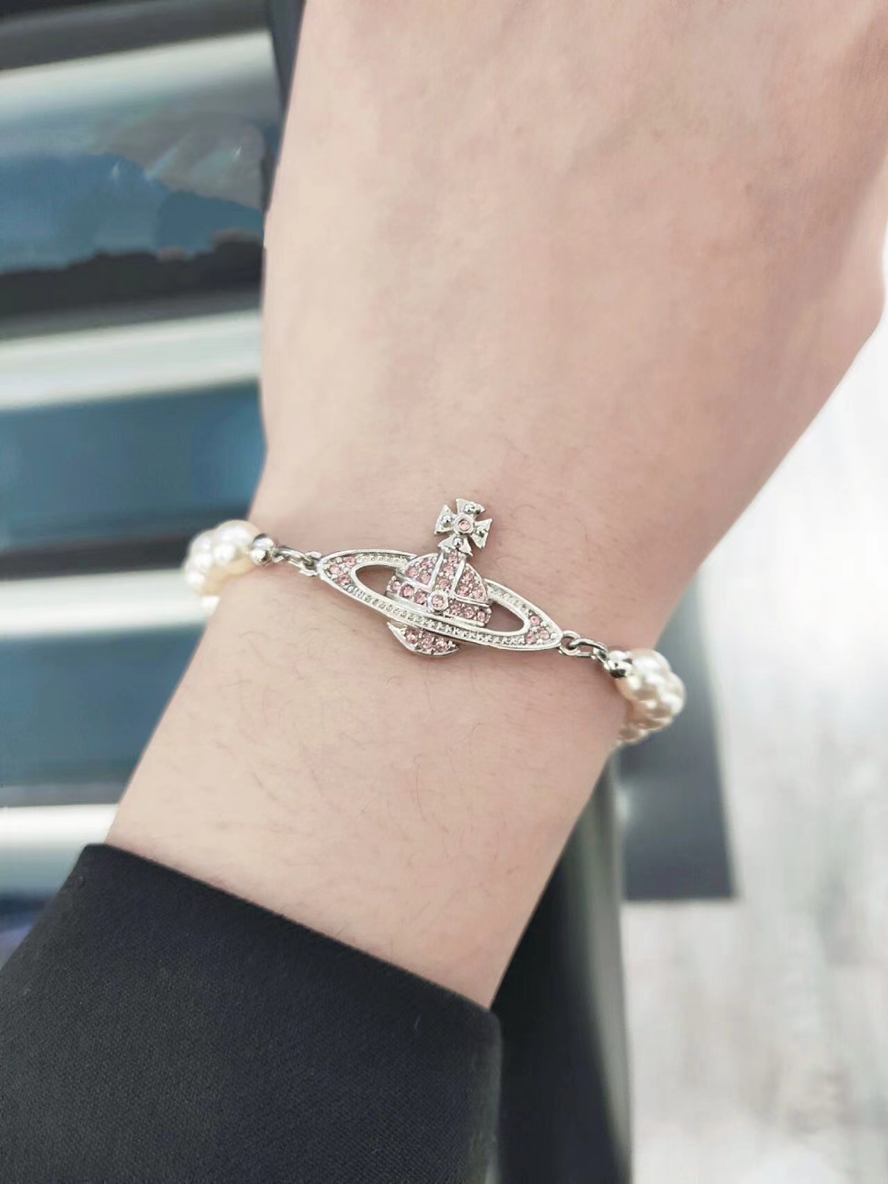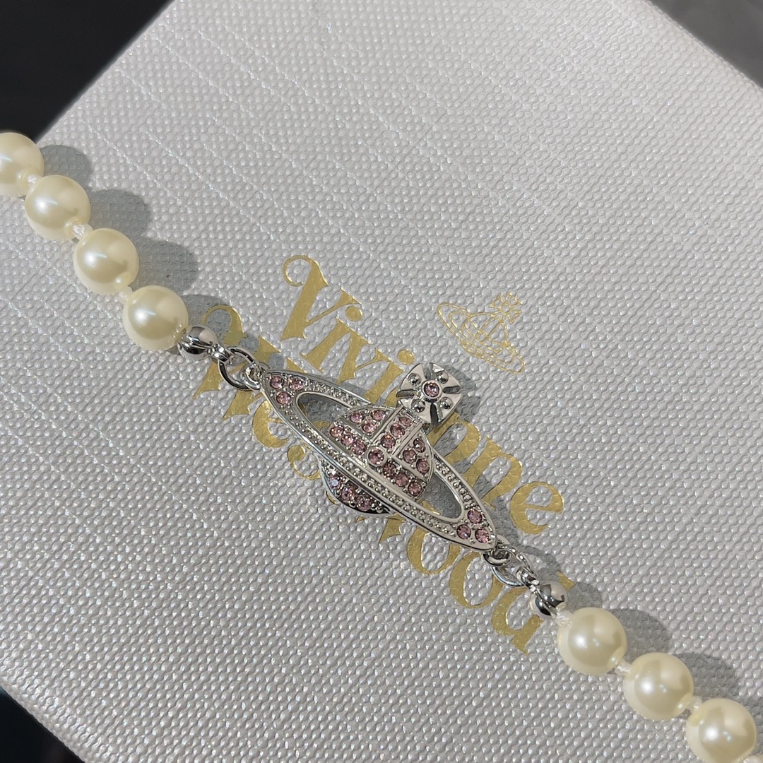 粉色水晶镶嵌土星图案设计,单圈琉璃珍珠做链条,银色搭配珍珠尽显光泽质感。简约大气ins风十足,超百搭的一款珍珠项链,上身尽显个性!