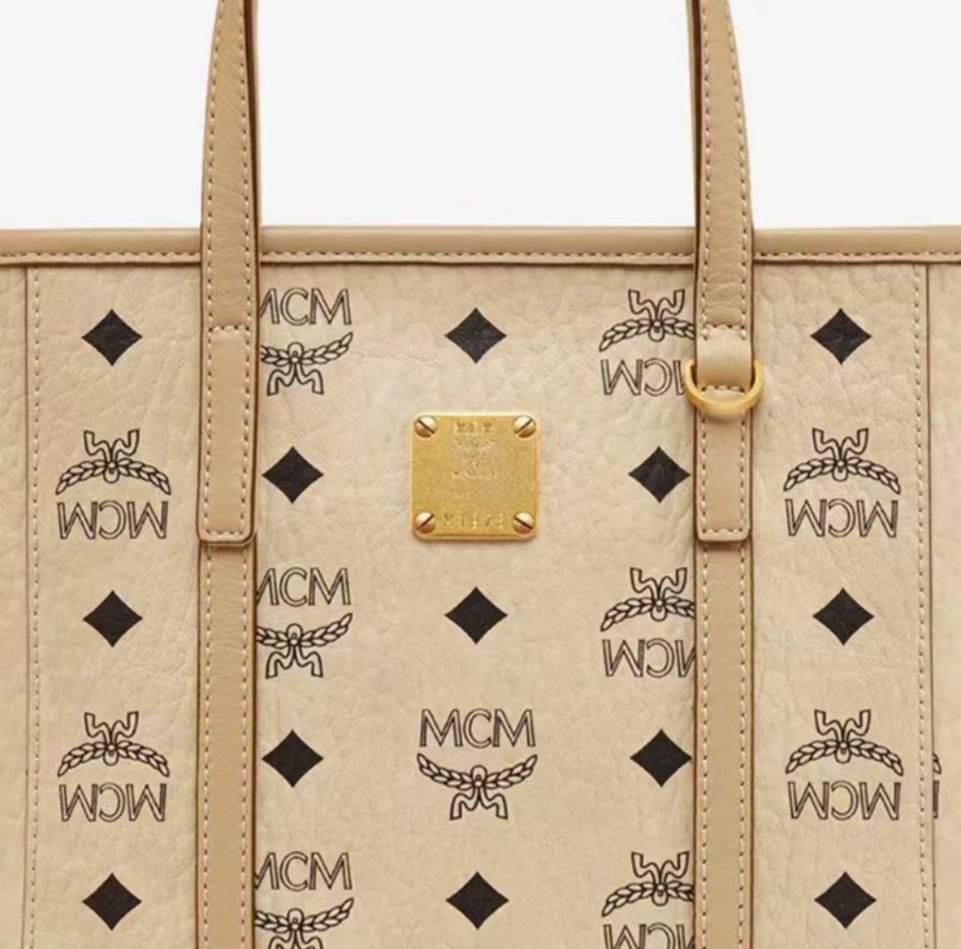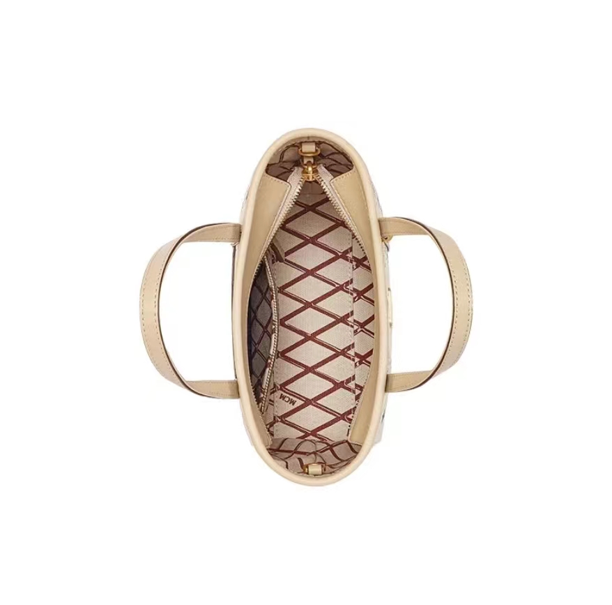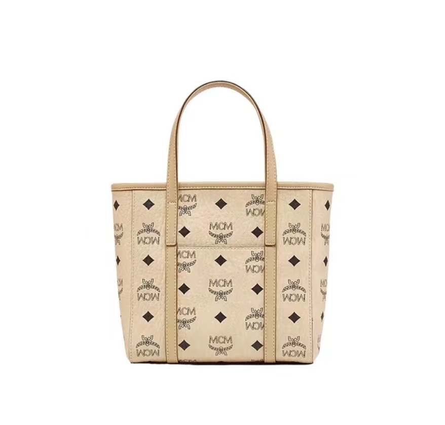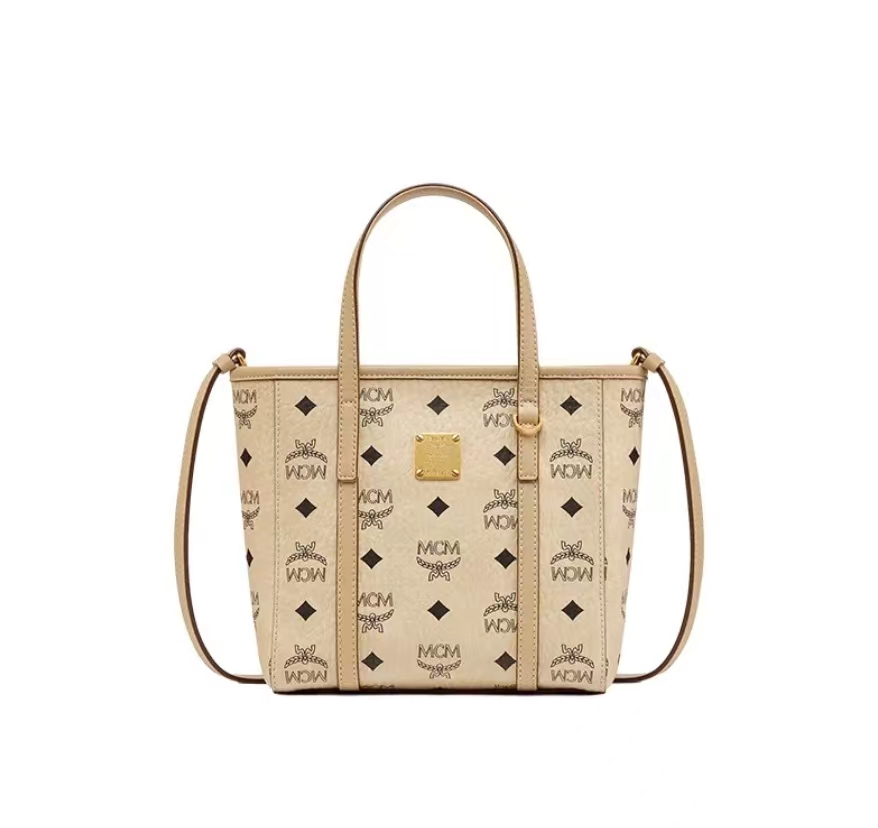 MCM Toni 经典老花满印菜篮子 涂层帆布拼纳帕皮革饰边 托特Tote斜挎购物袋单肩包 迷你 男女同款情侣款 米色