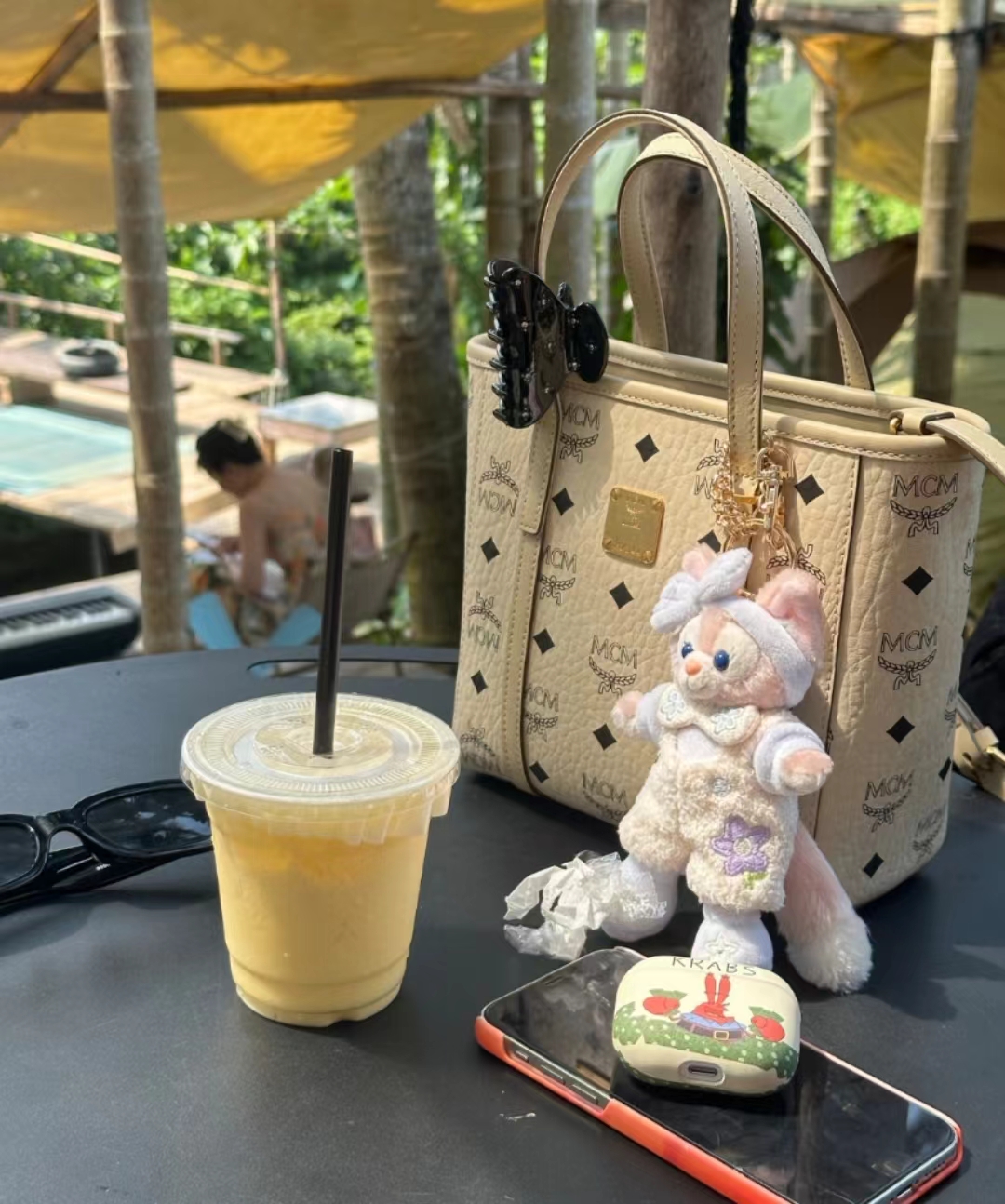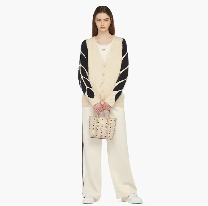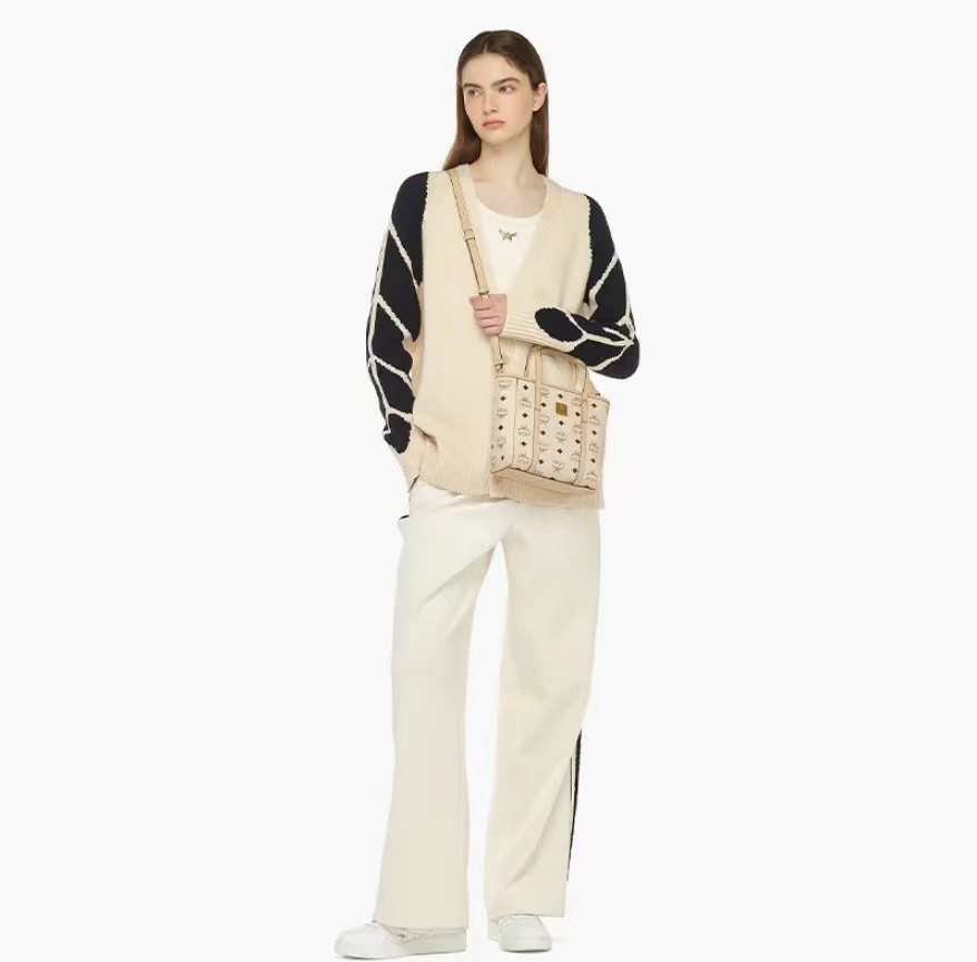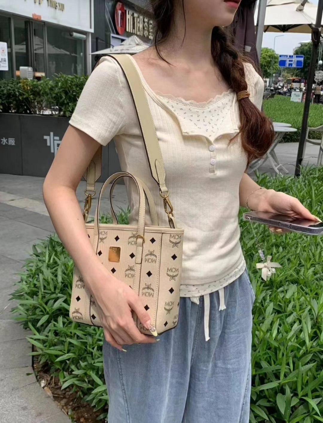 MCM Toni 经典老花满印菜篮子 涂层帆布拼纳帕皮革饰边 托特Tote斜挎购物袋单肩包 迷你 男女同款情侣款 米色