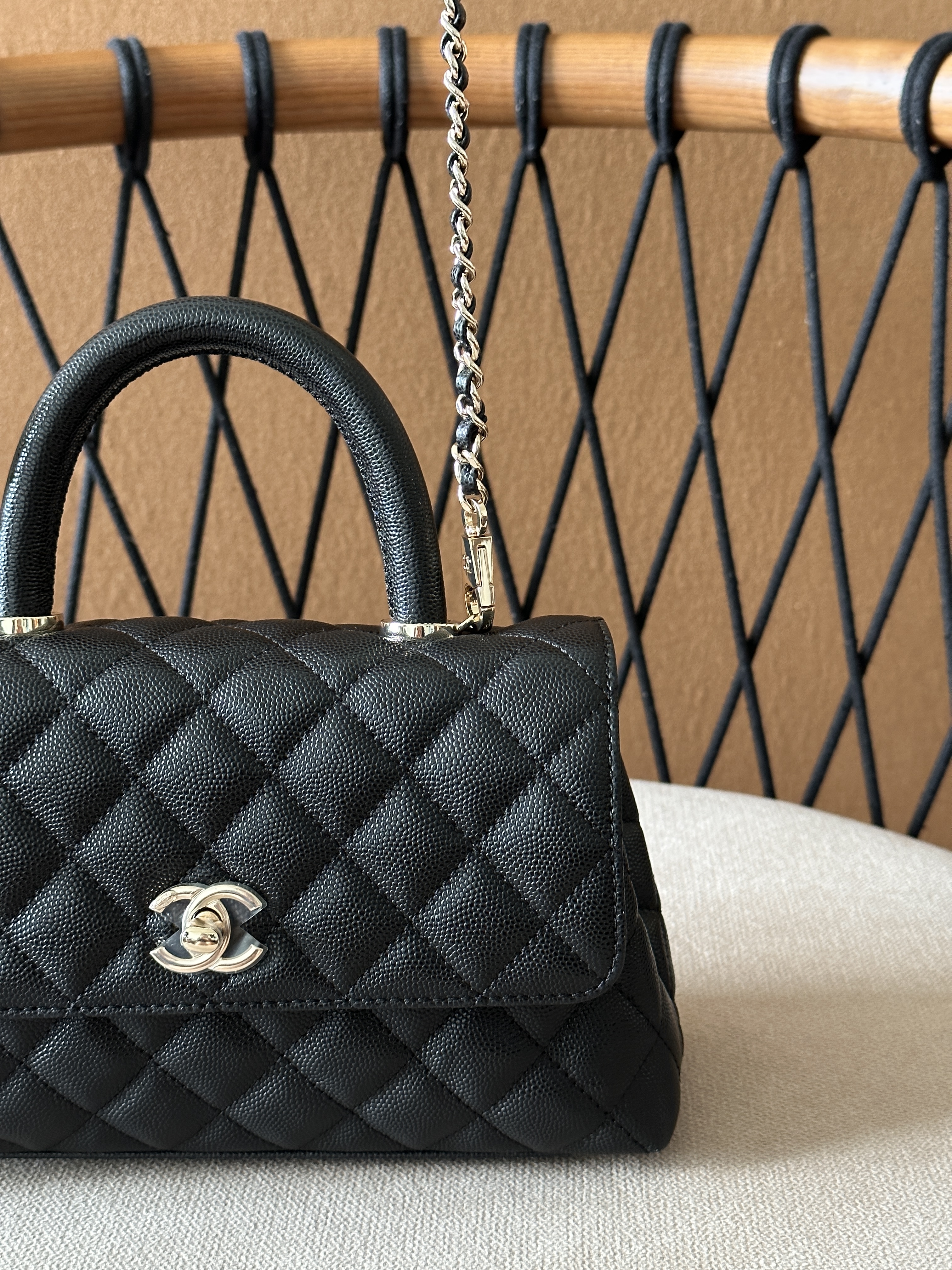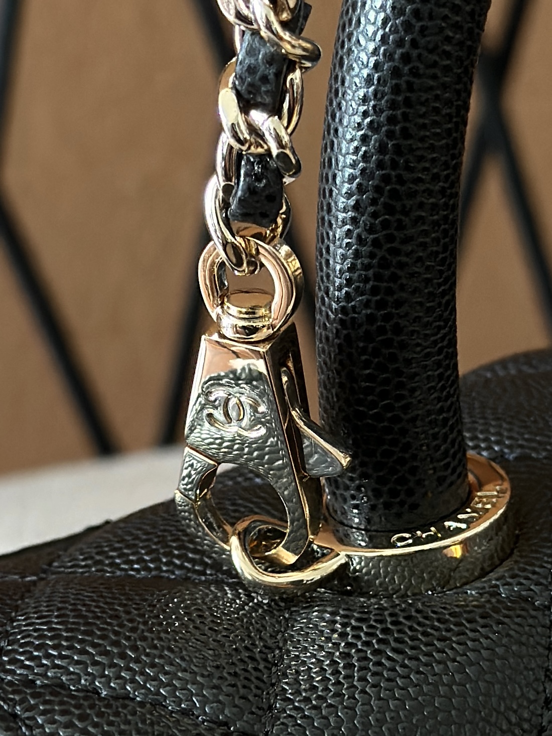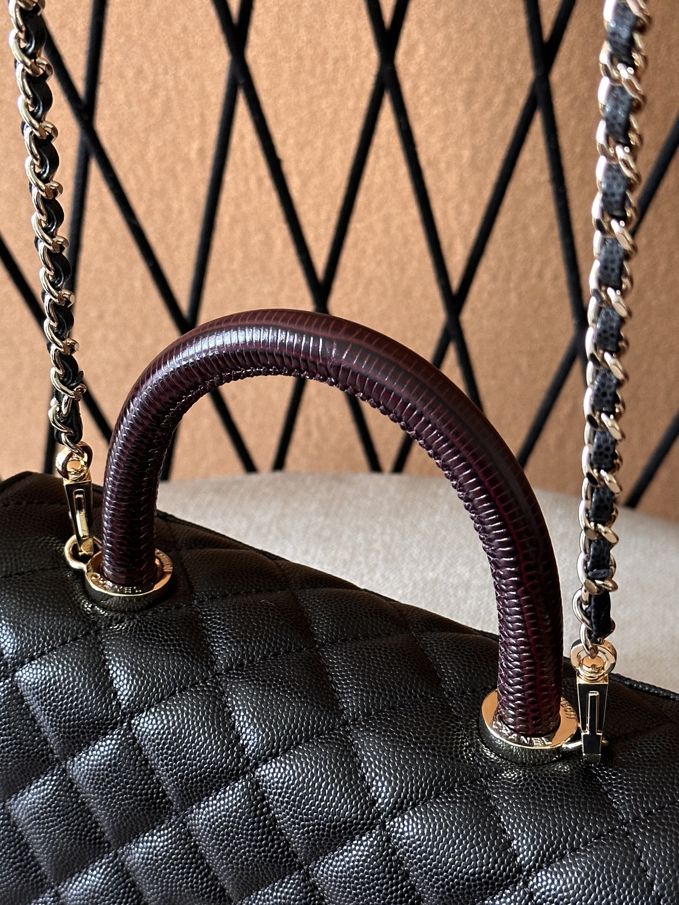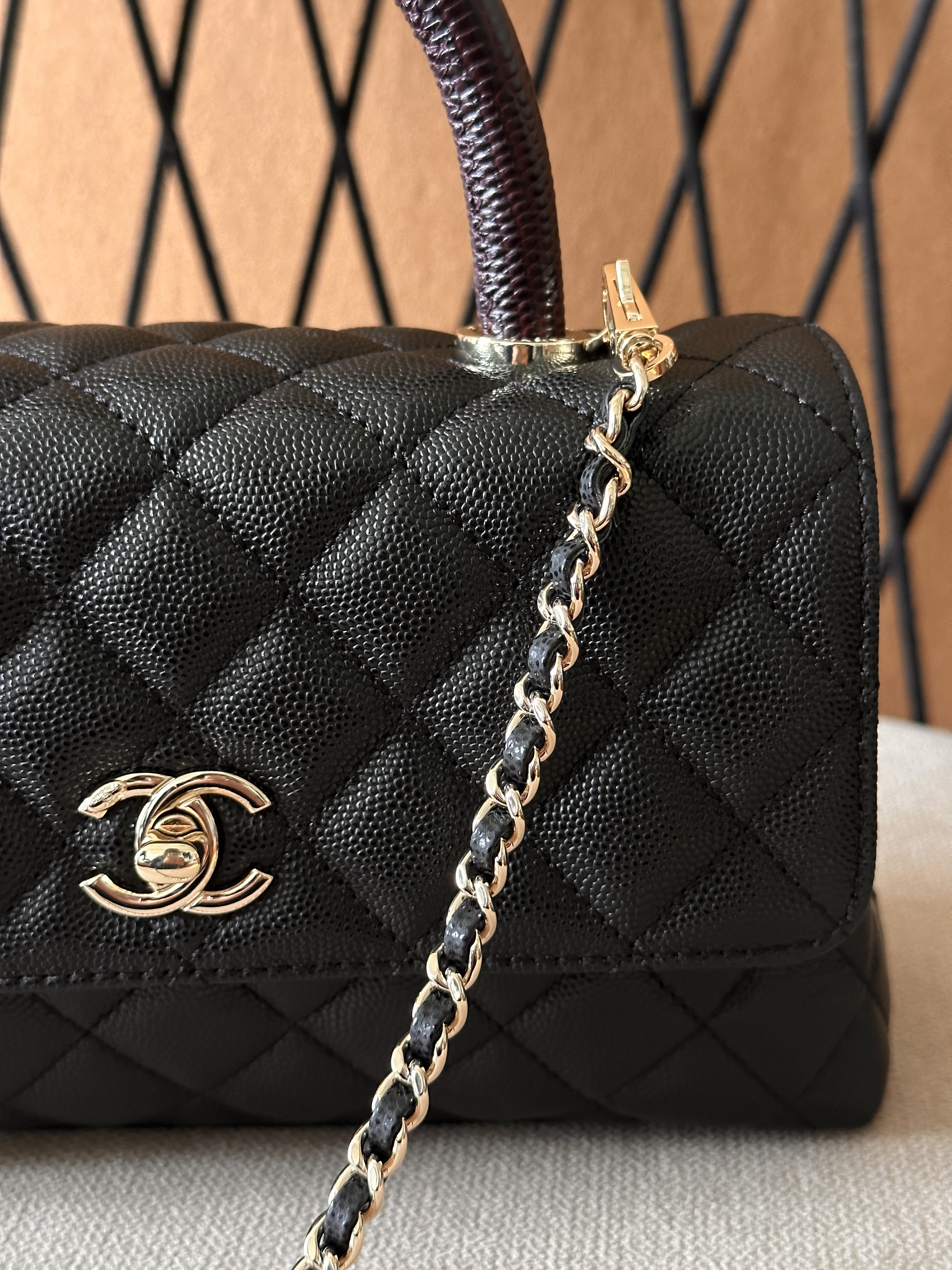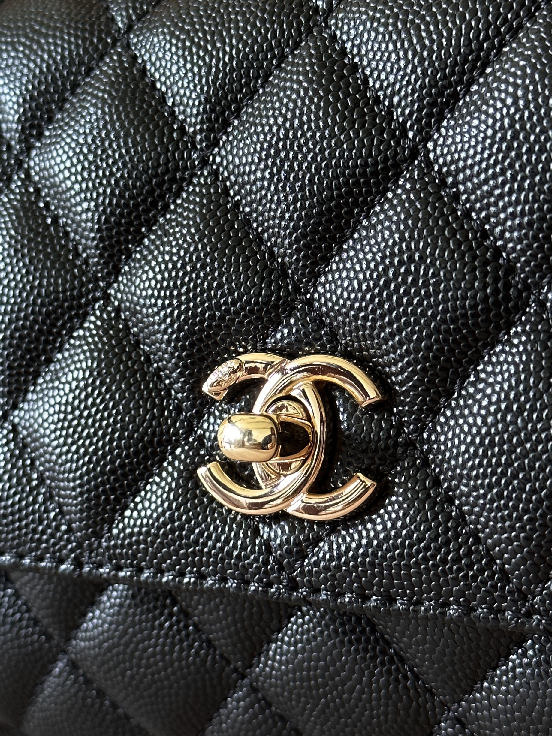 CHANEL香奈儿 香奈儿 Coco Handle 25P 憨豆 菱格亮面金扣皮穿链 颗粒压花牛皮 手柄单肩斜挎包 小号 女款 黑色