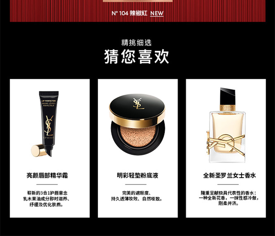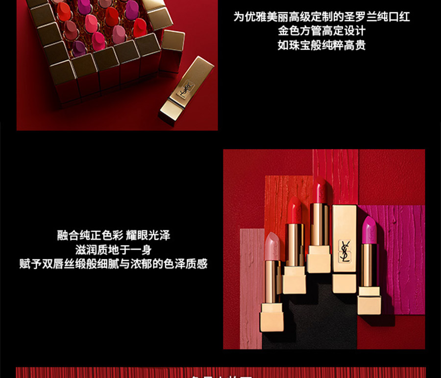 Yves Saint Laurent Beauté 自1964年成立以来不断研发及推出层出不穷的香水及美容产品。Yves Saint Laurent 于50年间已多次缔造成功产品,包括圣罗兰奥飘茗女士香水、圣罗兰巴黎香水和圣罗兰天之骄子男士香水系列。Yves Saint Laurent 化妆品以最高科技研制成,配以珠宝盒般精致的包装,经典产品包括圣罗兰明采笔、圣罗兰绒密睫毛膏、圣罗兰纯口红和圣罗兰纯色唇釉。Lloyd Simmonds 是品牌的彩妆创作总监。护肤品则结合了尖端科研成果、华丽且细腻质感,当中包括圣罗兰妍活青春系列、圣罗兰纯白高定系列、以及高贵奢华的圣罗兰藏金奢妍系列。
