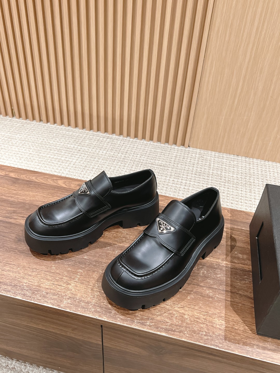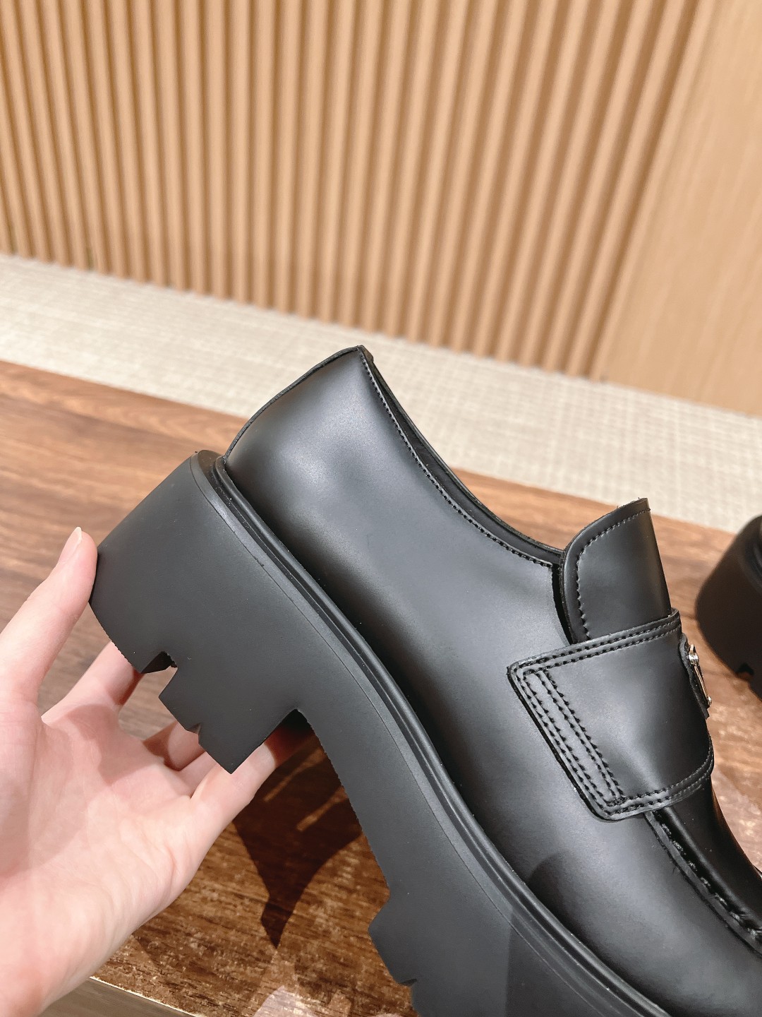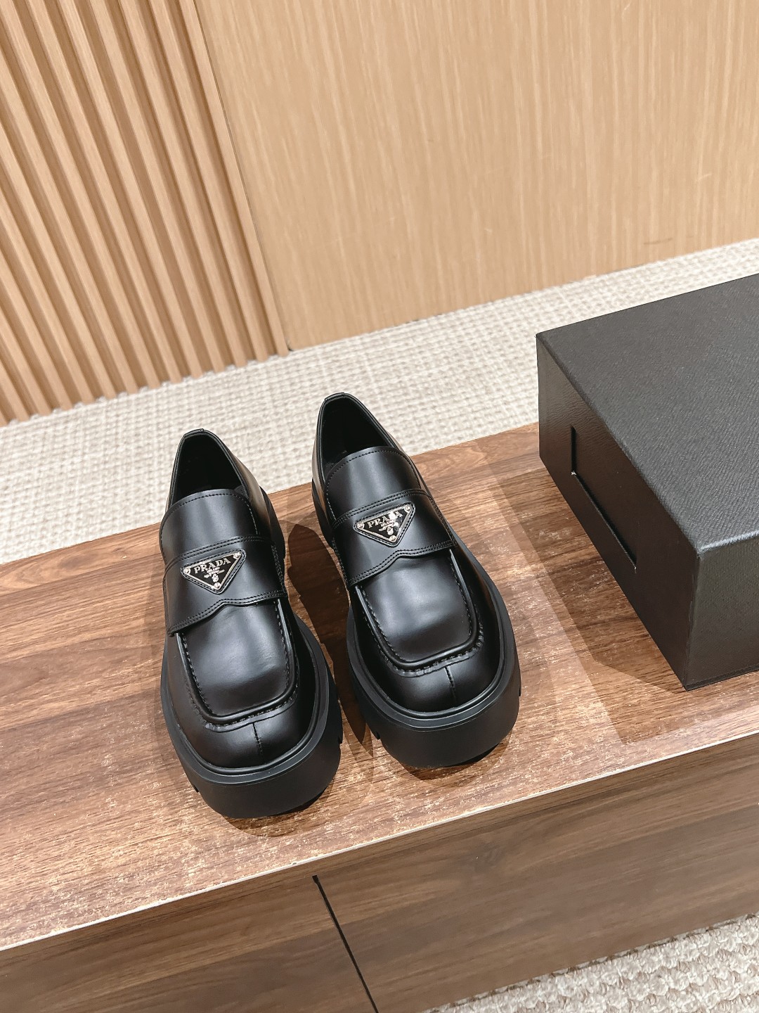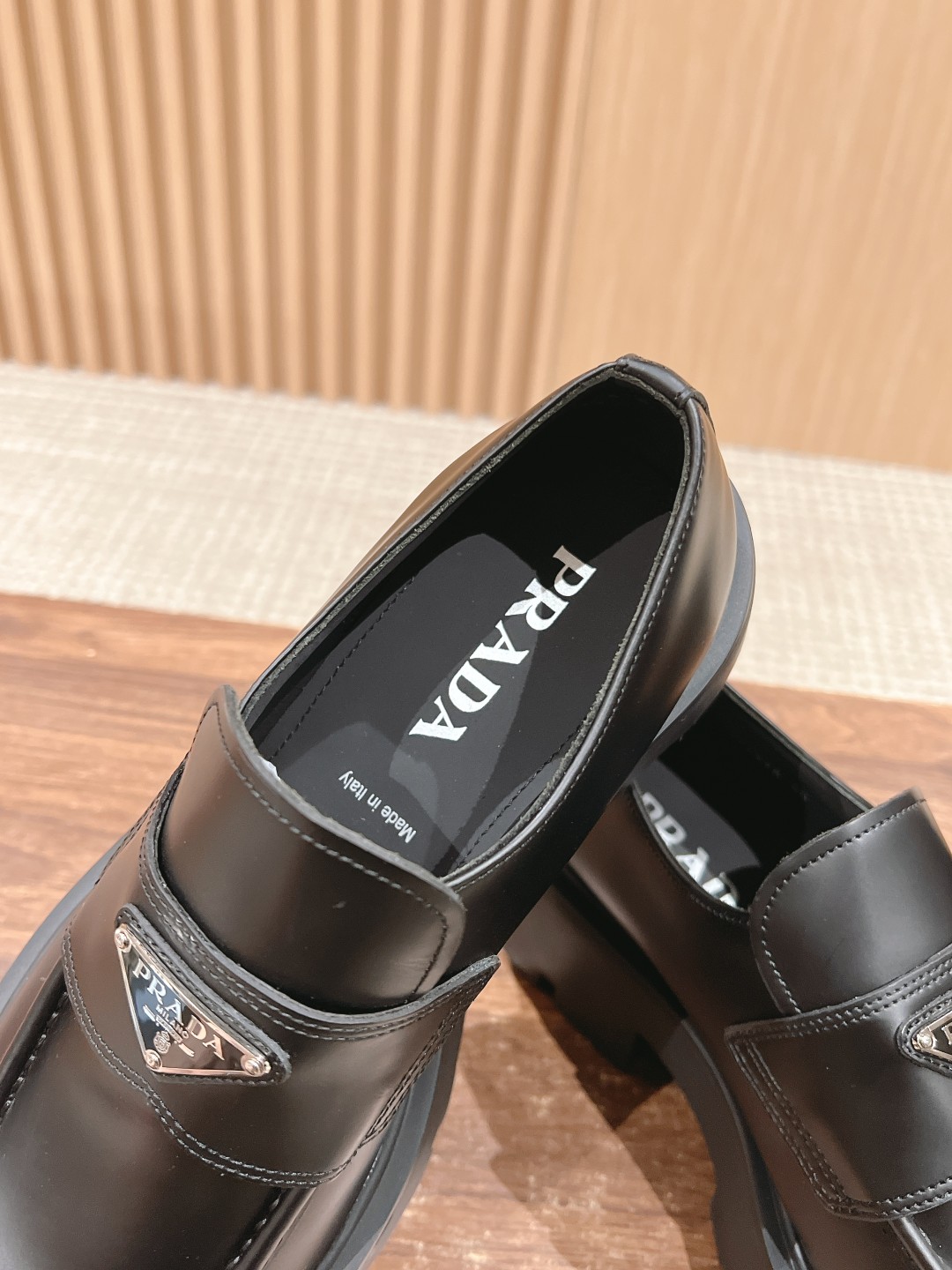 限男码 𝐏𝐑𝐀*厚底三角牌复古乐福鞋 这款鞋面搭配三角牌金属扣 中和了整个鞋子的气质,完全不会特别正式或者老气 进口开边珠牛皮材质 注塑EVA超轻发泡底