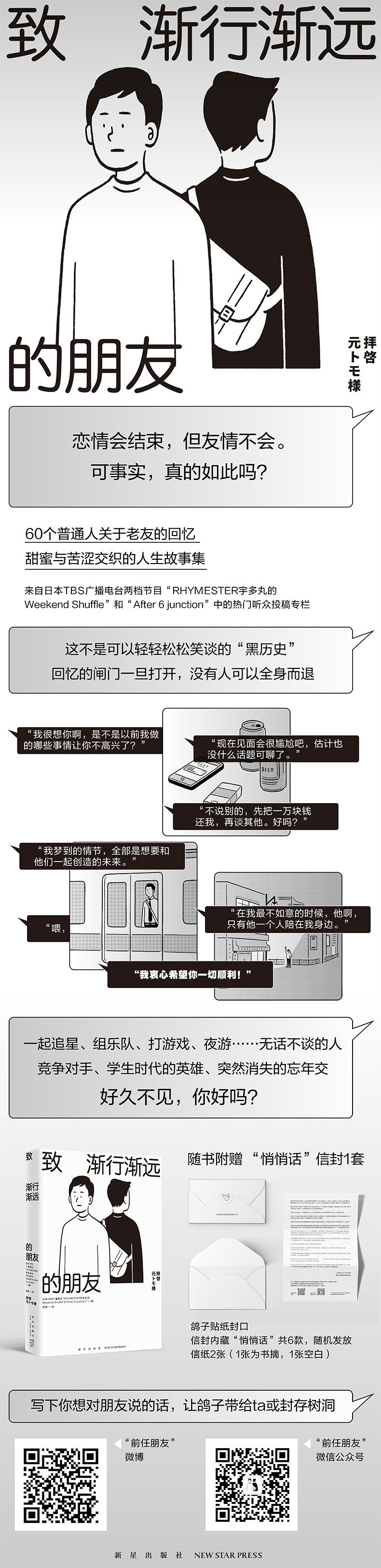 “渐行渐远的朋友”是日本TBS广播电台由RHYMESTER宇多丸主持的两档节目“RHYMESTER宇多丸的Weekend Shuffle”和“After 6 junction”中的热门听众投稿专栏。本书收录了其中60个来自普通人的关于“渐行渐远的朋友”的故事,投稿者有谈及小学时代朋友的十几岁少年,也有回忆打工同伴的四五十岁中年人。人际关系的变化也是成长、做出人生选择的过程,这些经历令我们产生共鸣,同时从中看到生活本身的丰富性。