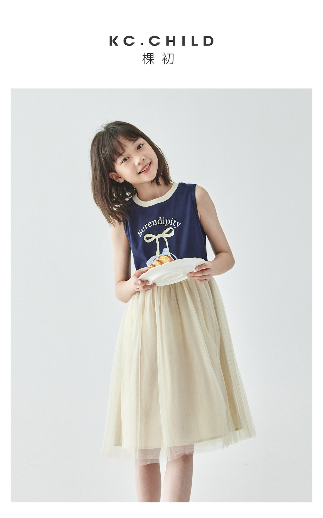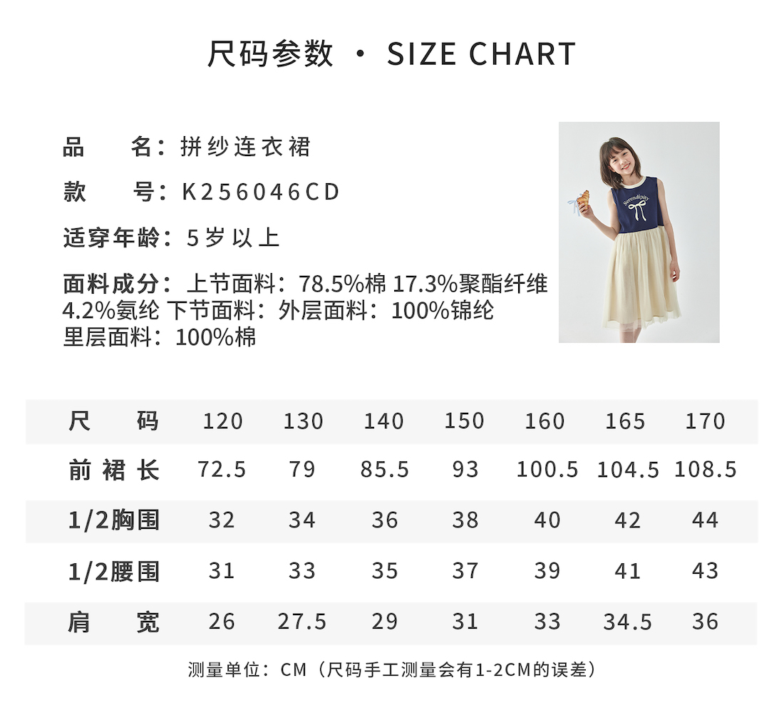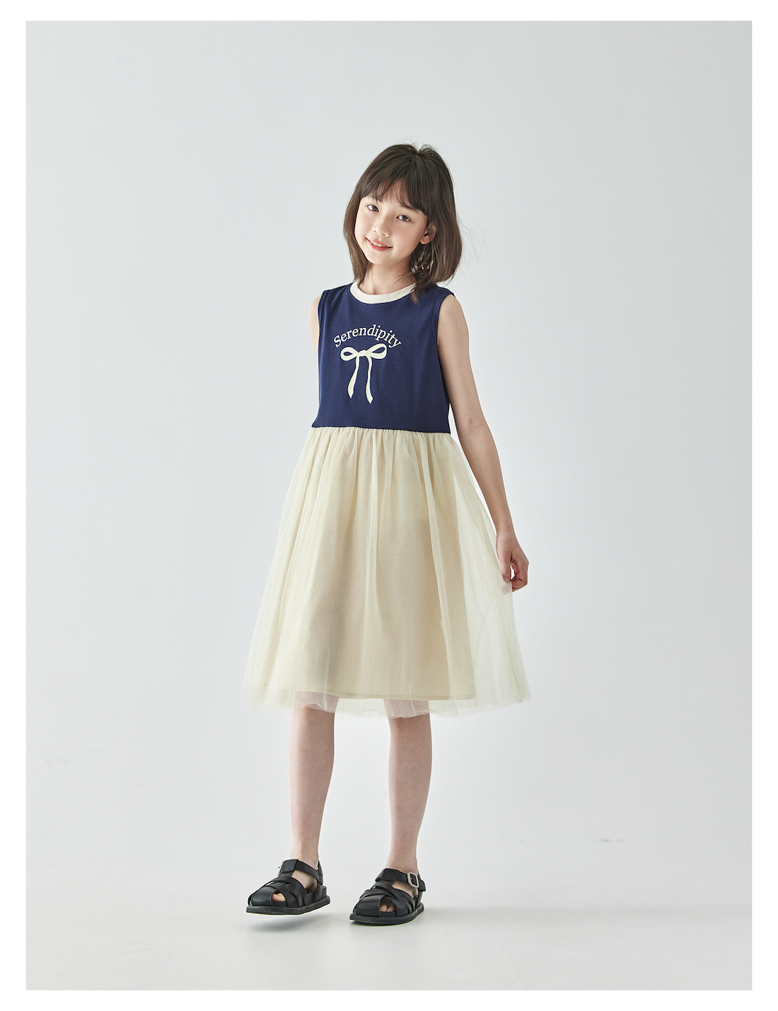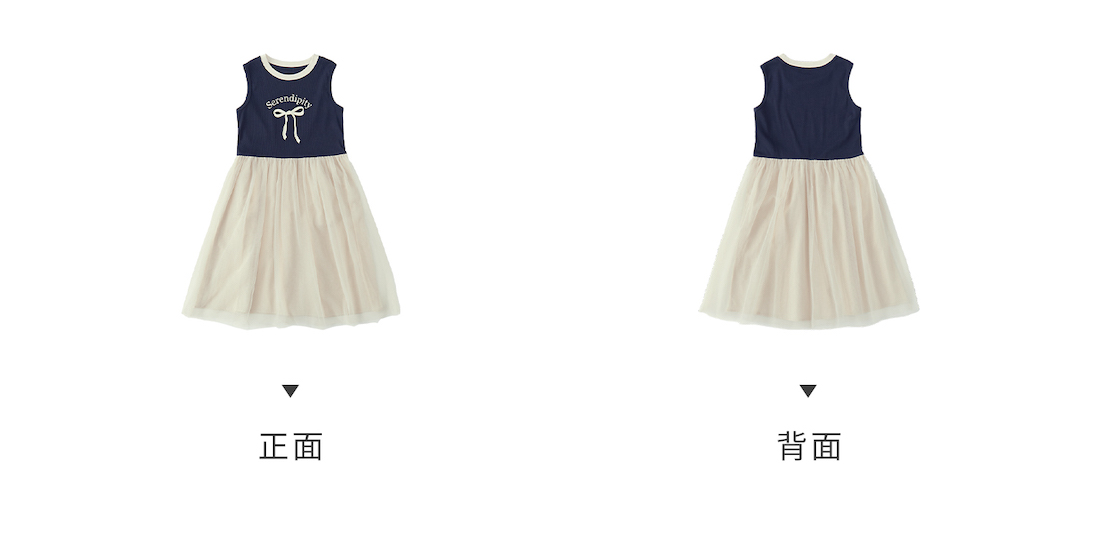 棵初2025年夏季新款拼纱针织背心连衣裙女童蝴蝶结印花无袖中长裙