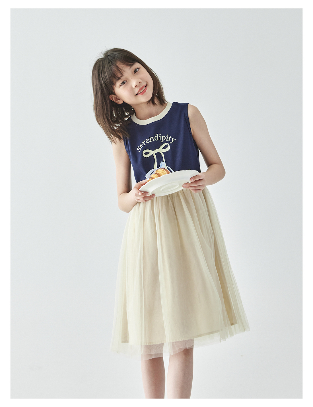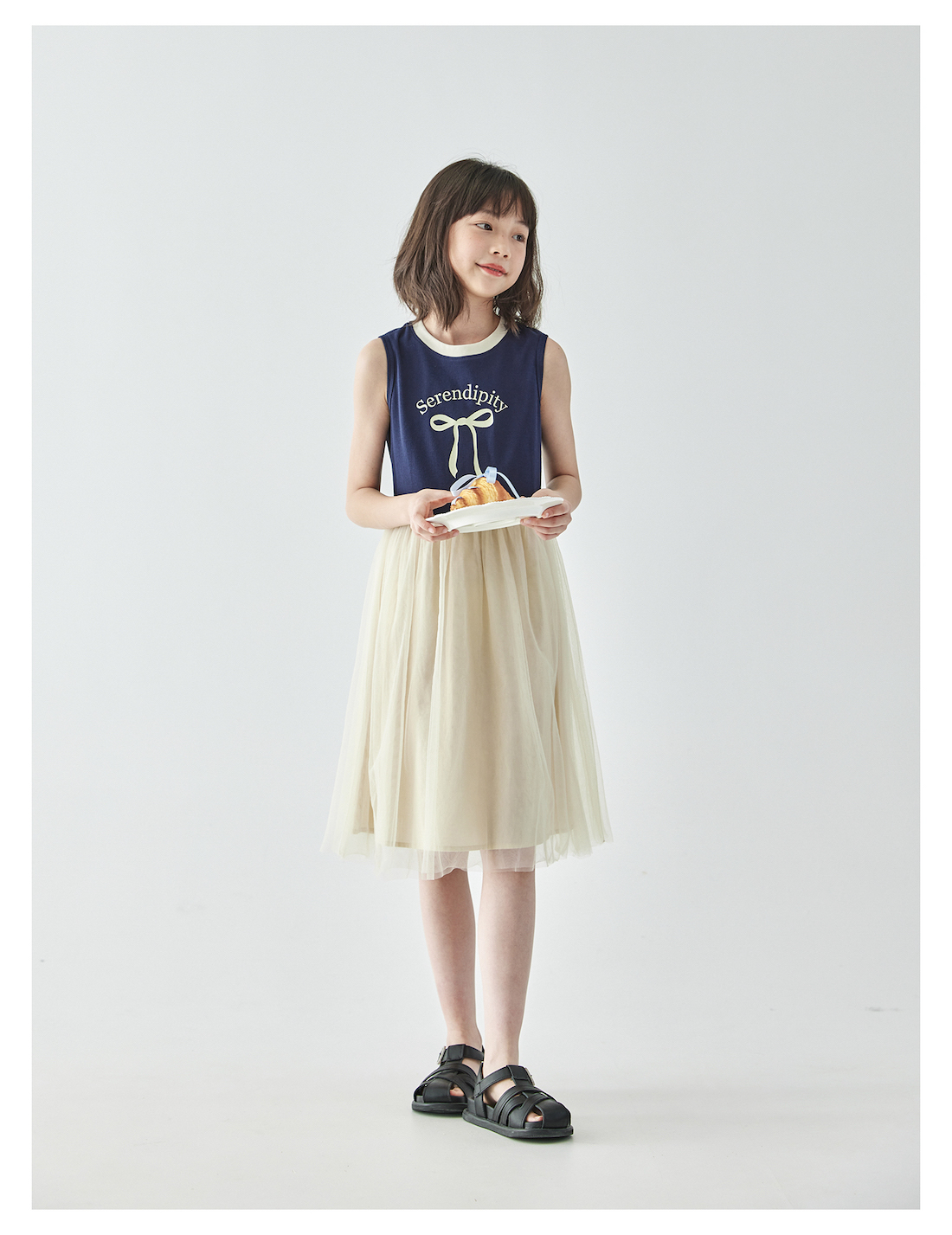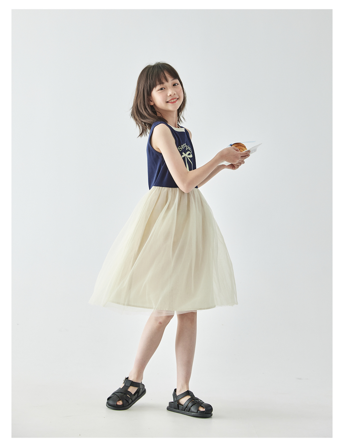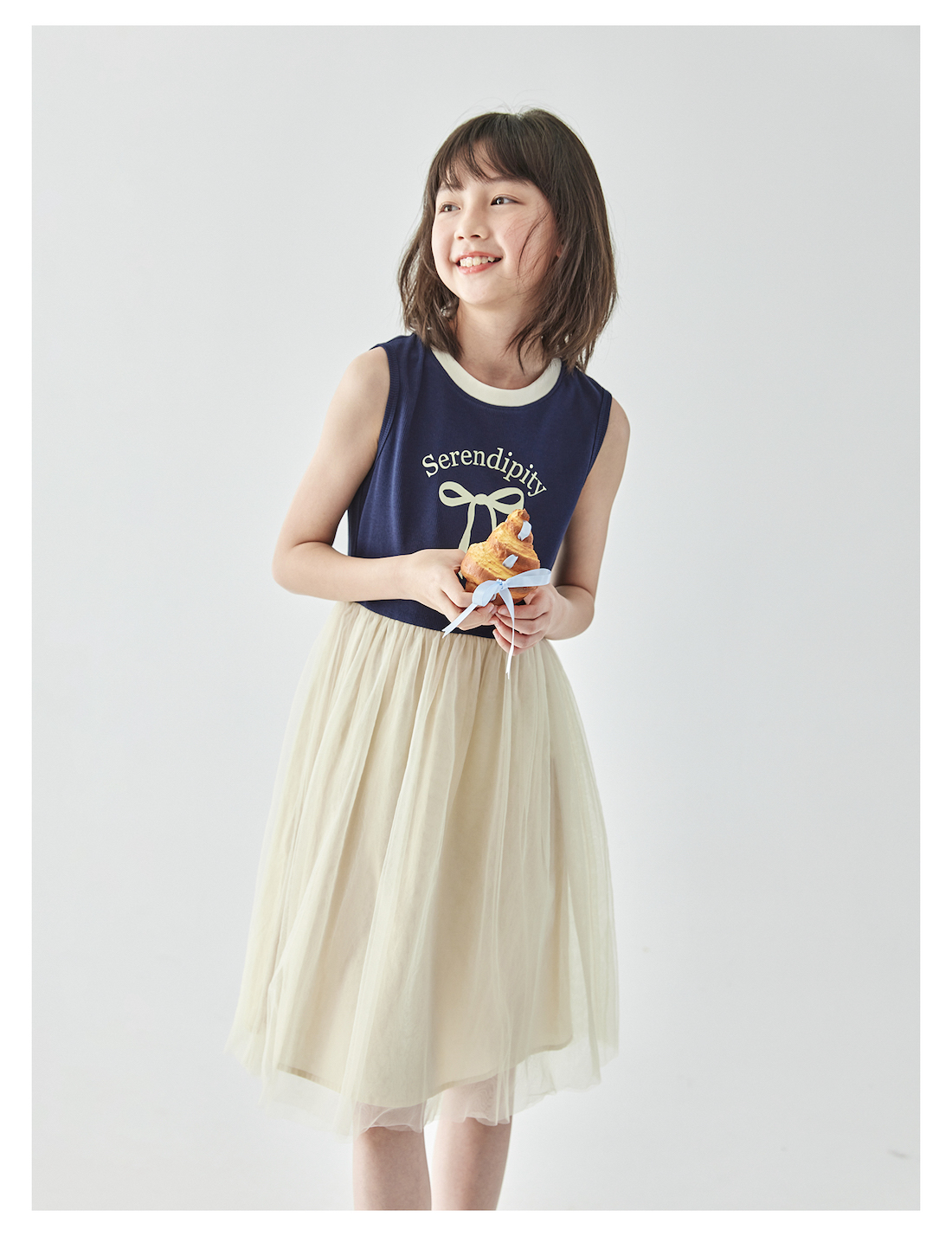 棵初2025年夏季新款拼纱针织背心连衣裙女童蝴蝶结印花无袖中长裙