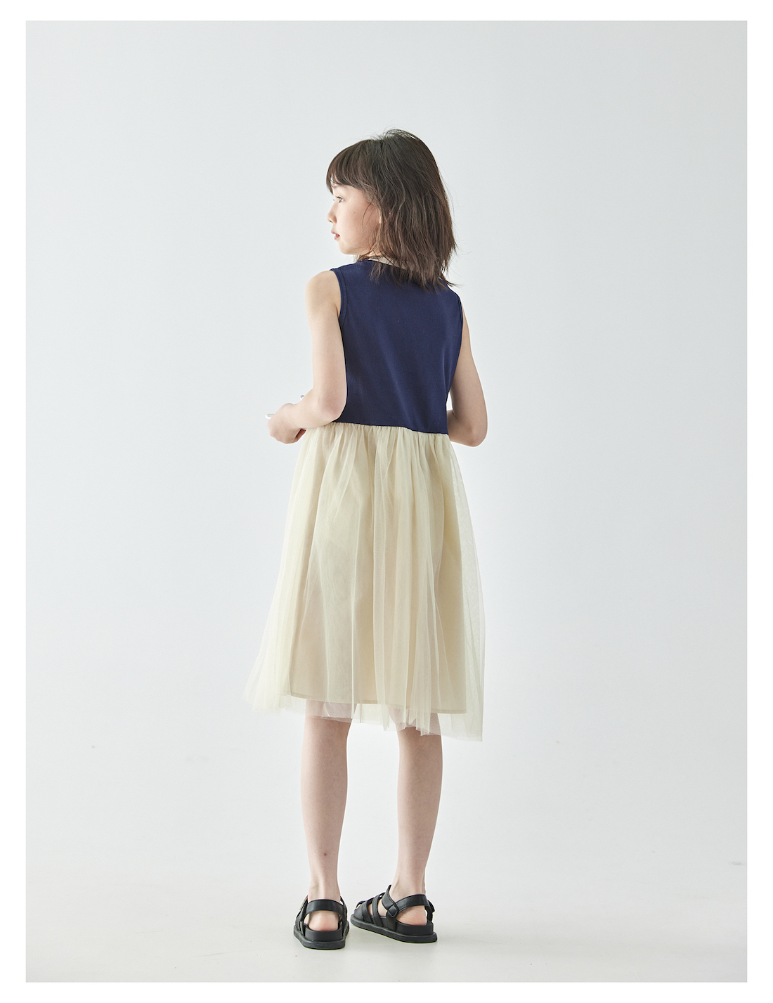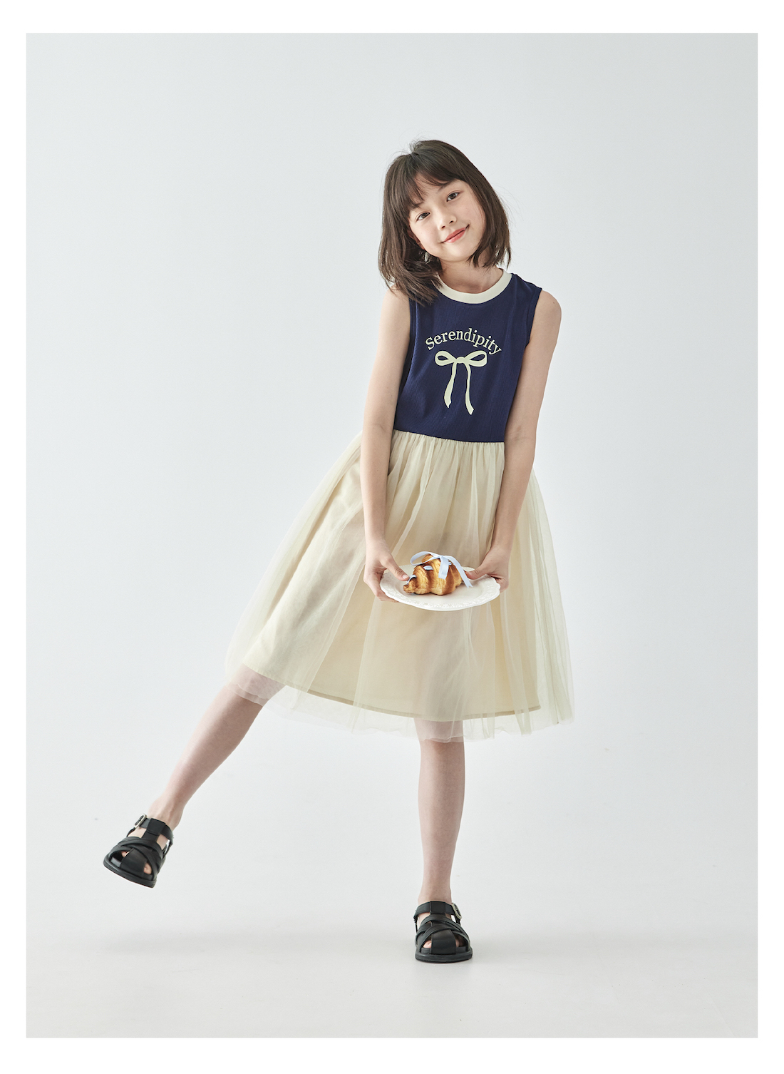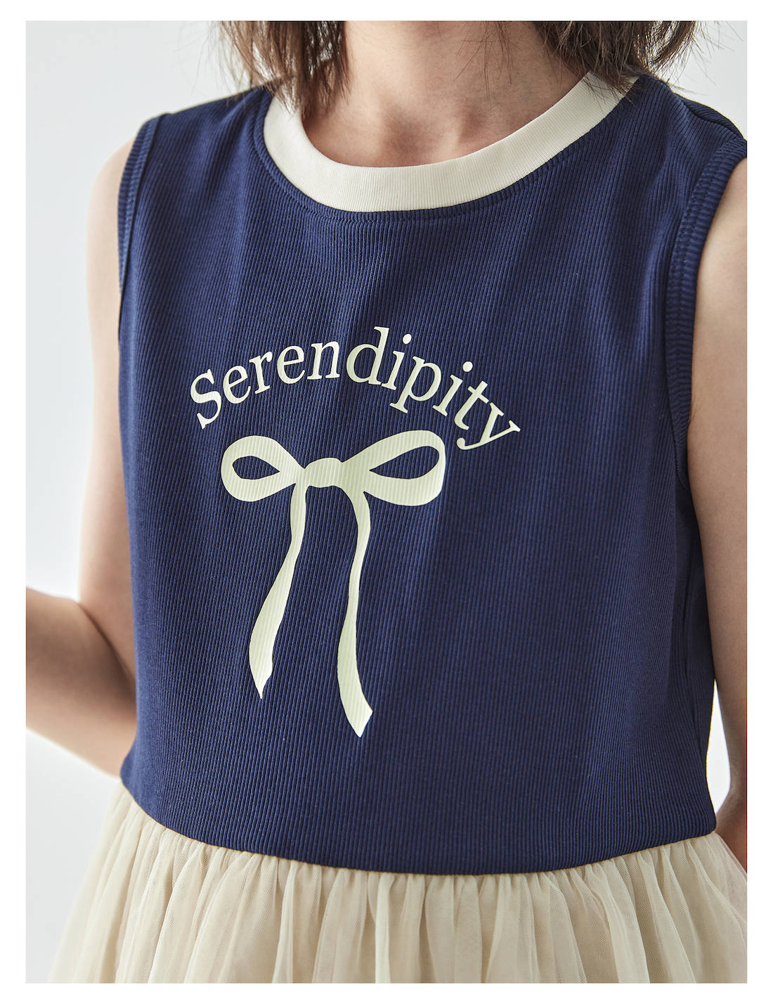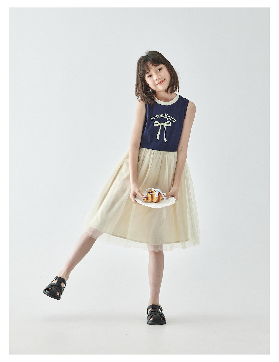 棵初2025年夏季新款拼纱针织背心连衣裙女童蝴蝶结印花无袖中长裙