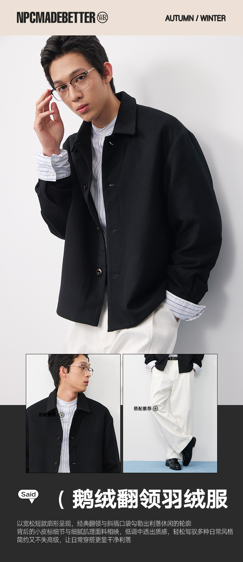 NPC潮牌90鹅绒绵羊毛混纺二合一轻薄羽绒服男秋上新翻领NP57DJ47