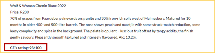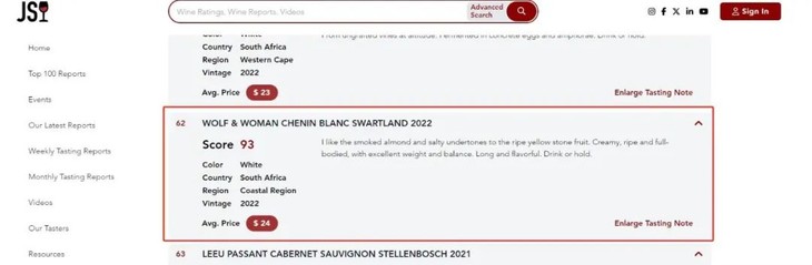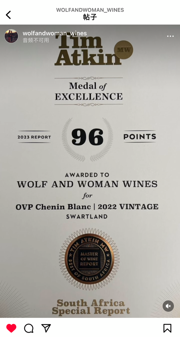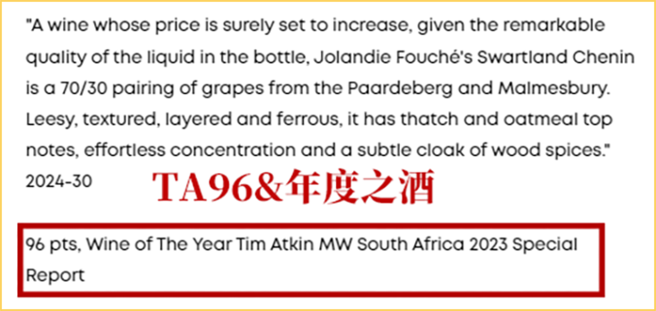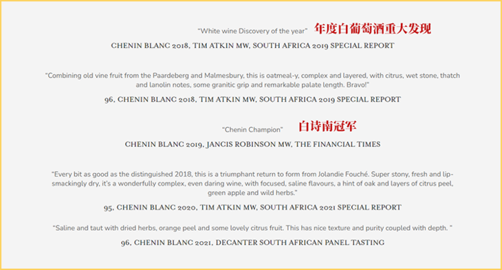 Jancis Robinson誉为“白诗南的冠军”,并入选James Suckling 南非百大酒款;