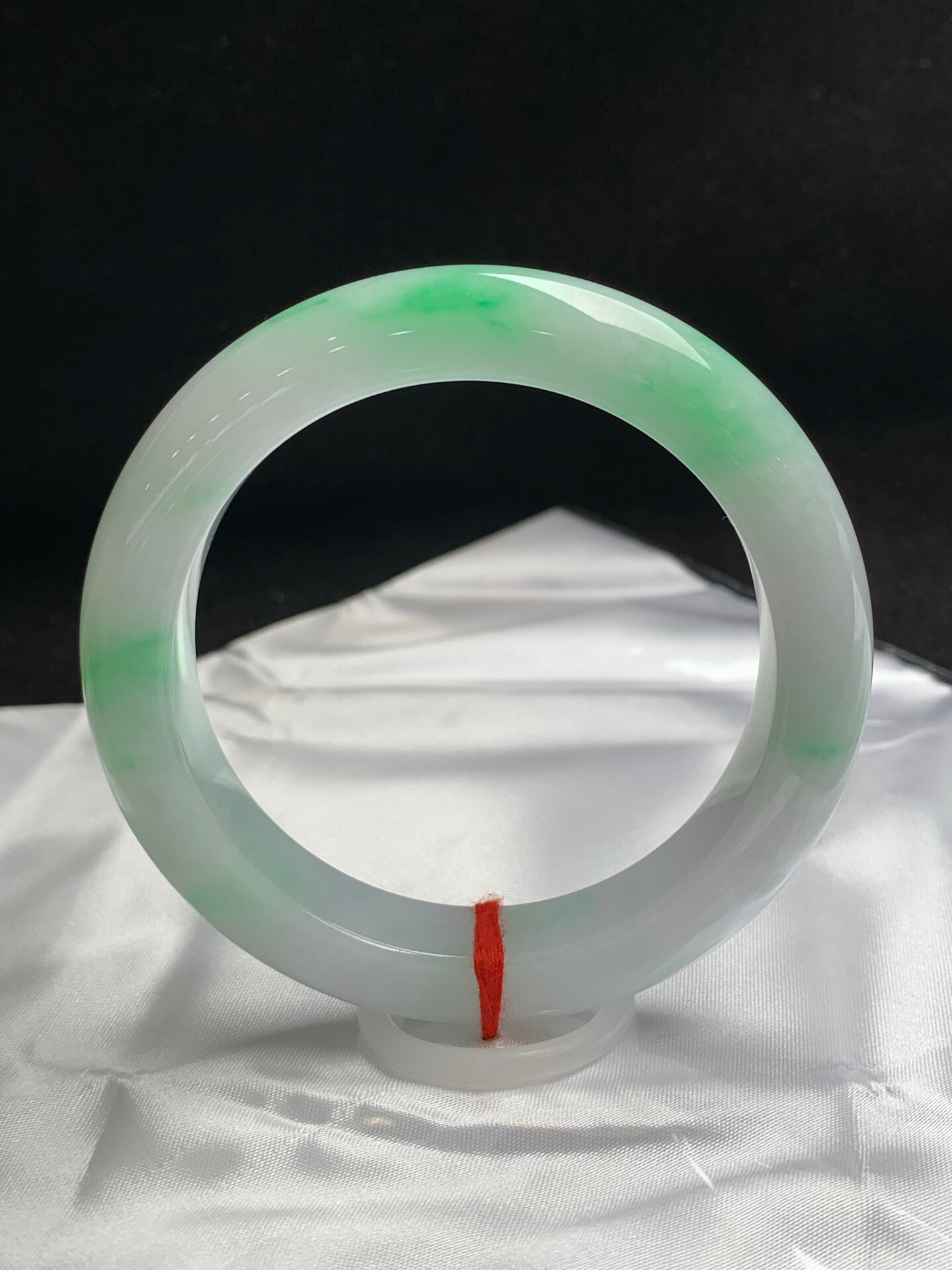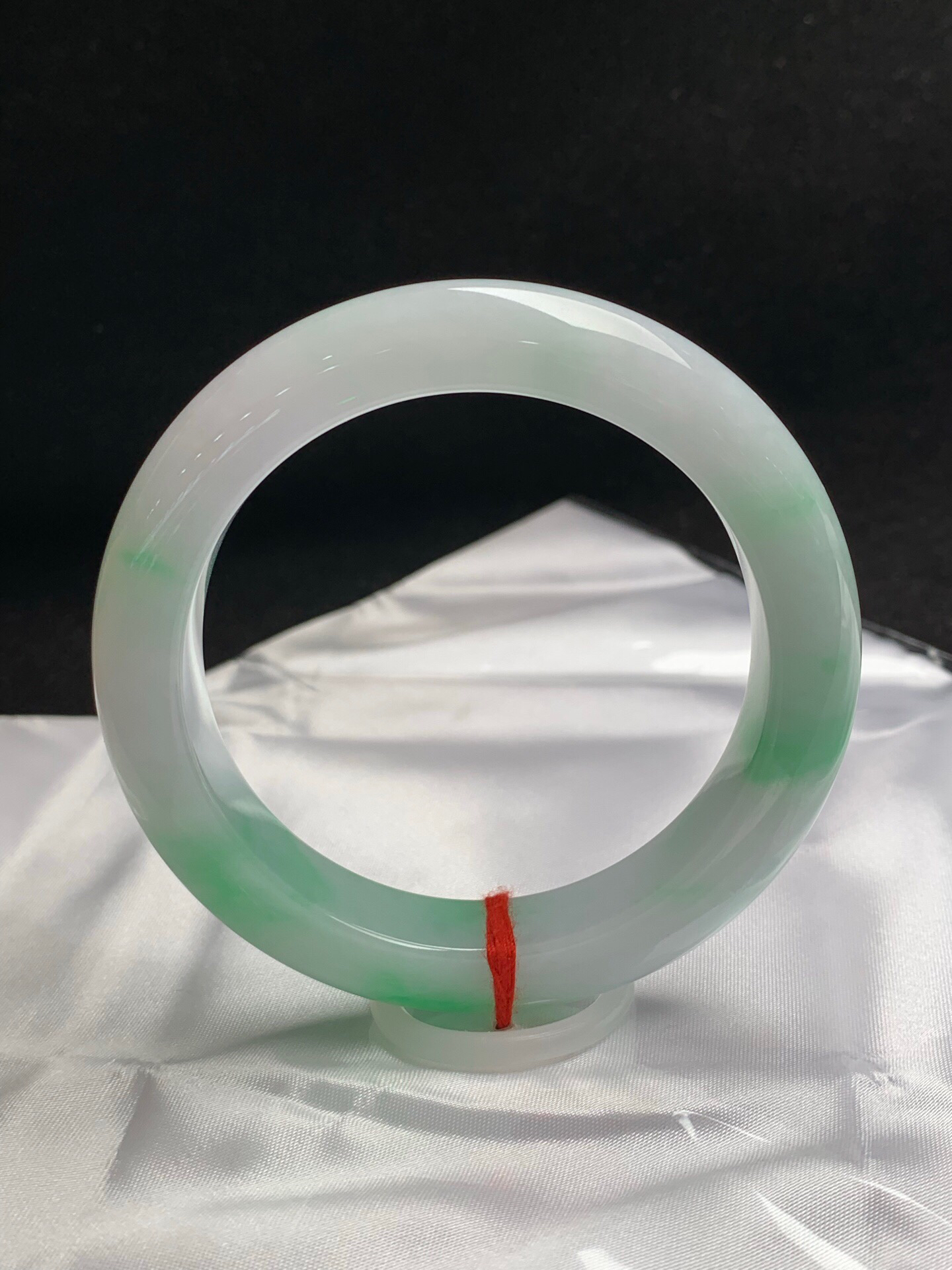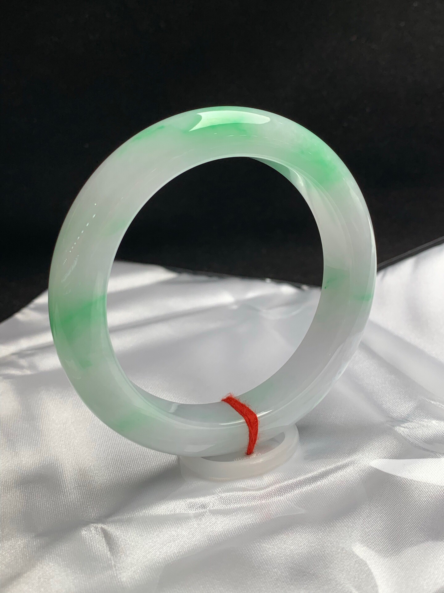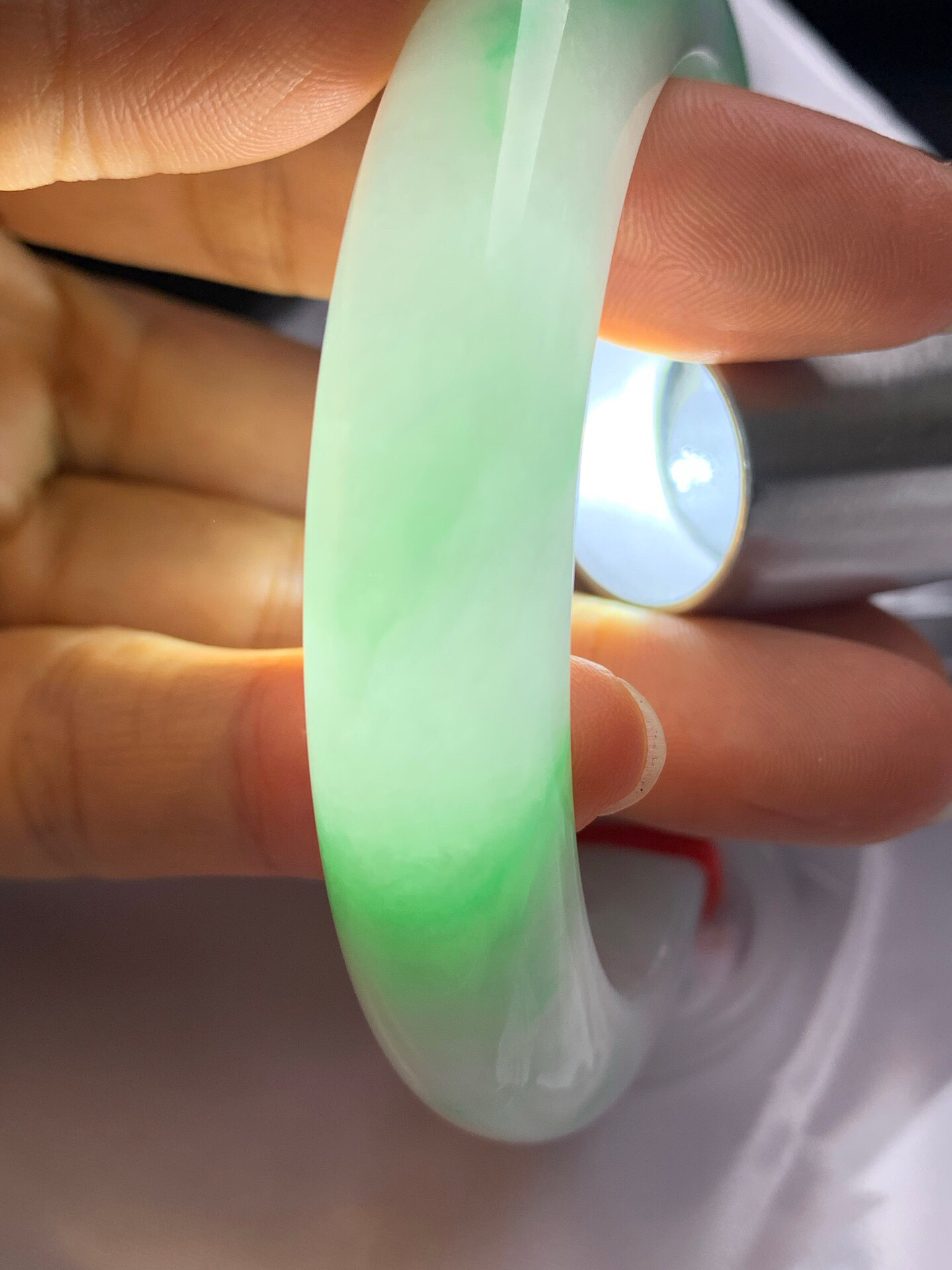 620123,59圈口,飘绿正圈平安镯,白底飘阳绿花,细腻有水,打灯有晶体纹,肉眼完美,尺寸:59-13-10.4,超值价💰56000 #优石客珠宝#香玉荟萃