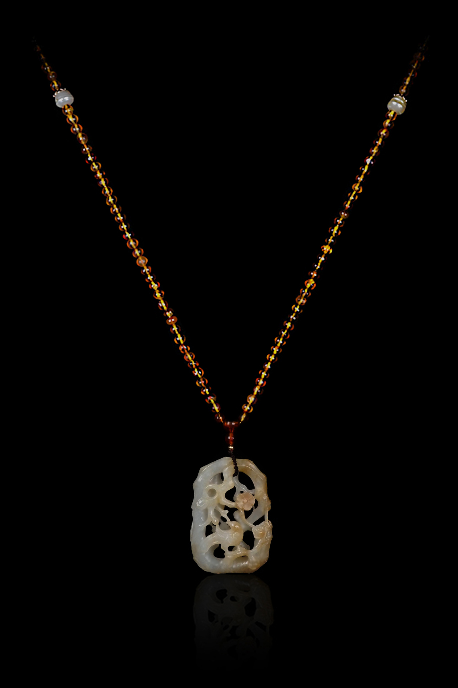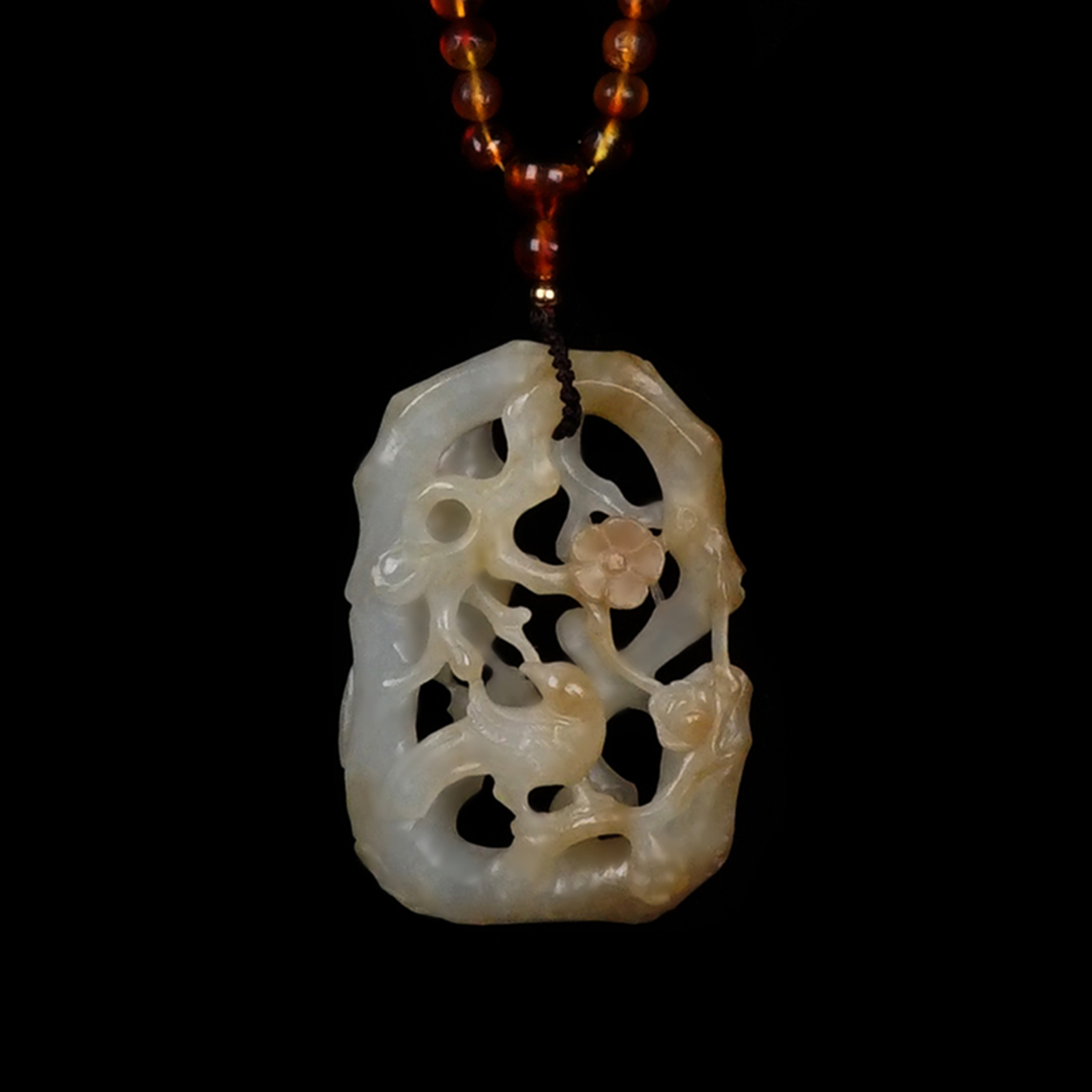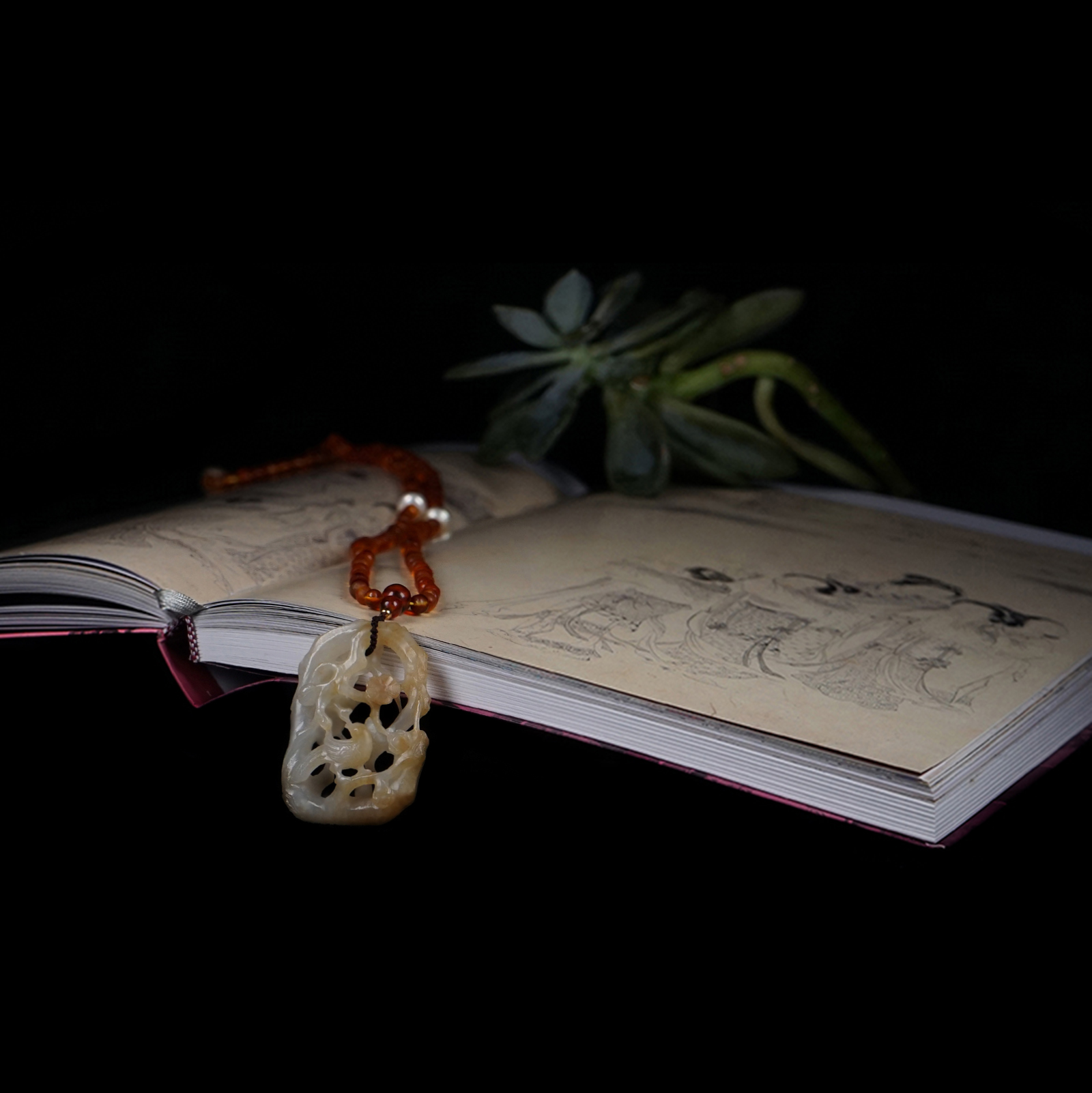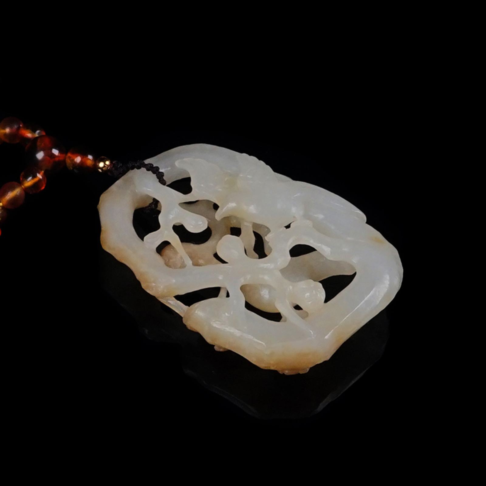 一款双面工,玉质洁白温润,带有漂亮的皮色,镂空巧雕的喜鹊登梅清代和田白玉。古代玉器,玉必有工,工必有意,意必吉祥。此款工艺精湛的玉饰,如一幅美好的图画,让人置身鸟语花香中,配饰上用了现在已经封矿不多见的抚顺琥珀珠,以老珍珠点缀,相得益彰。佩戴收藏俱佳。