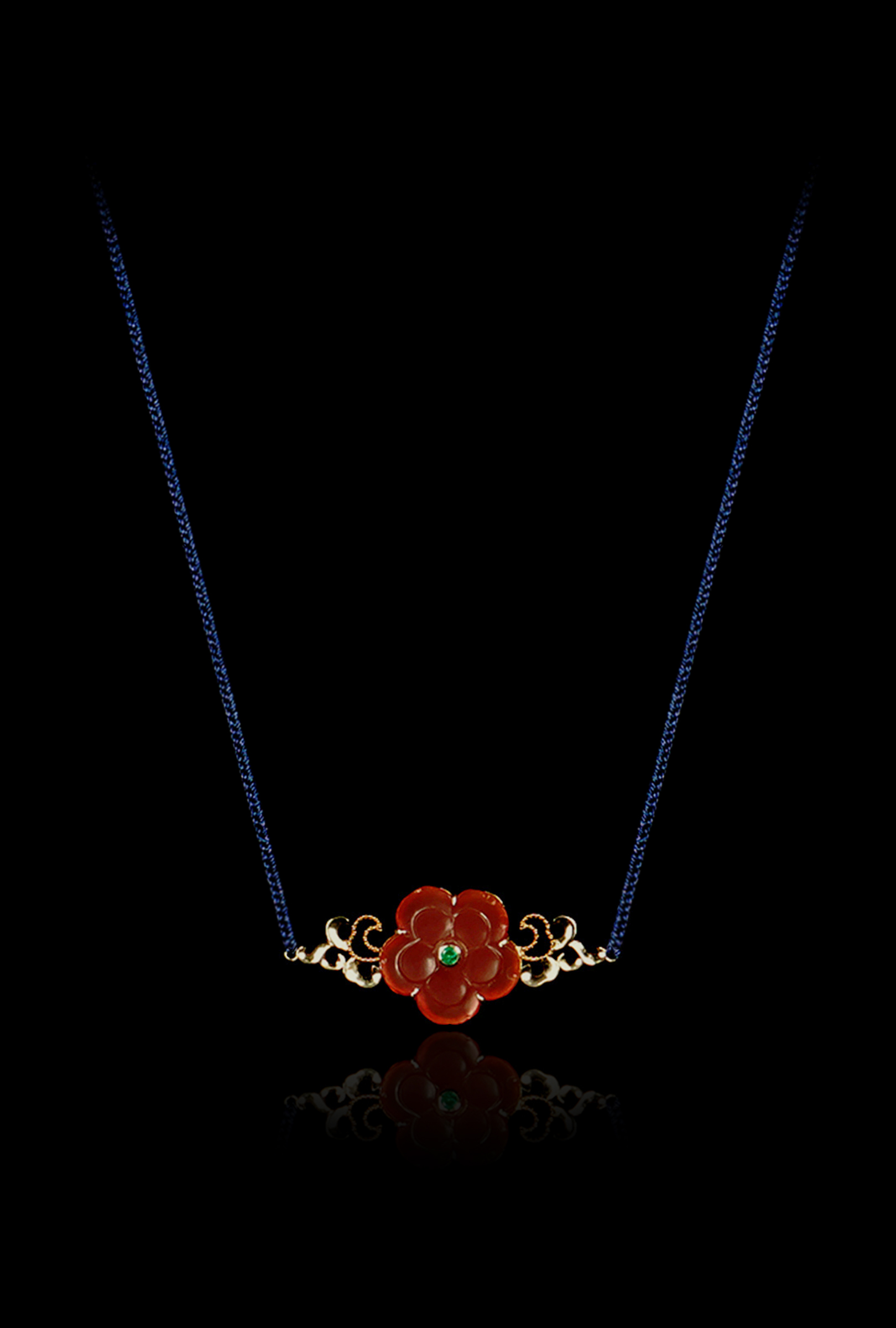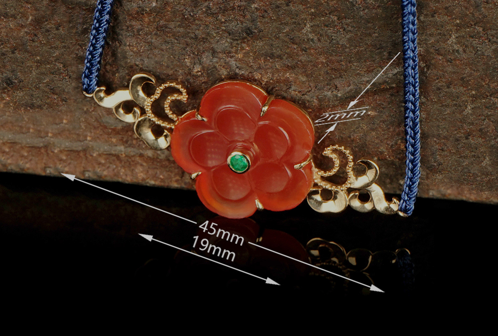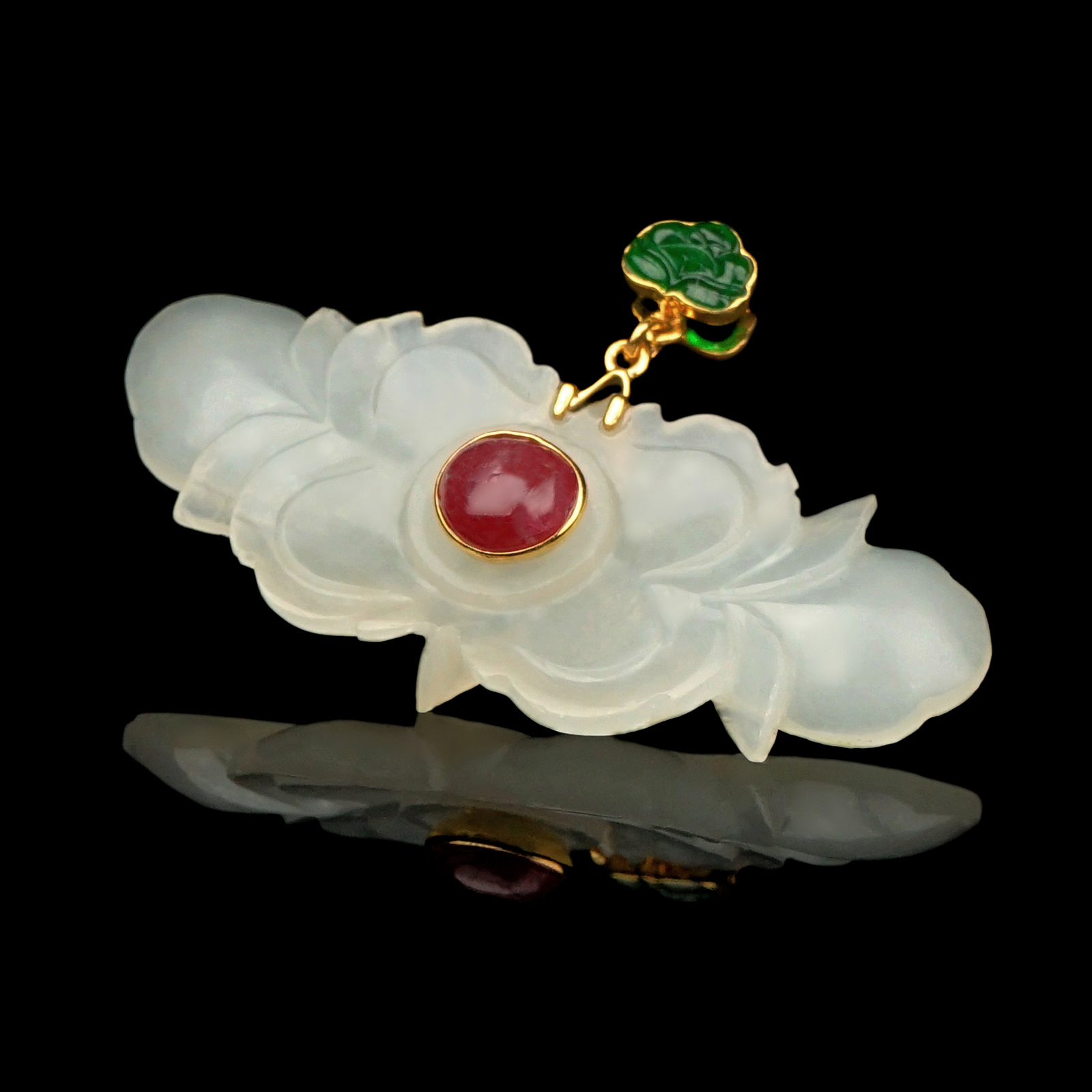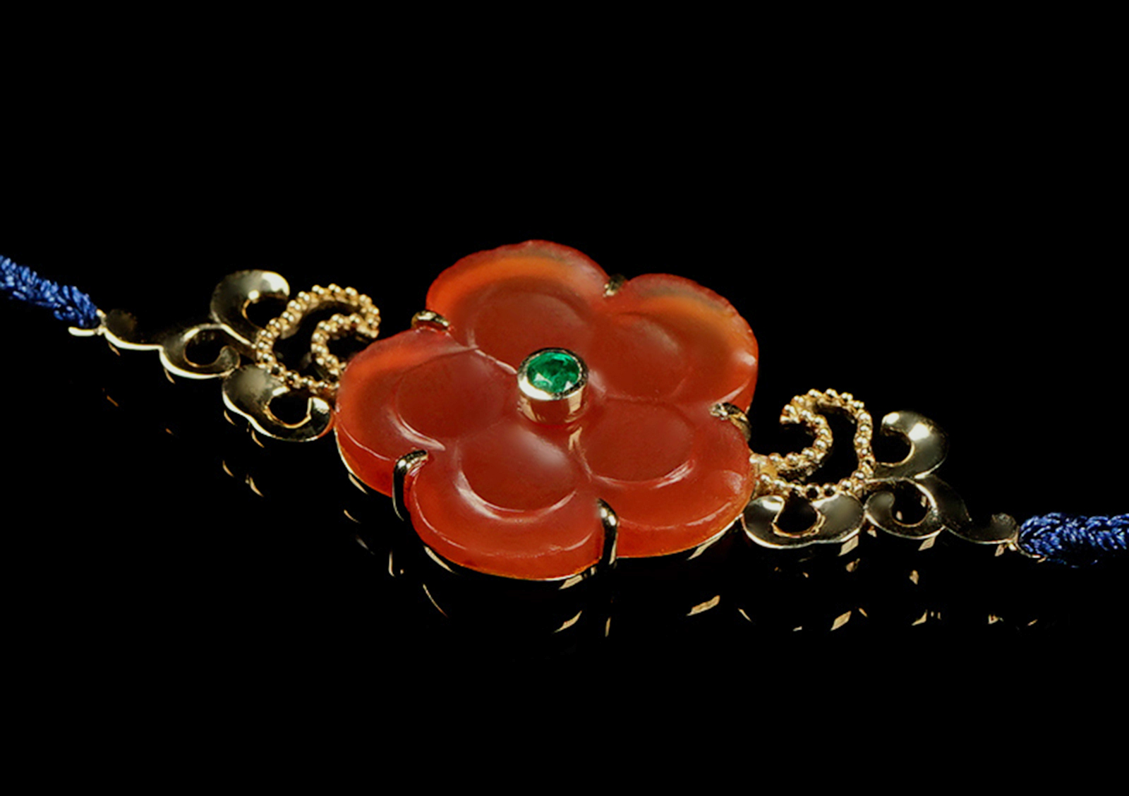这款老玛瑙花来自杭州吴山通宝城文物交流会。色泽红润艳丽,双层雕刻,花形优美。点缀水头上佳的翡翠,以18K金卷草纹修饰,更添秀丽之姿。