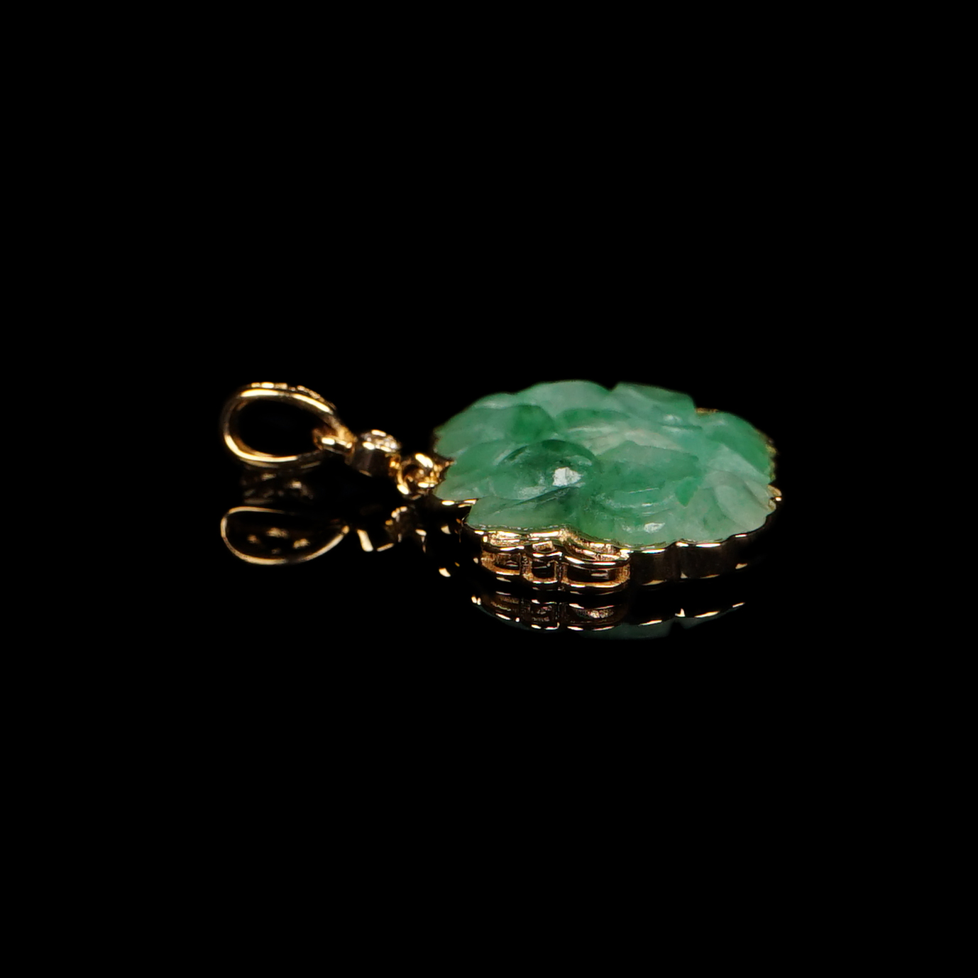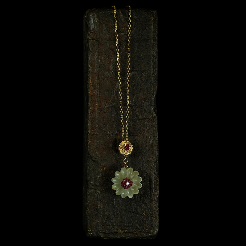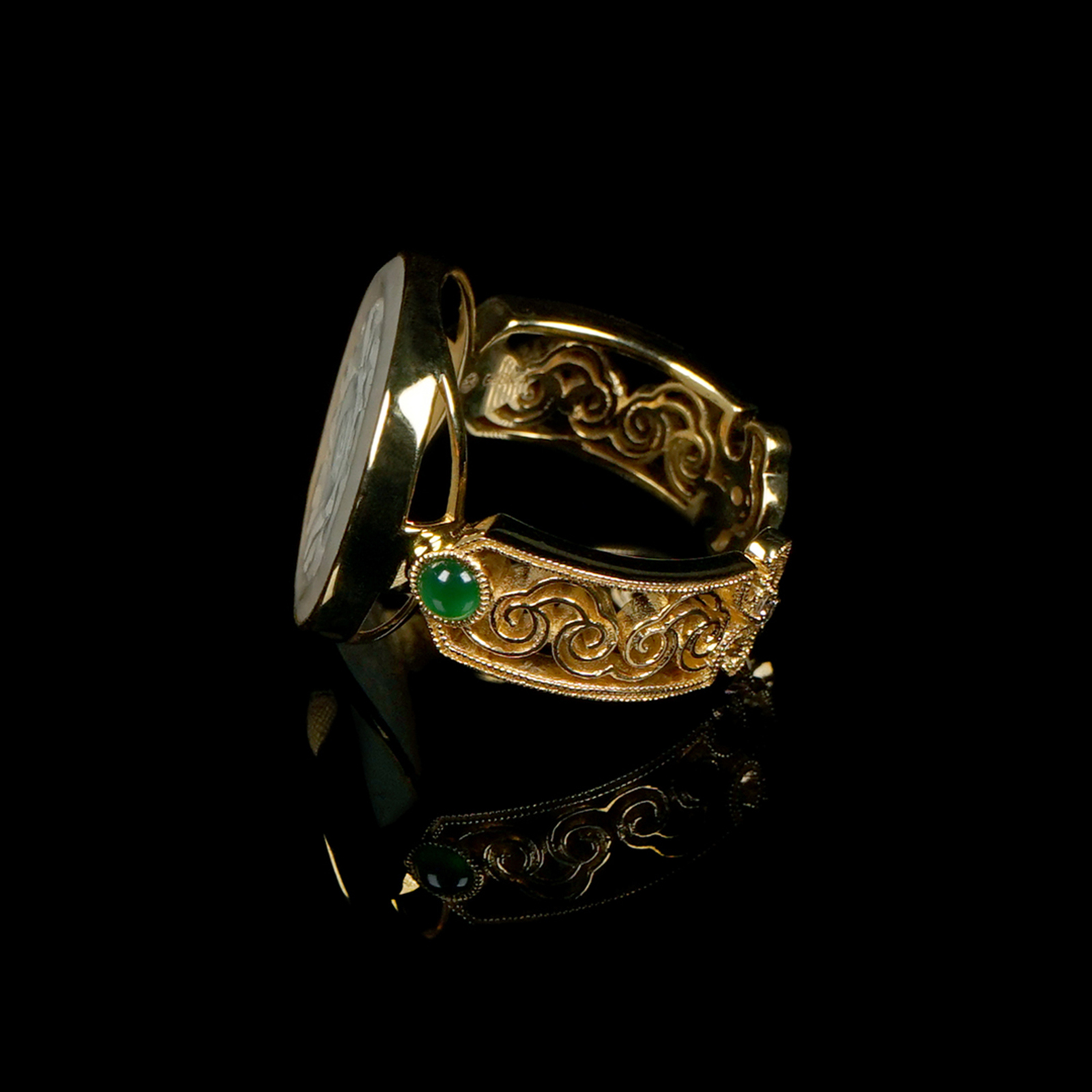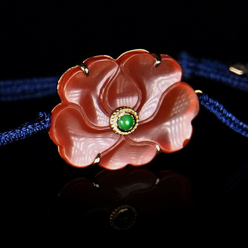 这款老玛瑙花来自杭州吴山通宝城文物交流会。色泽红润艳丽,双层雕刻,花形优美。点缀水头上佳的翡翠,以18K金卷草纹修饰,更添秀丽之姿。