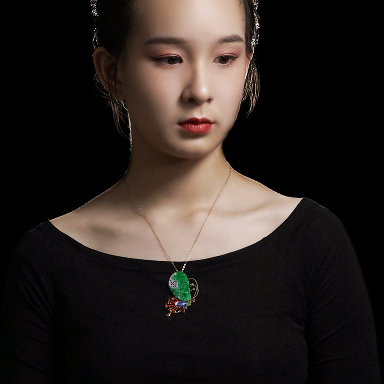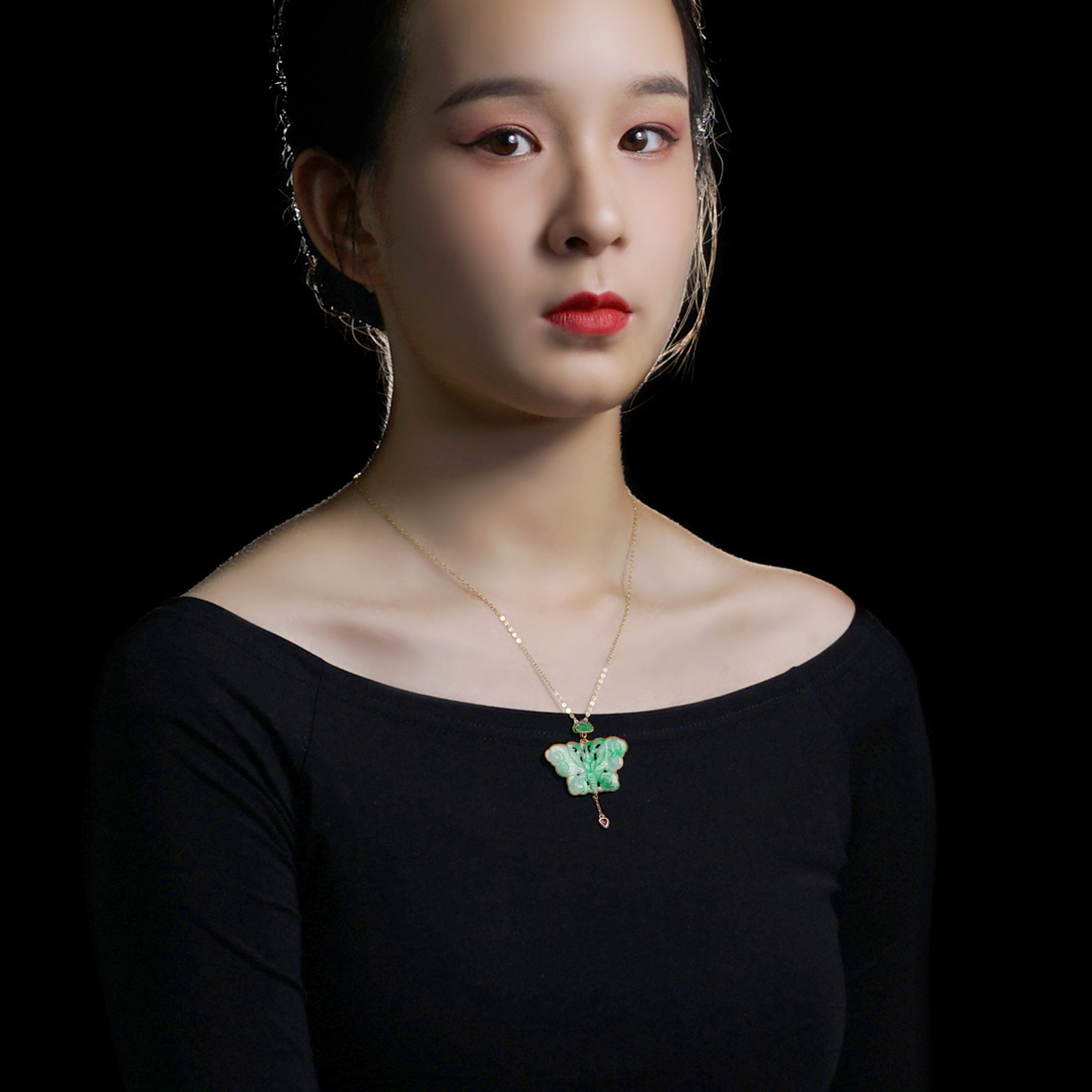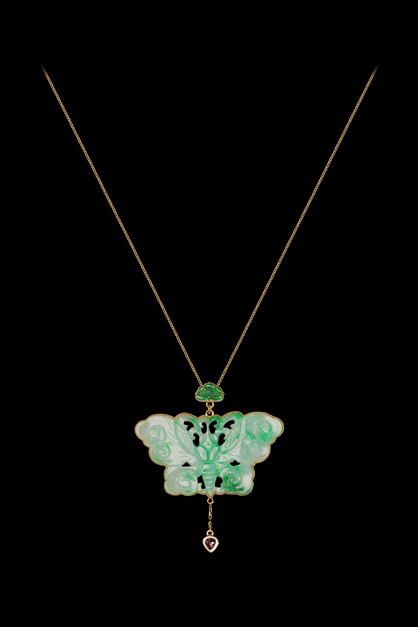 这款清代翡翠蝴蝶项饰,色泽翠绿,身姿秀美,恋花的蝴蝶常被用于寓意甜美的爱情和美满的婚姻,自古以来备受大家的喜爱,被称为“会飞的花朵”。