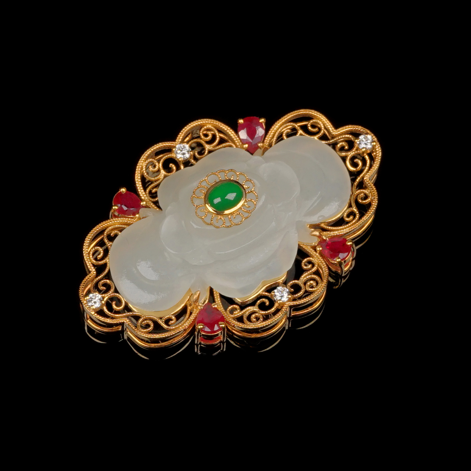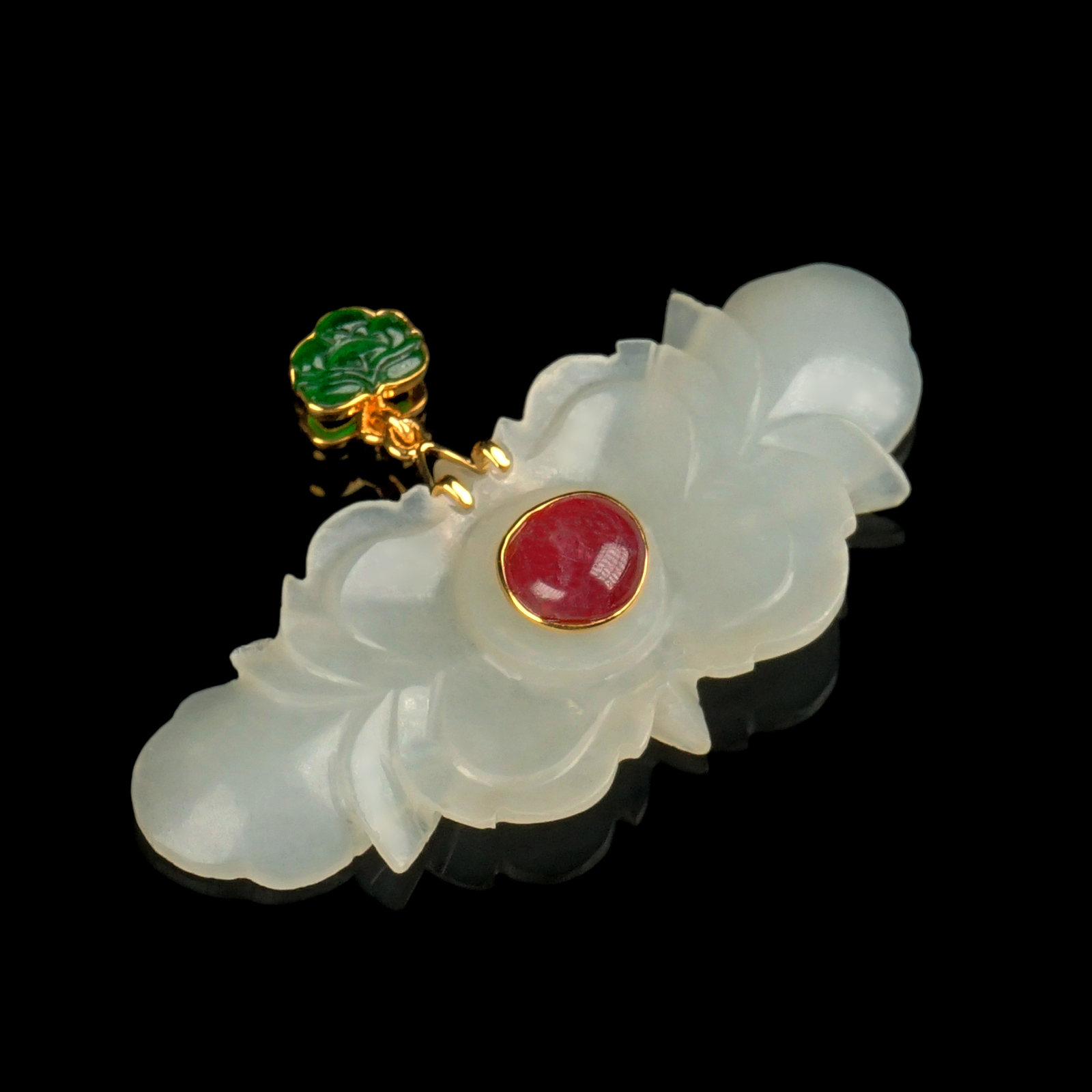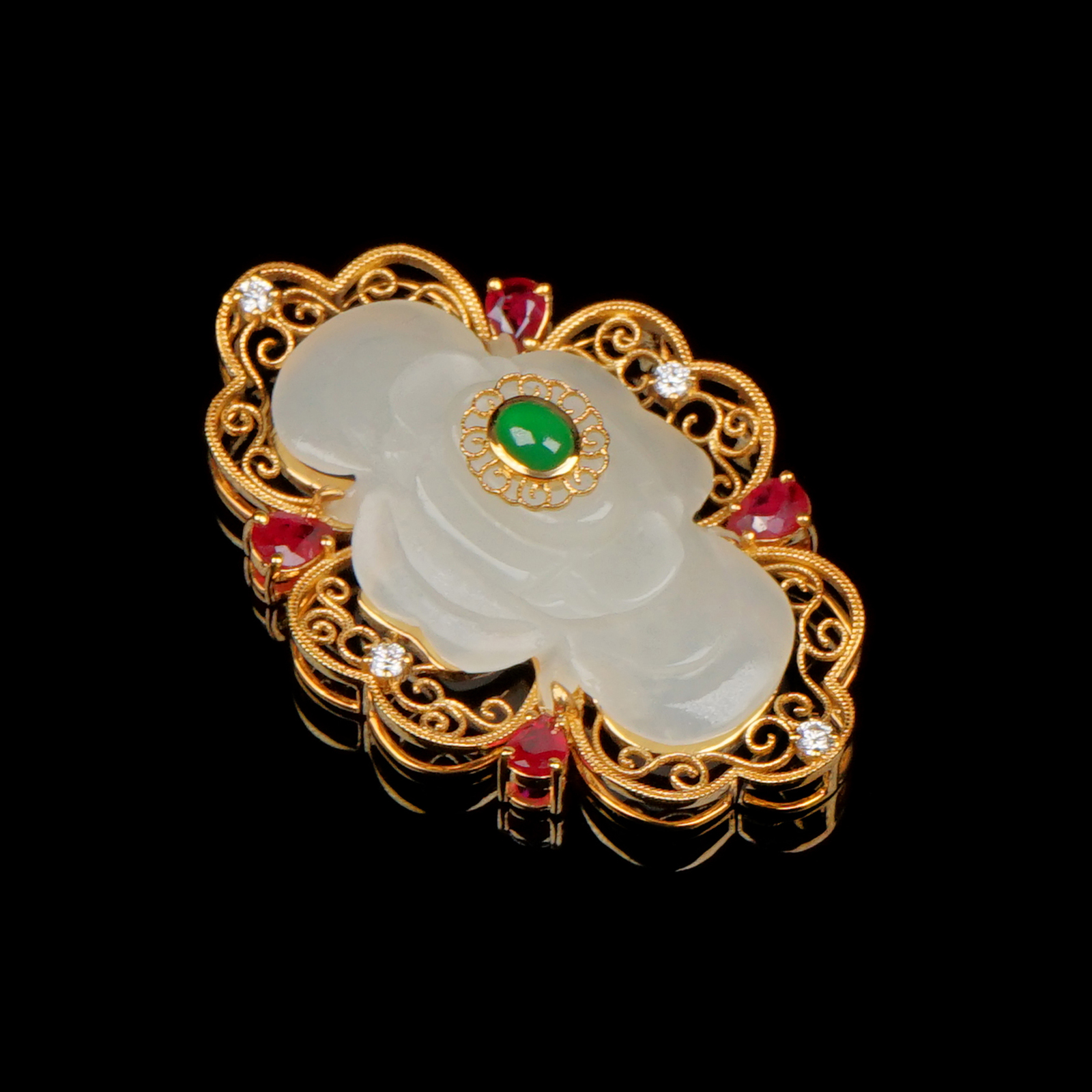 【材质】和田白玉 翡翠 红宝 钻石 18K金