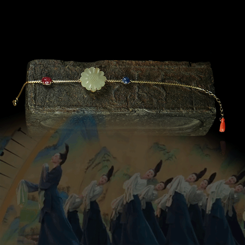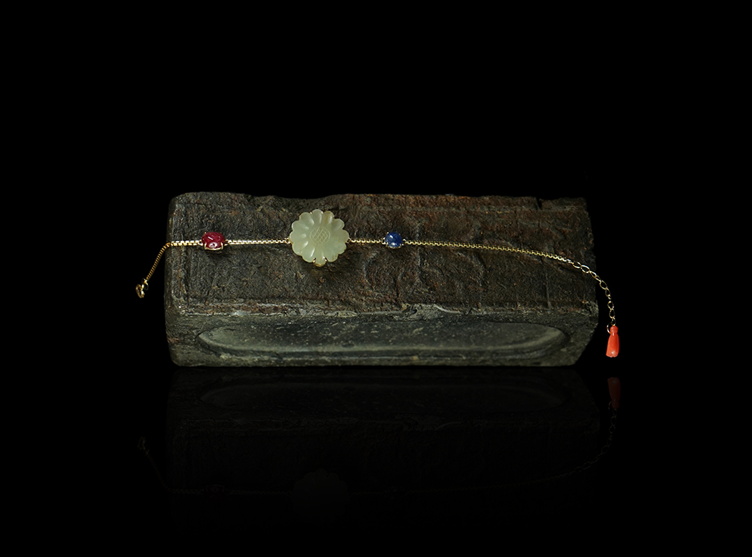 一款明代和田白玉帽镇设计成的手链。此款和田白玉玉质细腻,打洼工艺精湛,虽小犹精。缀以老红蓝宝,古朴中见雅致。