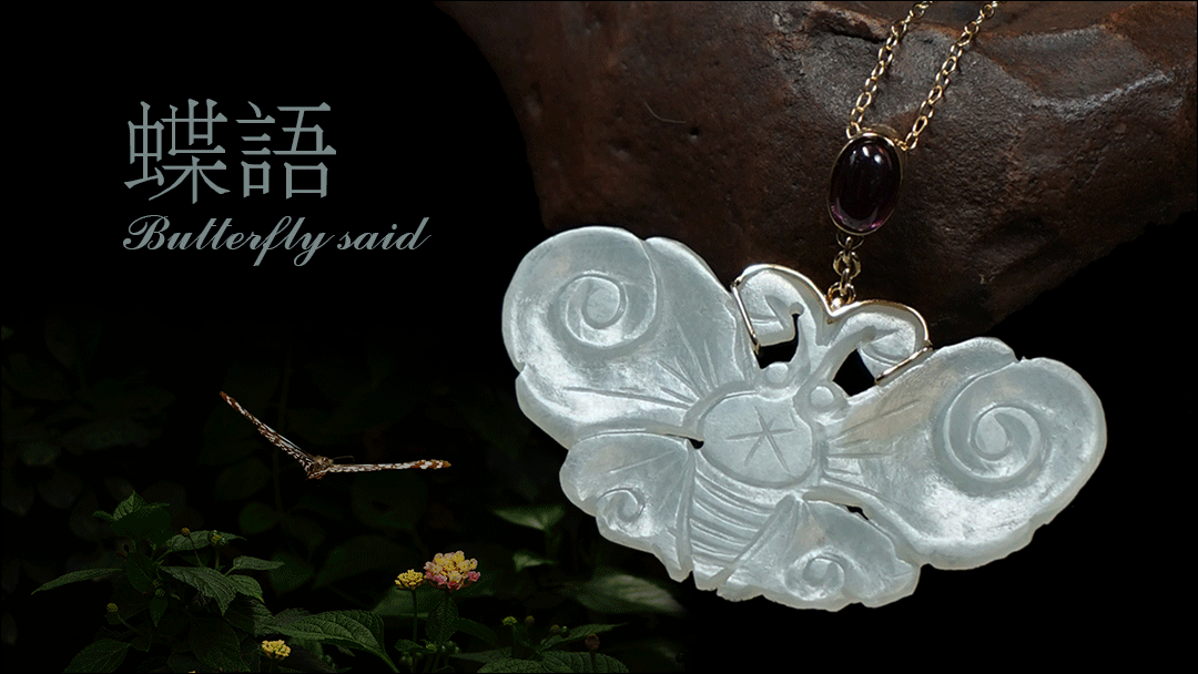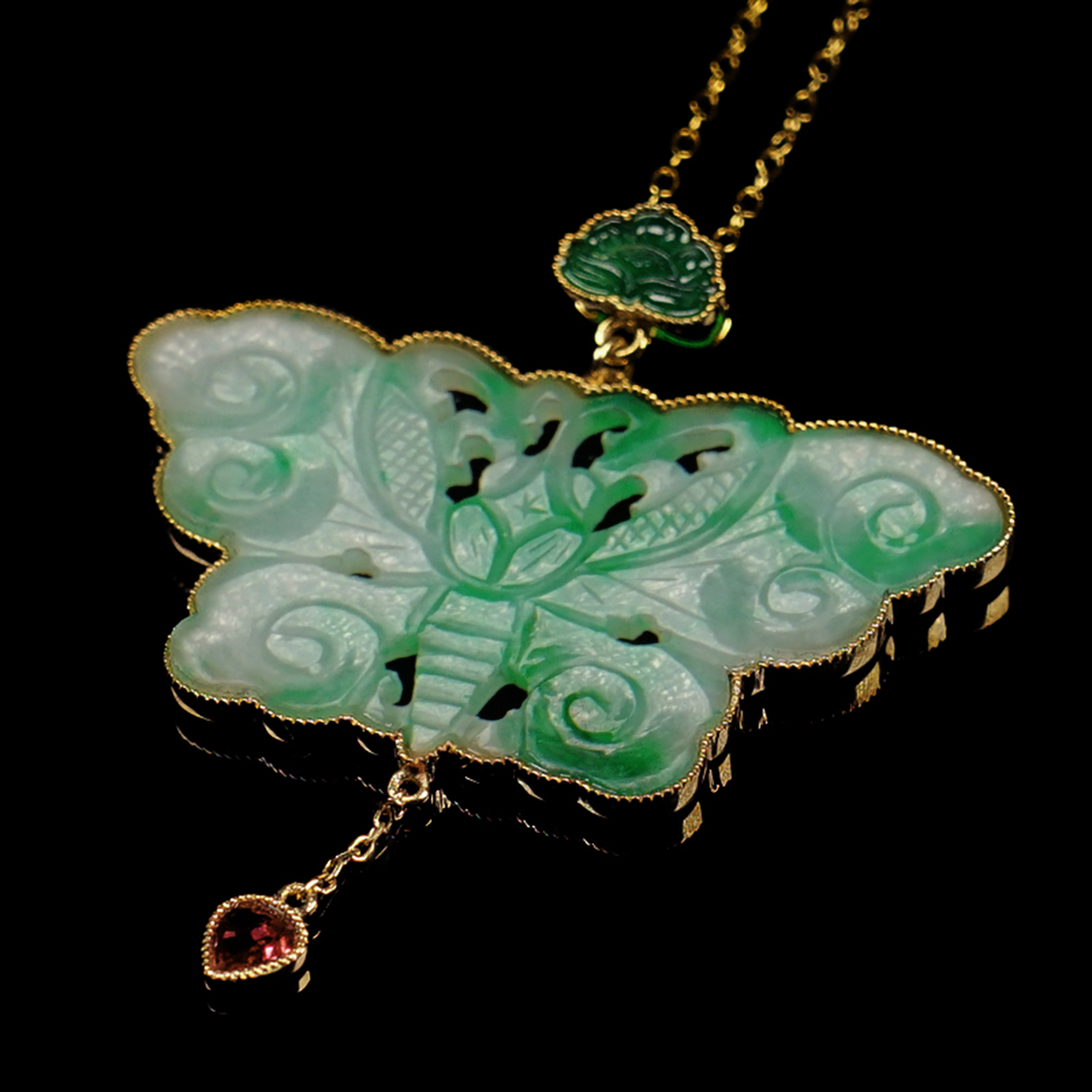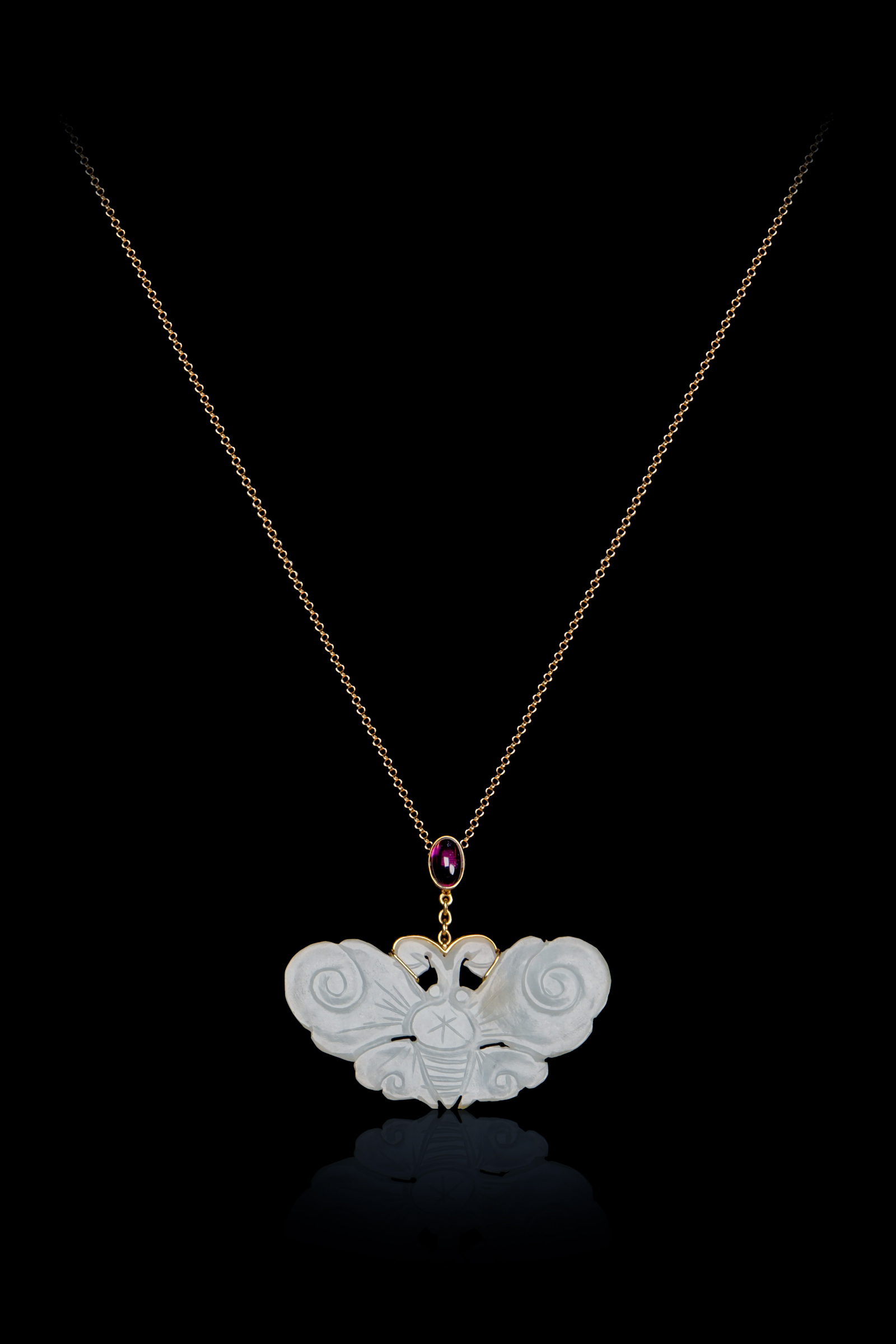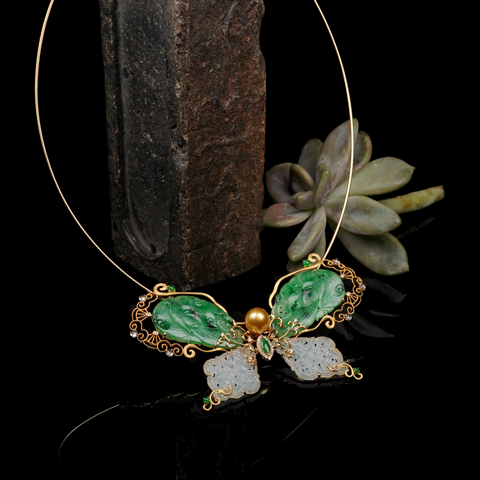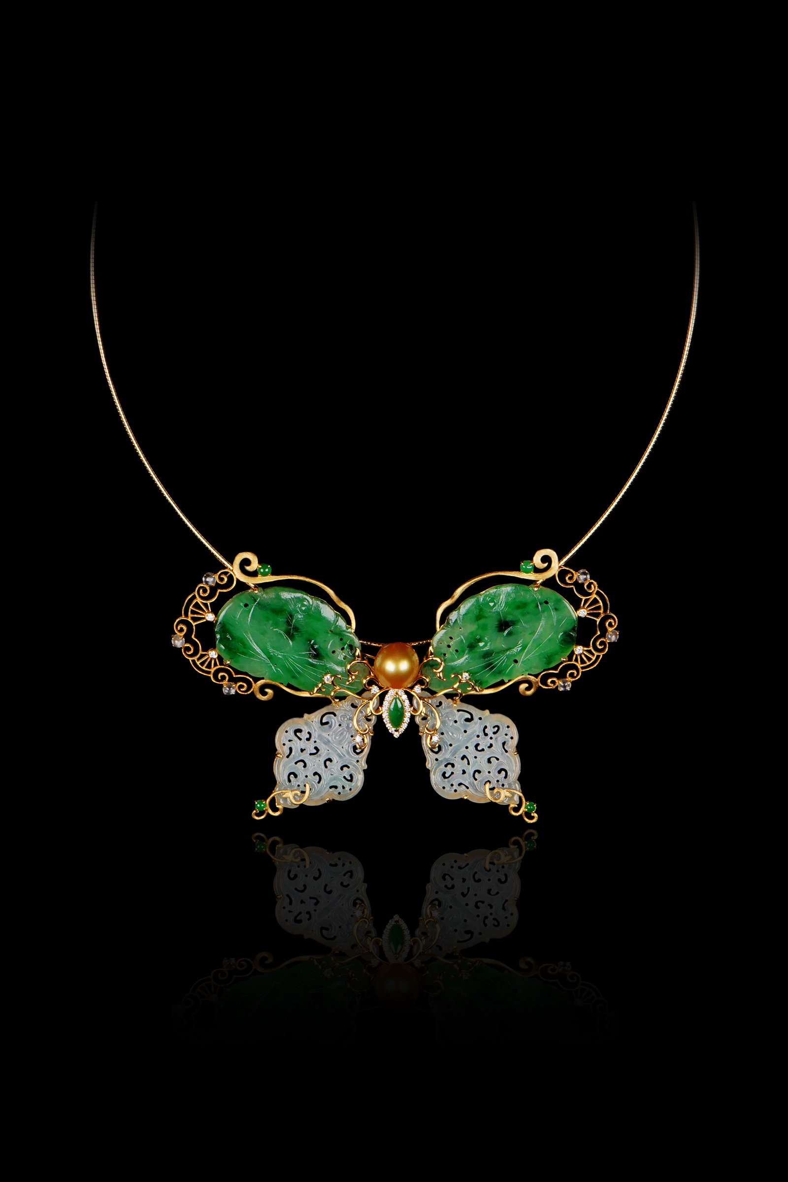 一款清代和田白玉蝴蝶。这种形制的白玉蝴蝶在民间非常的受欢迎,秀丽多姿,在设计上运用14K金线编织,新颖别致,是翩翩于项间的一抹亮丽风景。