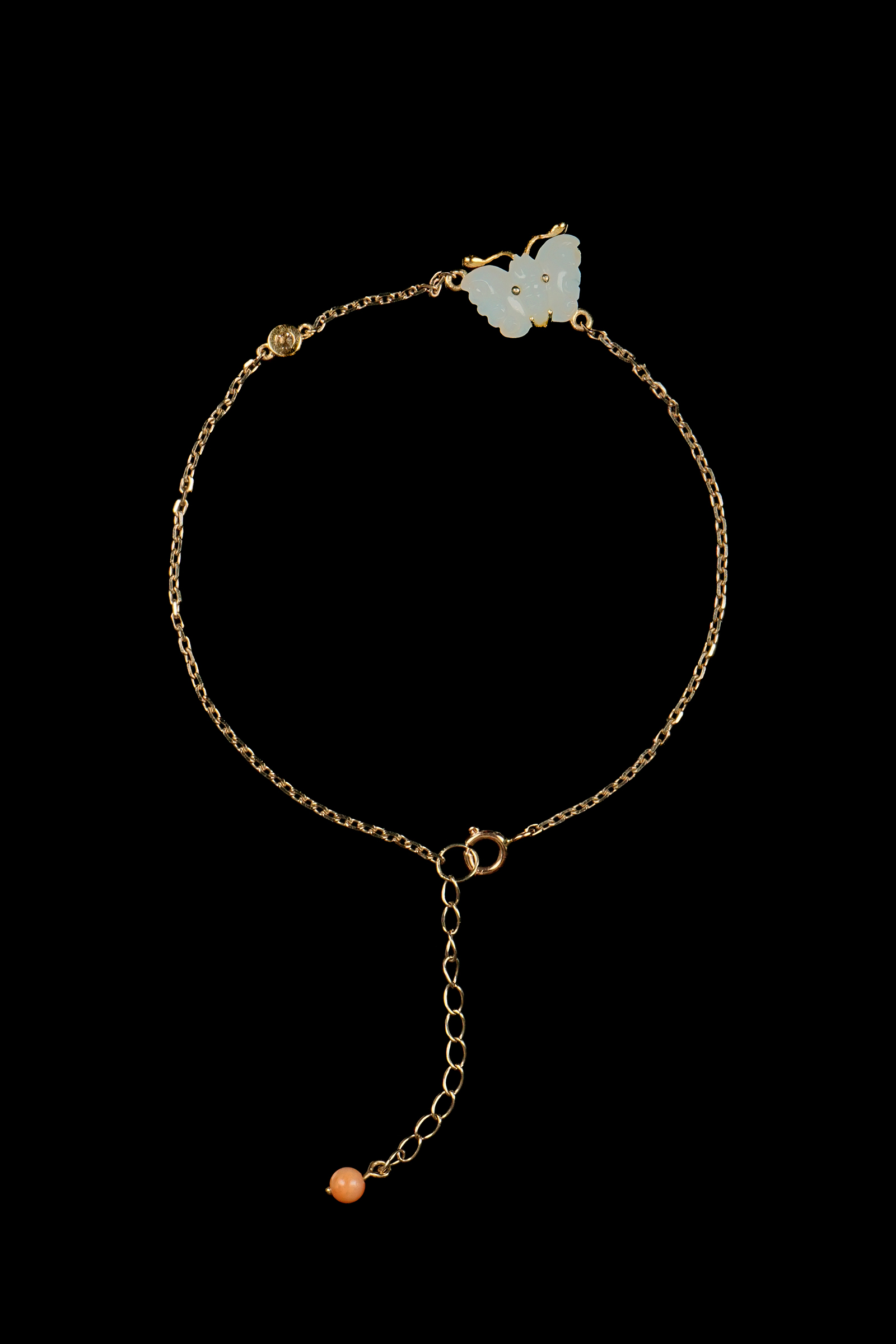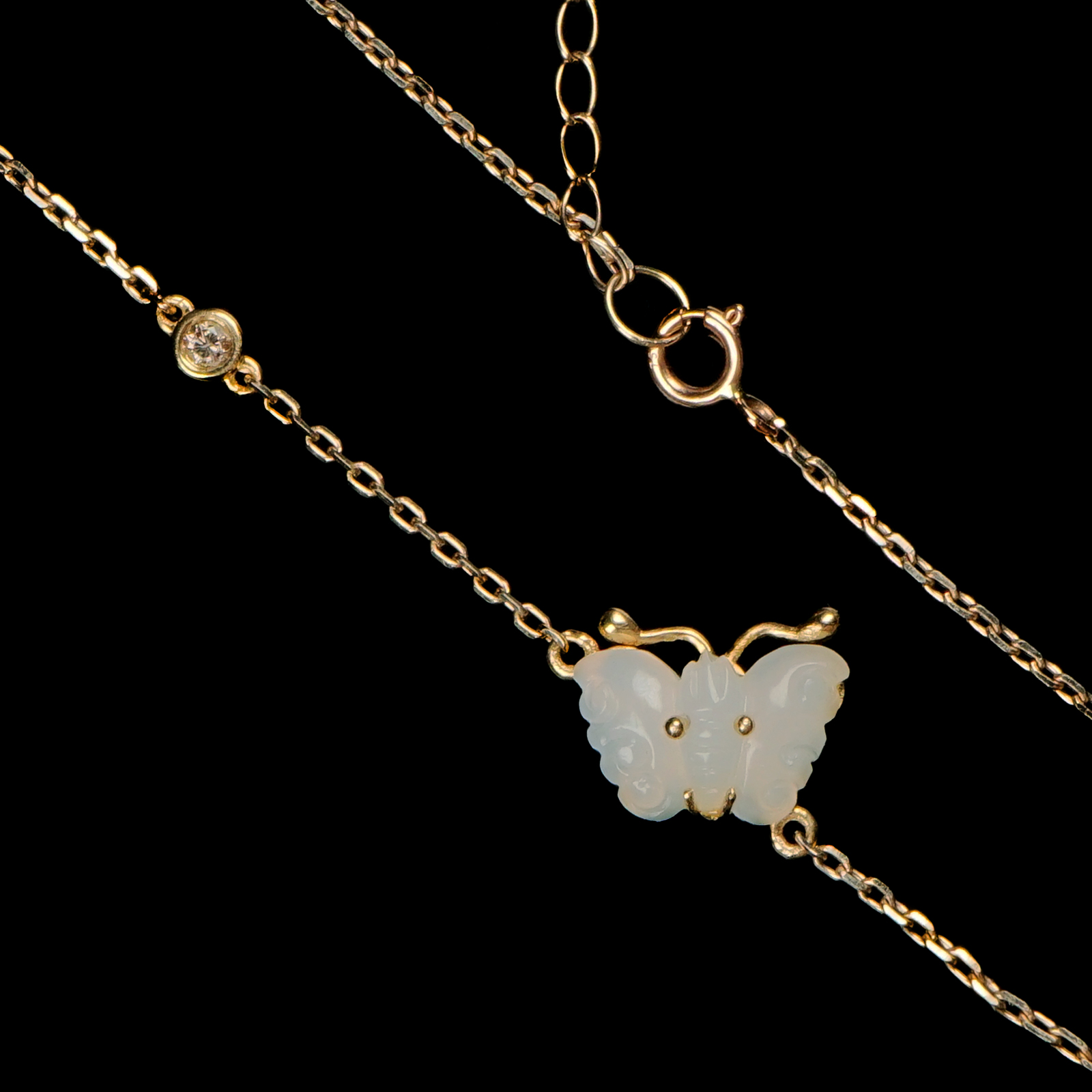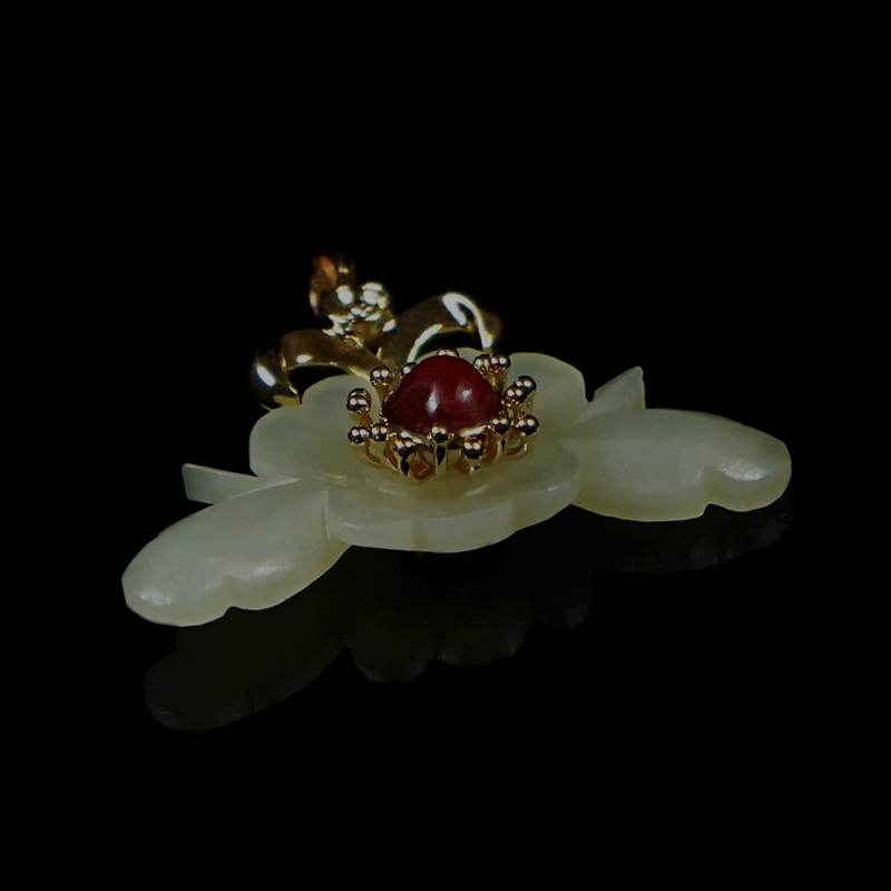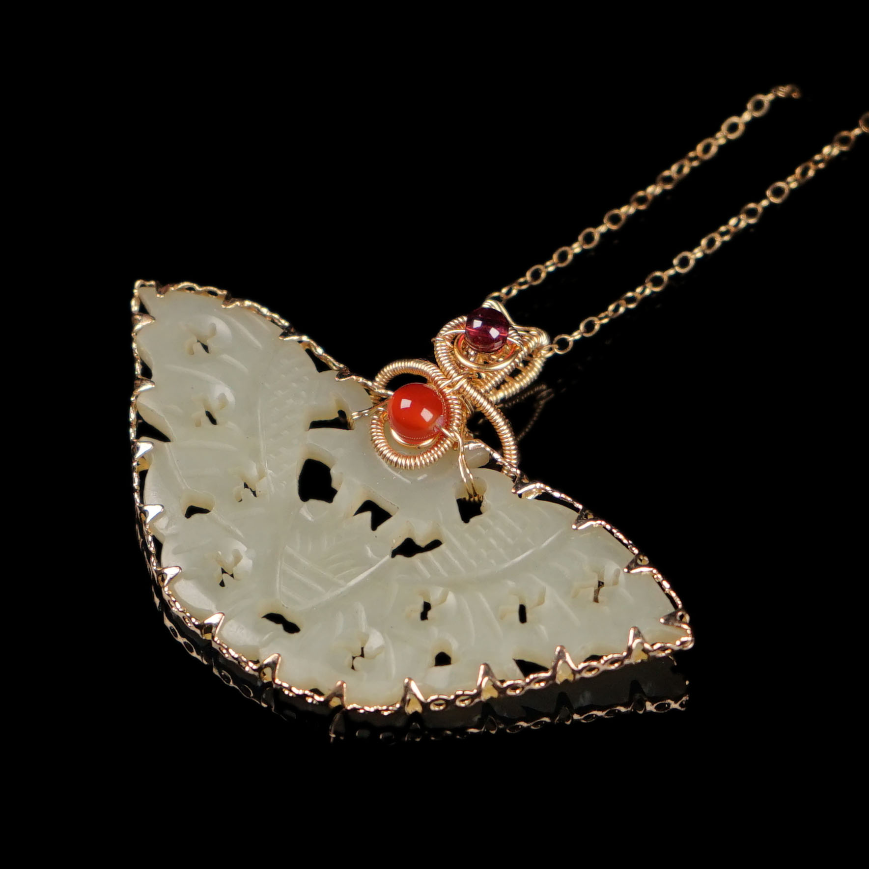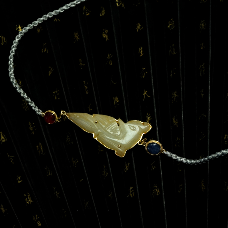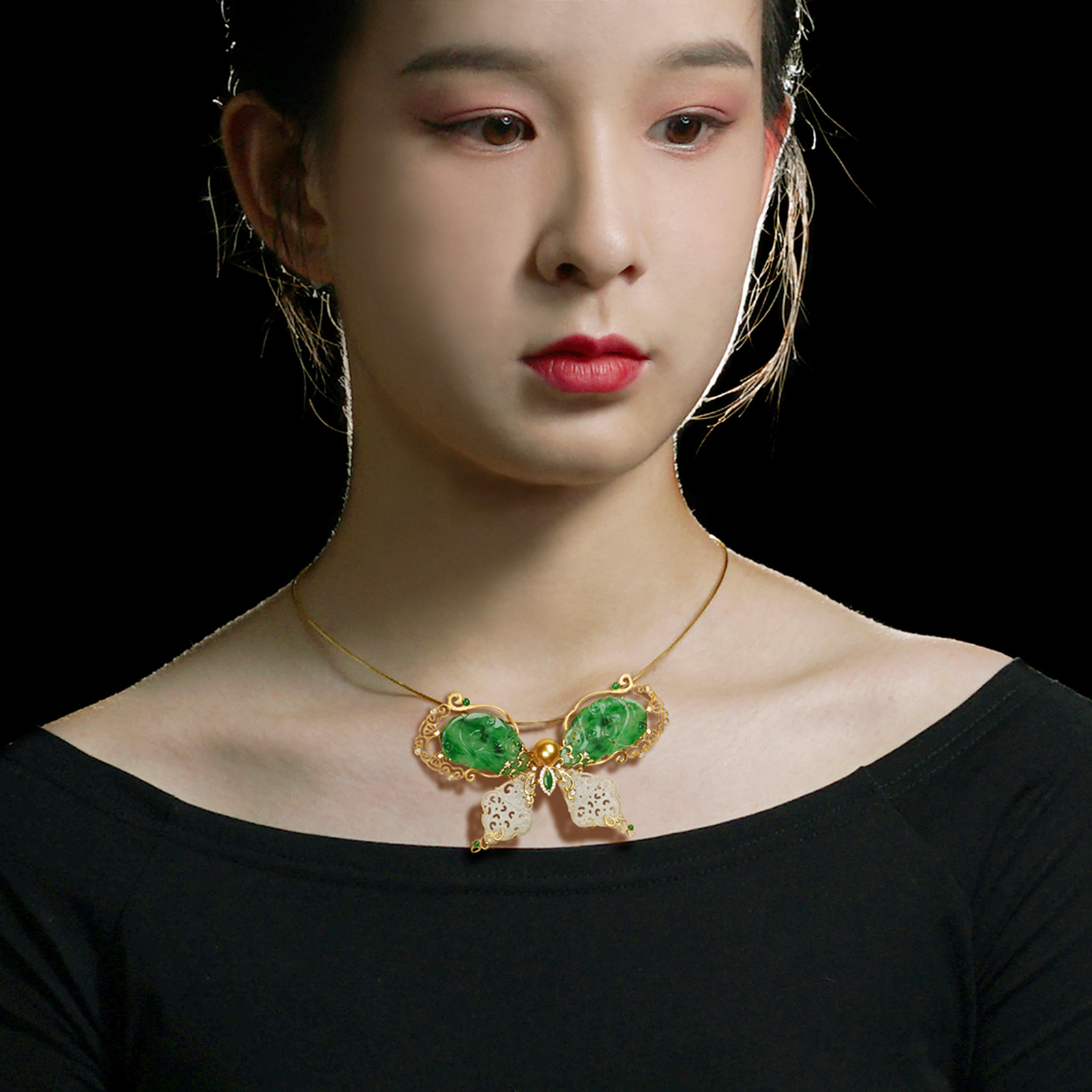 一款清代和田白玉蝴蝶。这种形制的白玉蝴蝶在民间非常的受欢迎,秀丽多姿,在设计上运用14K金线编织,新颖别致,是翩翩于项间的一抹亮丽风景。