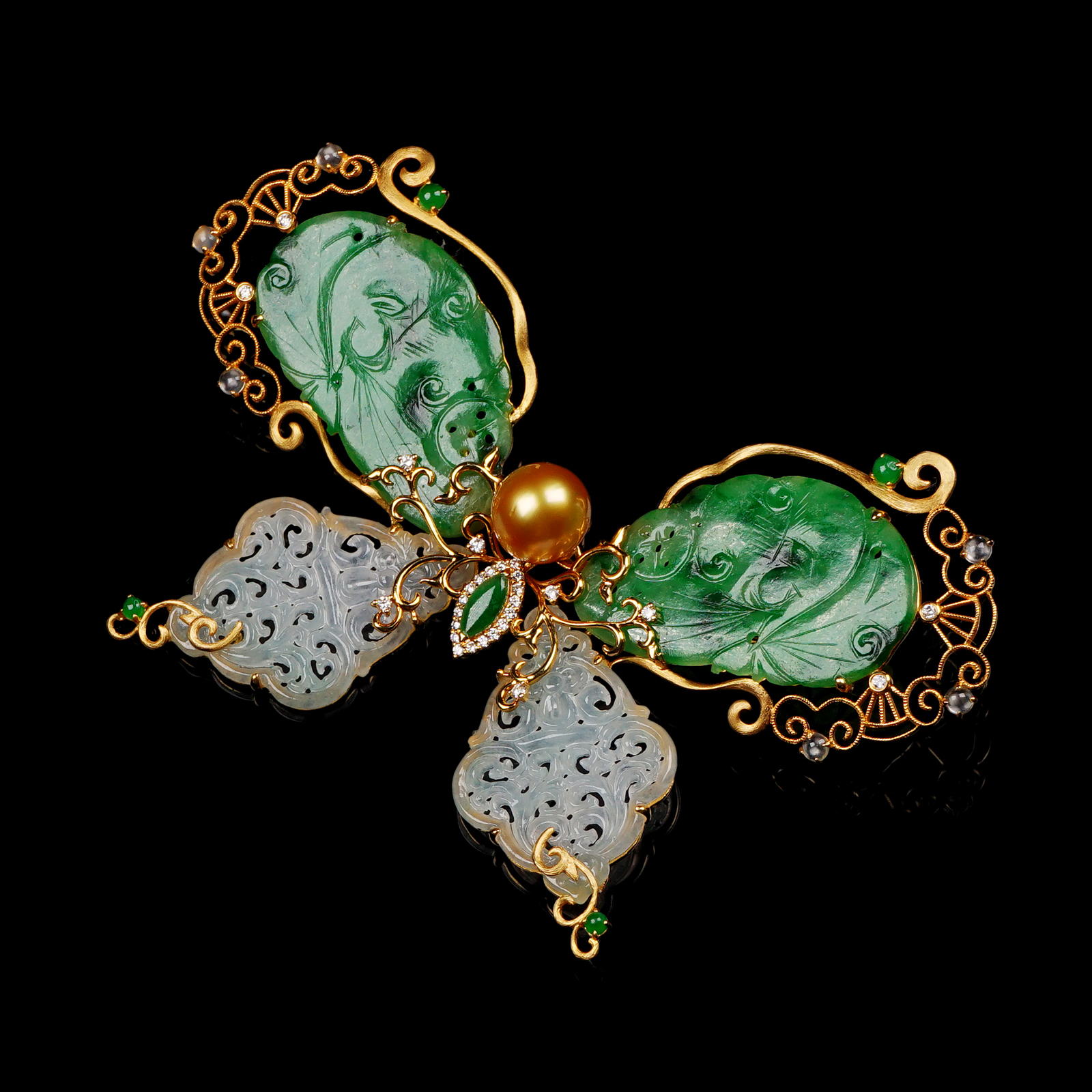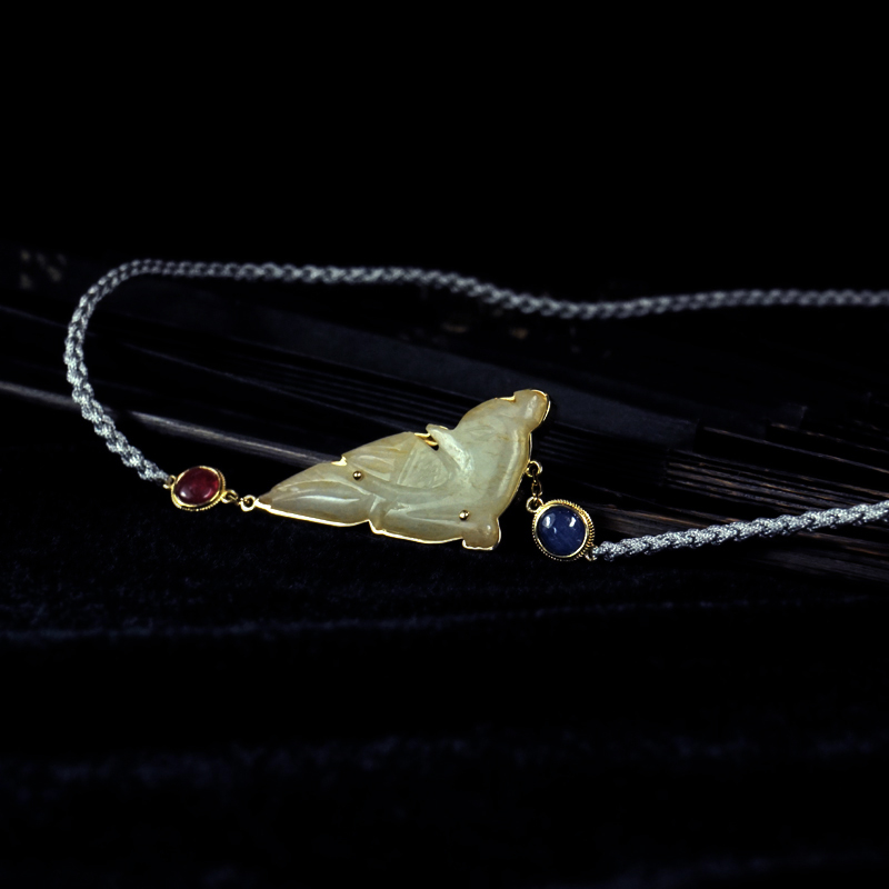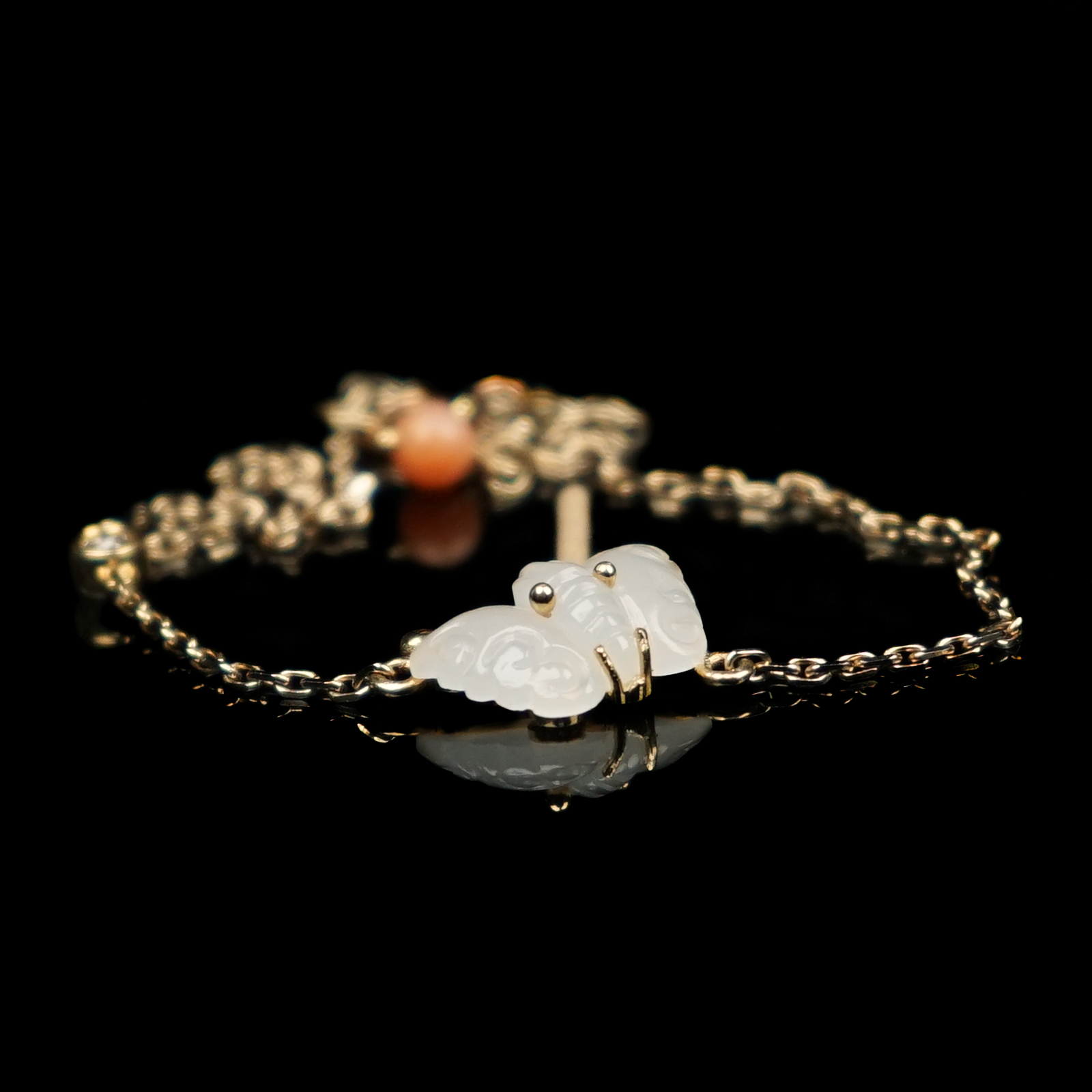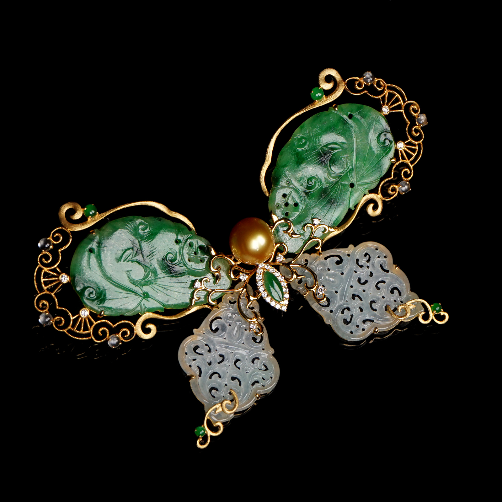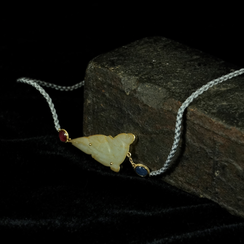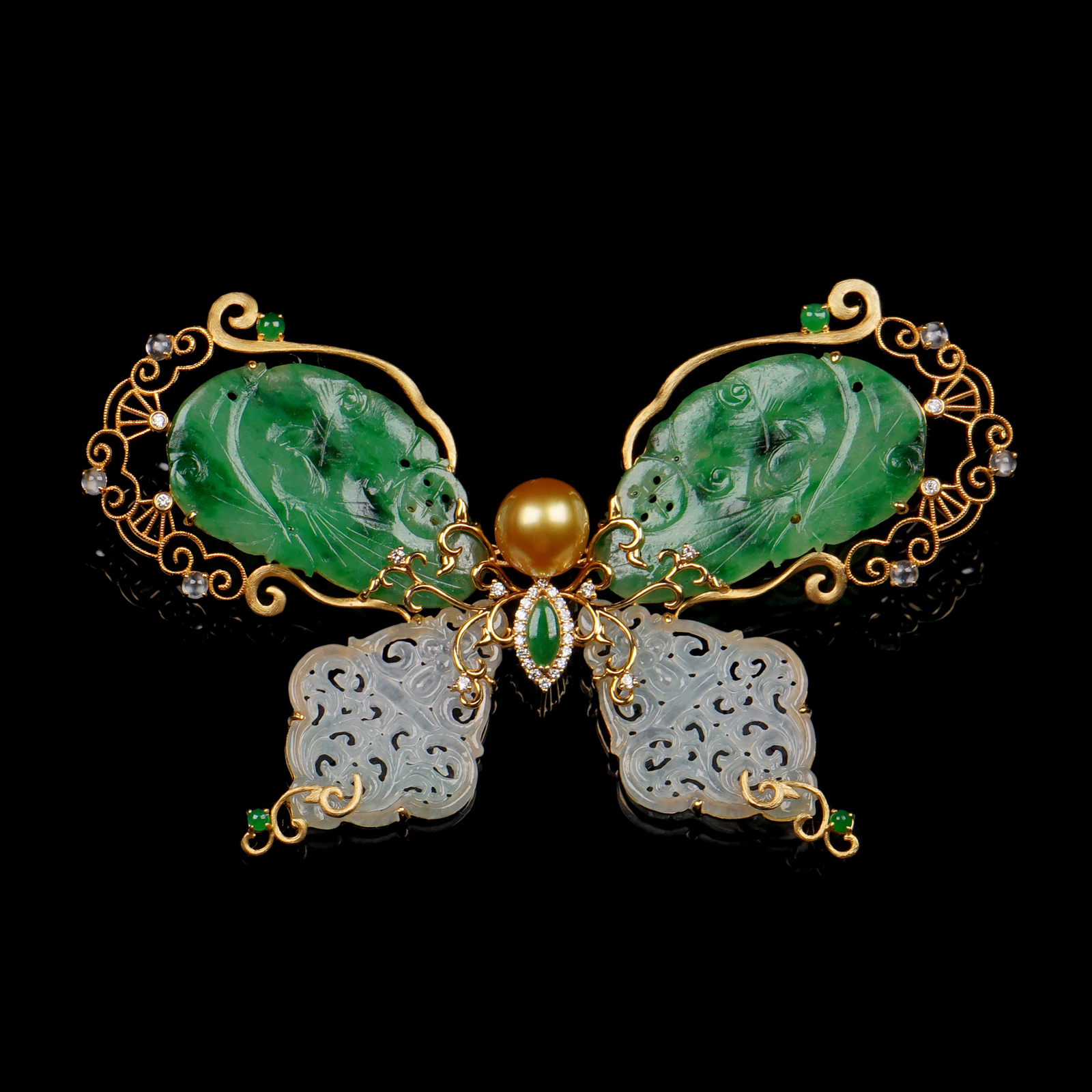 一款清代和田白玉蝴蝶。这种形制的白玉蝴蝶在民间非常的受欢迎,秀丽多姿,在设计上运用14K金线编织,新颖别致,是翩翩于项间的一抹亮丽风景。