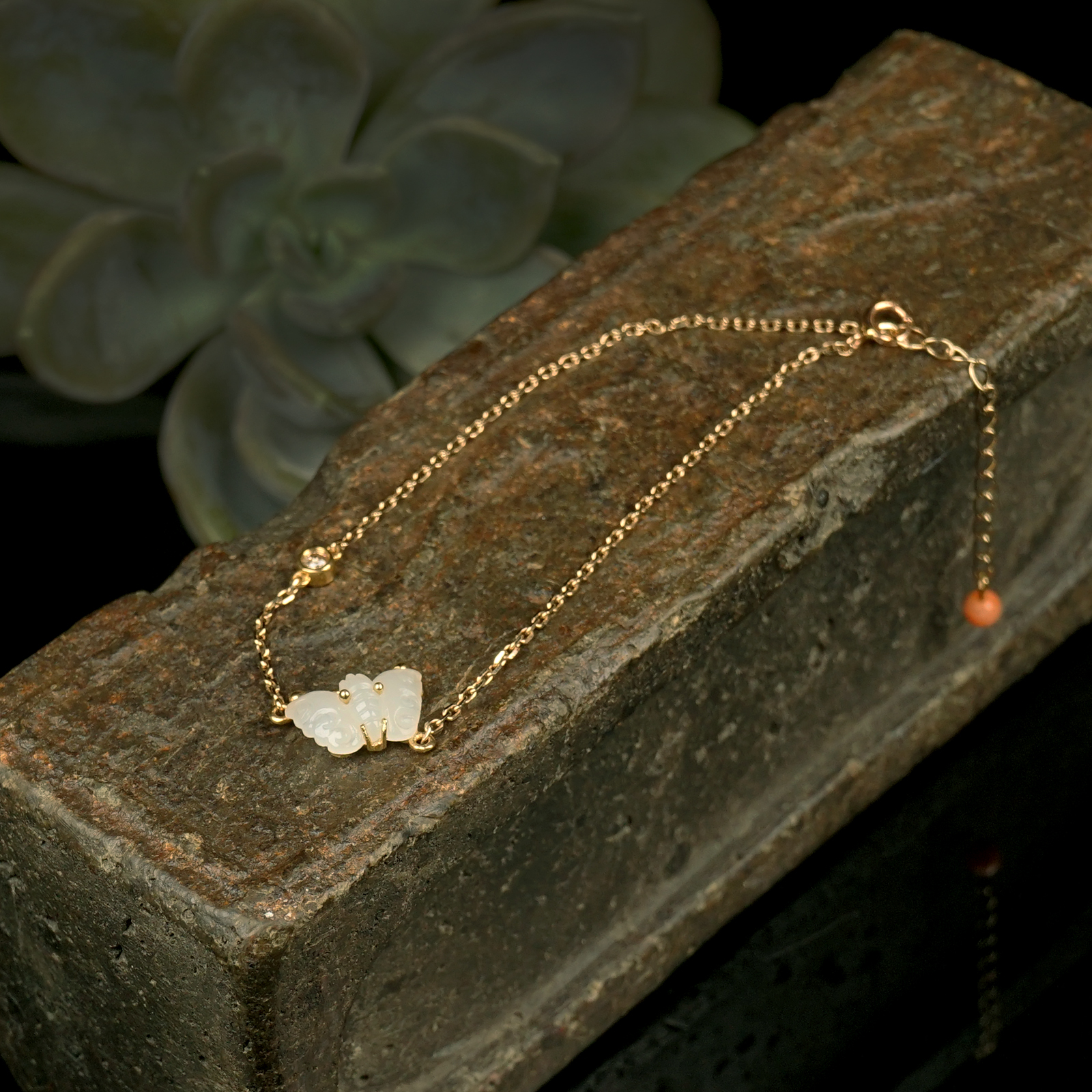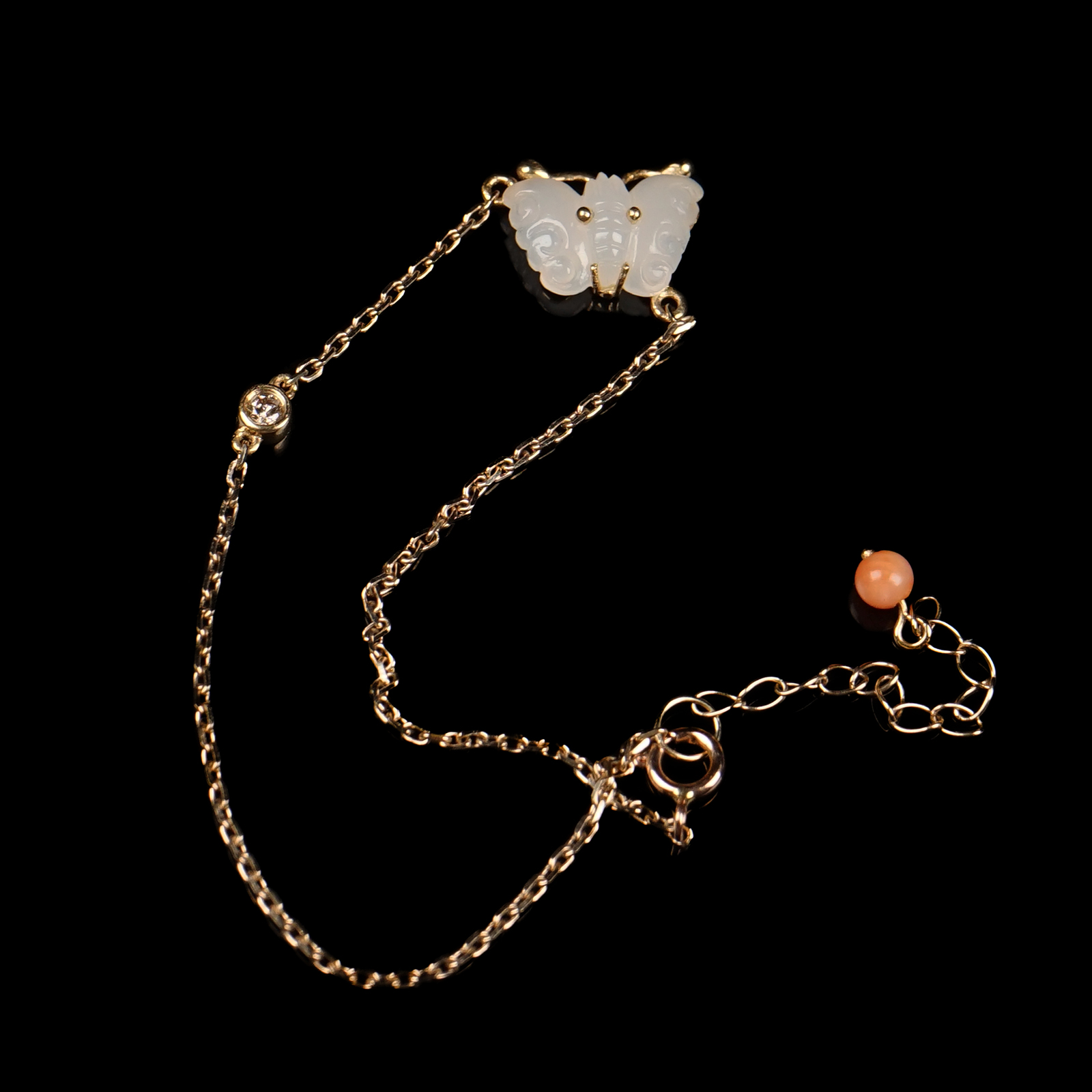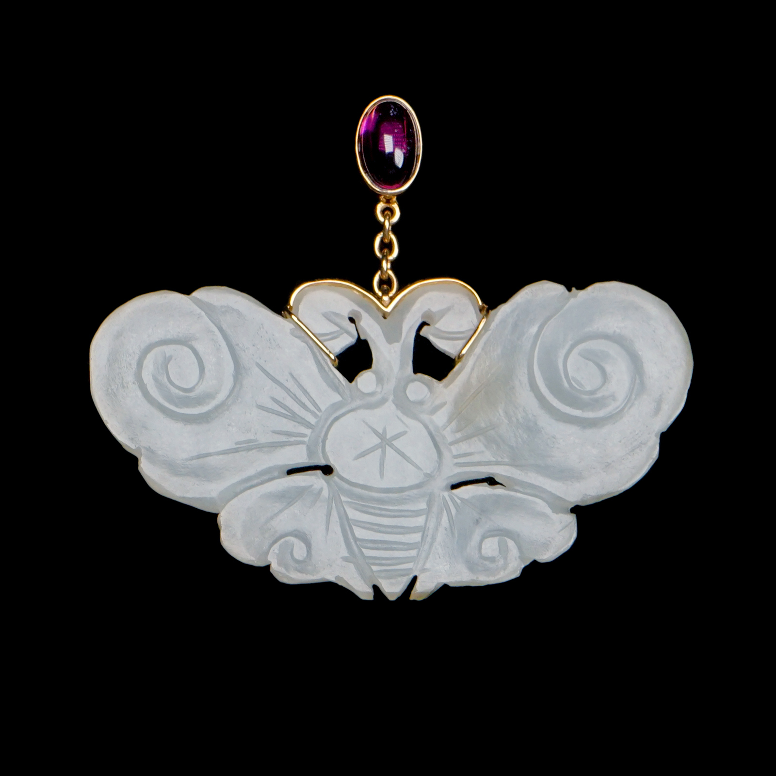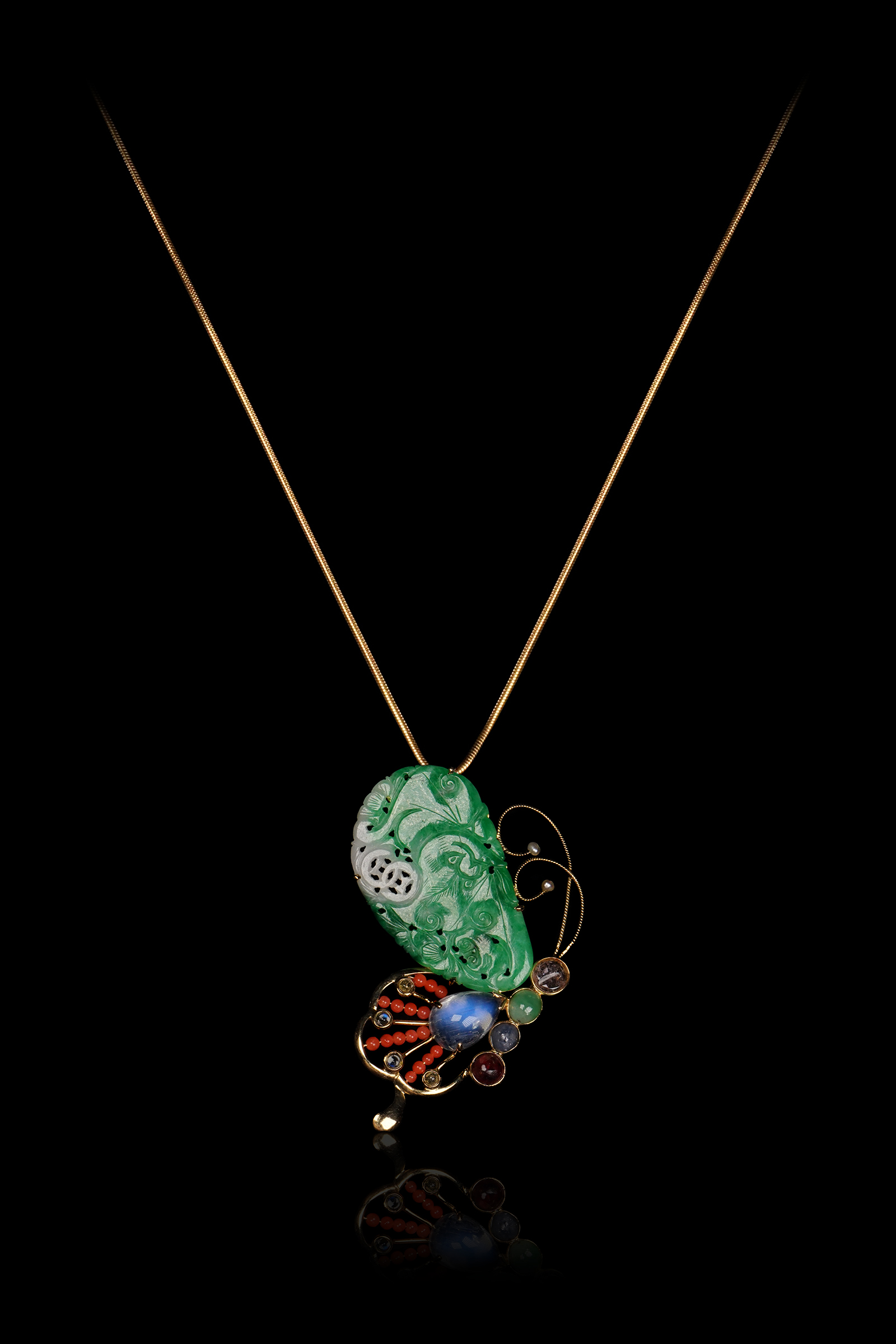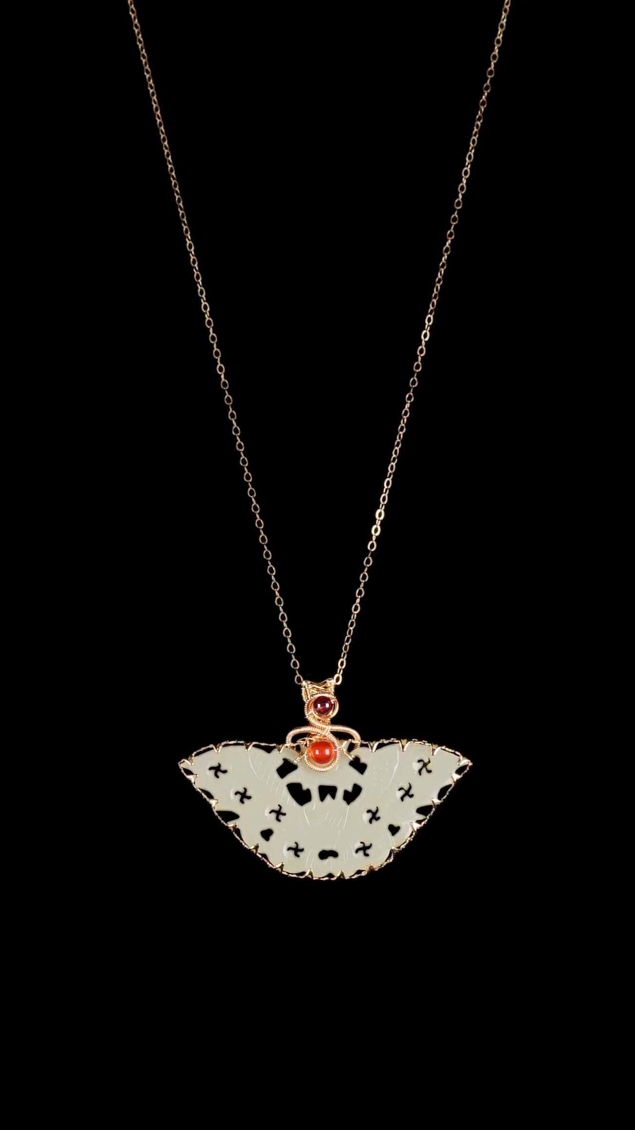 一款清代和田白玉蝴蝶。这种形制的白玉蝴蝶在民间非常的受欢迎,秀丽多姿,在设计上运用14K金线编织,新颖别致,是翩翩于项间的一抹亮丽风景。
