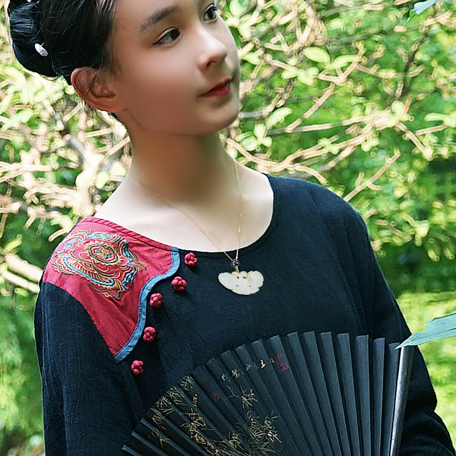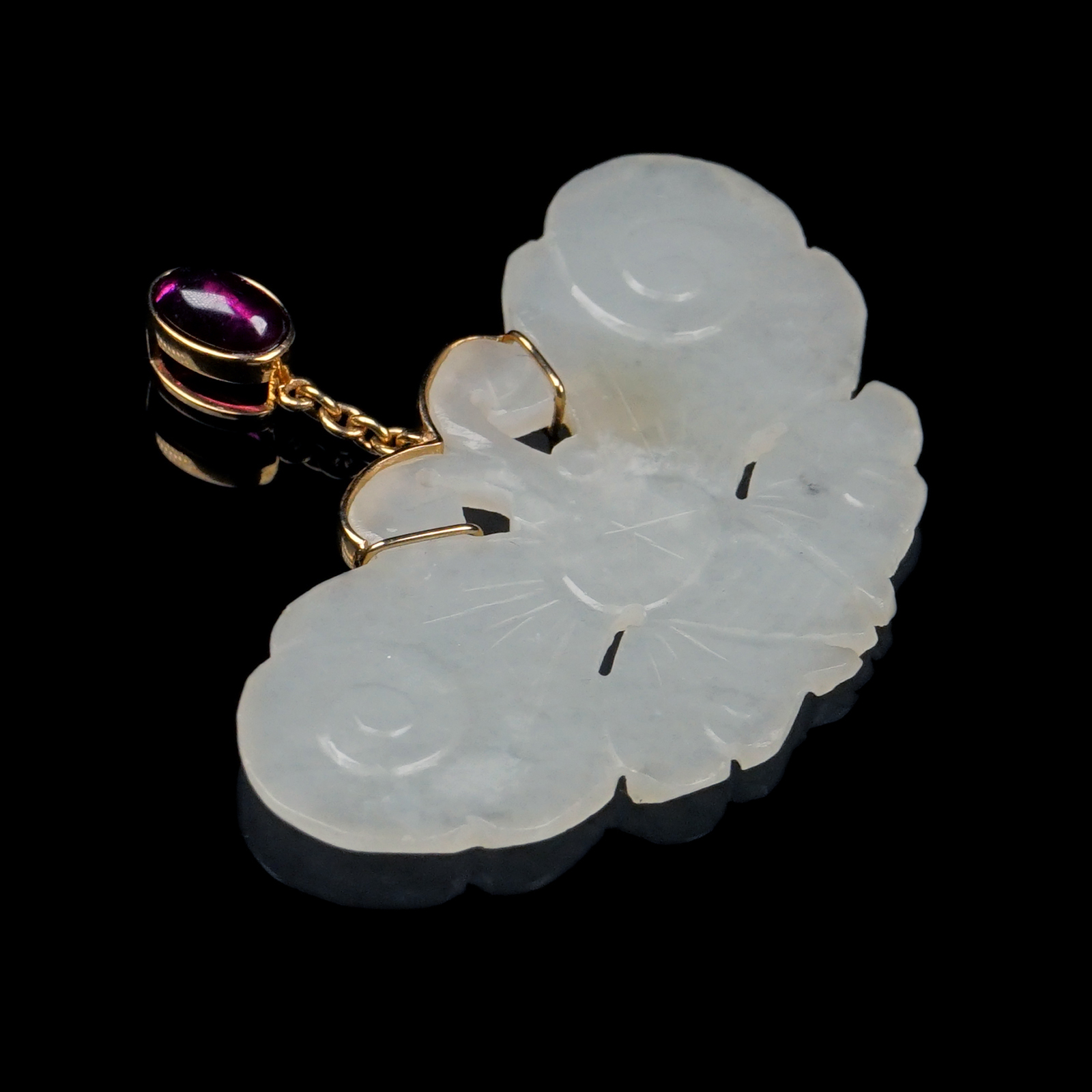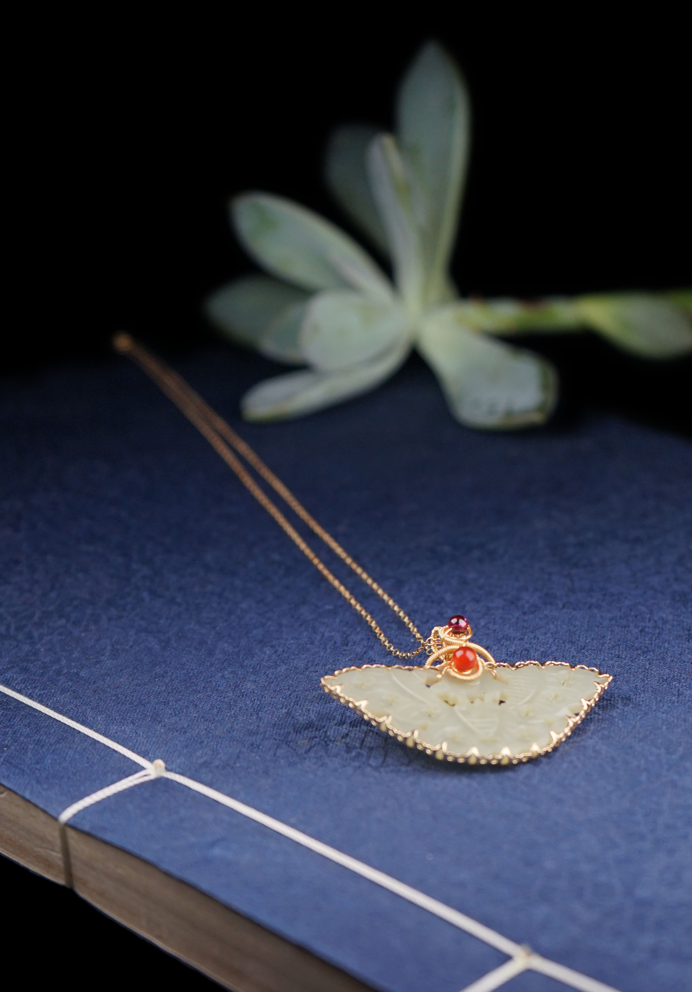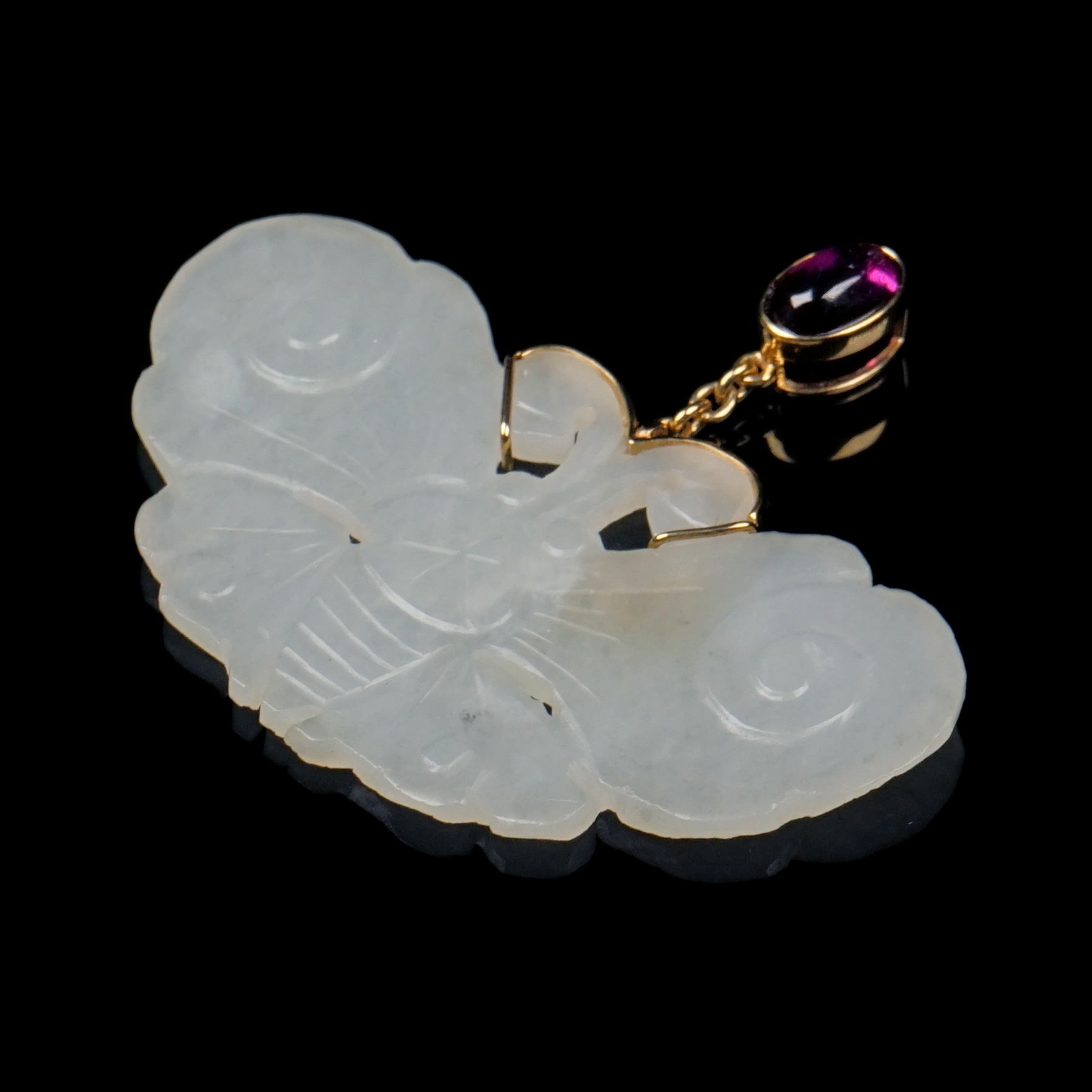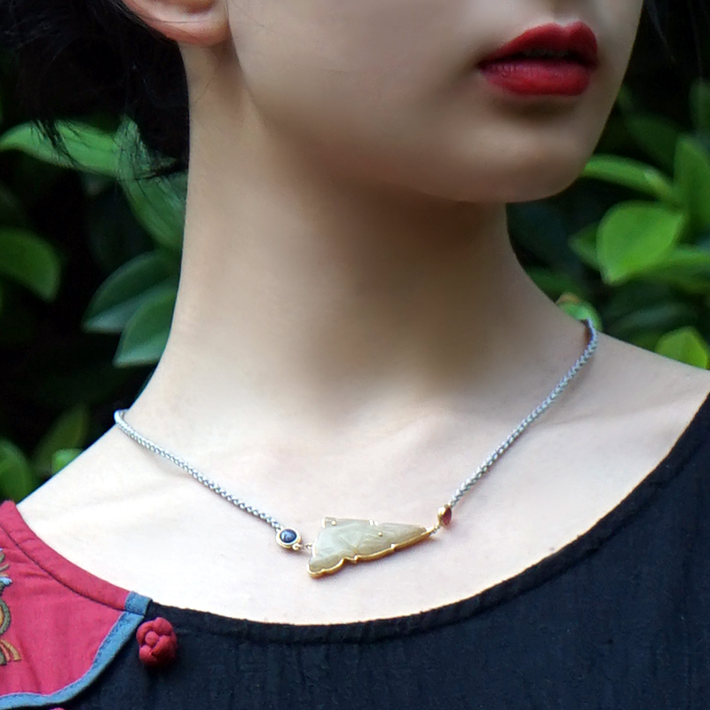 一款清代和田白玉蝴蝶。这种形制的白玉蝴蝶在民间非常的受欢迎,秀丽多姿,在设计上运用14K金线编织,新颖别致,是翩翩于项间的一抹亮丽风景。