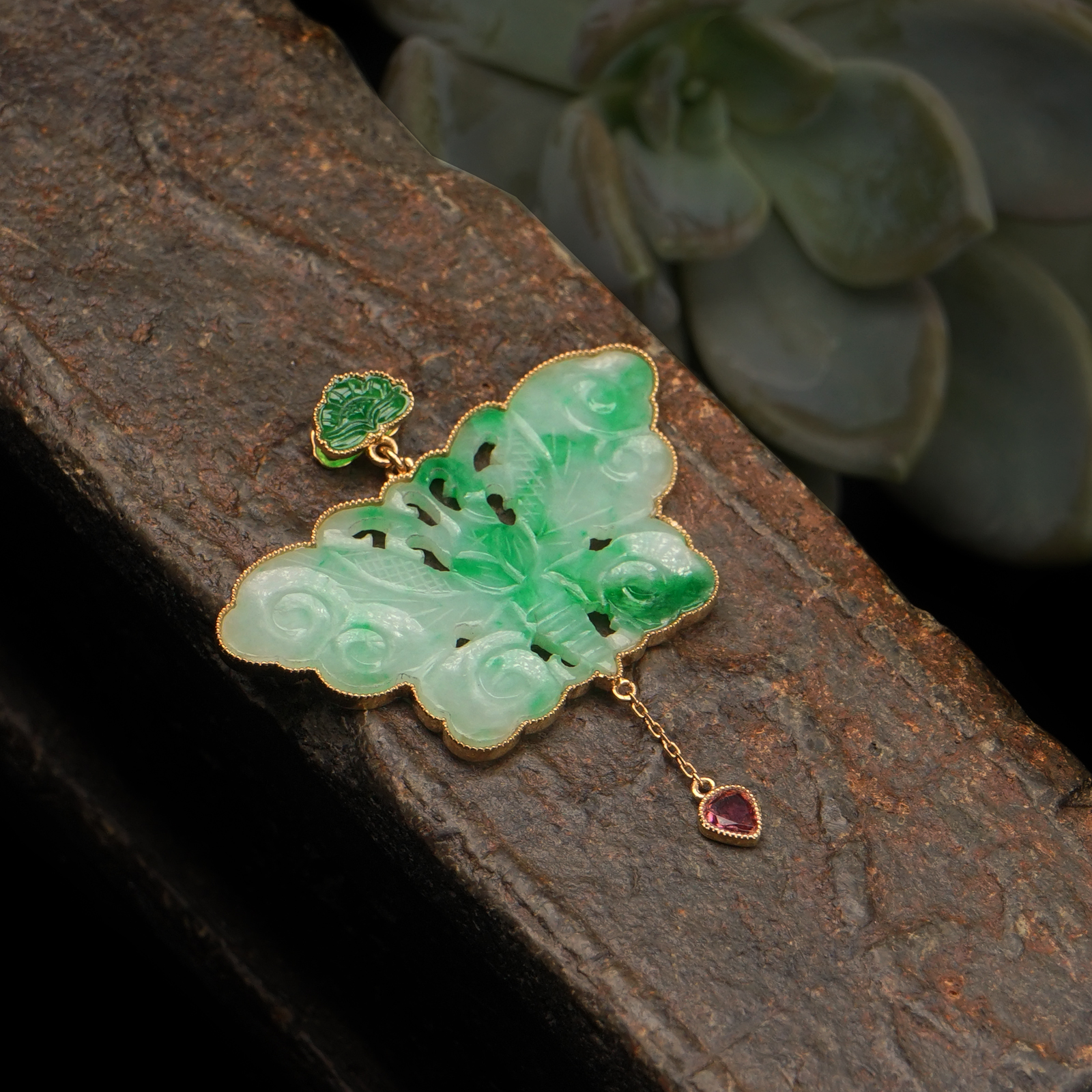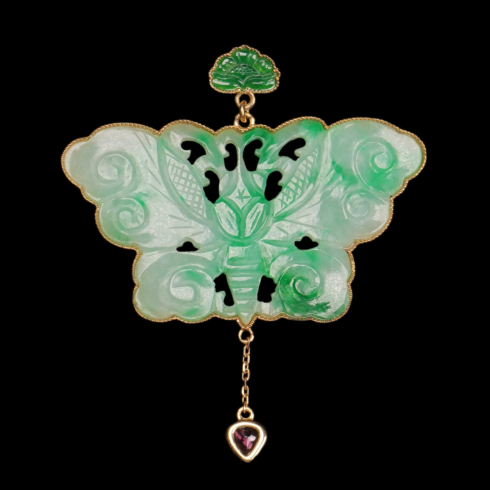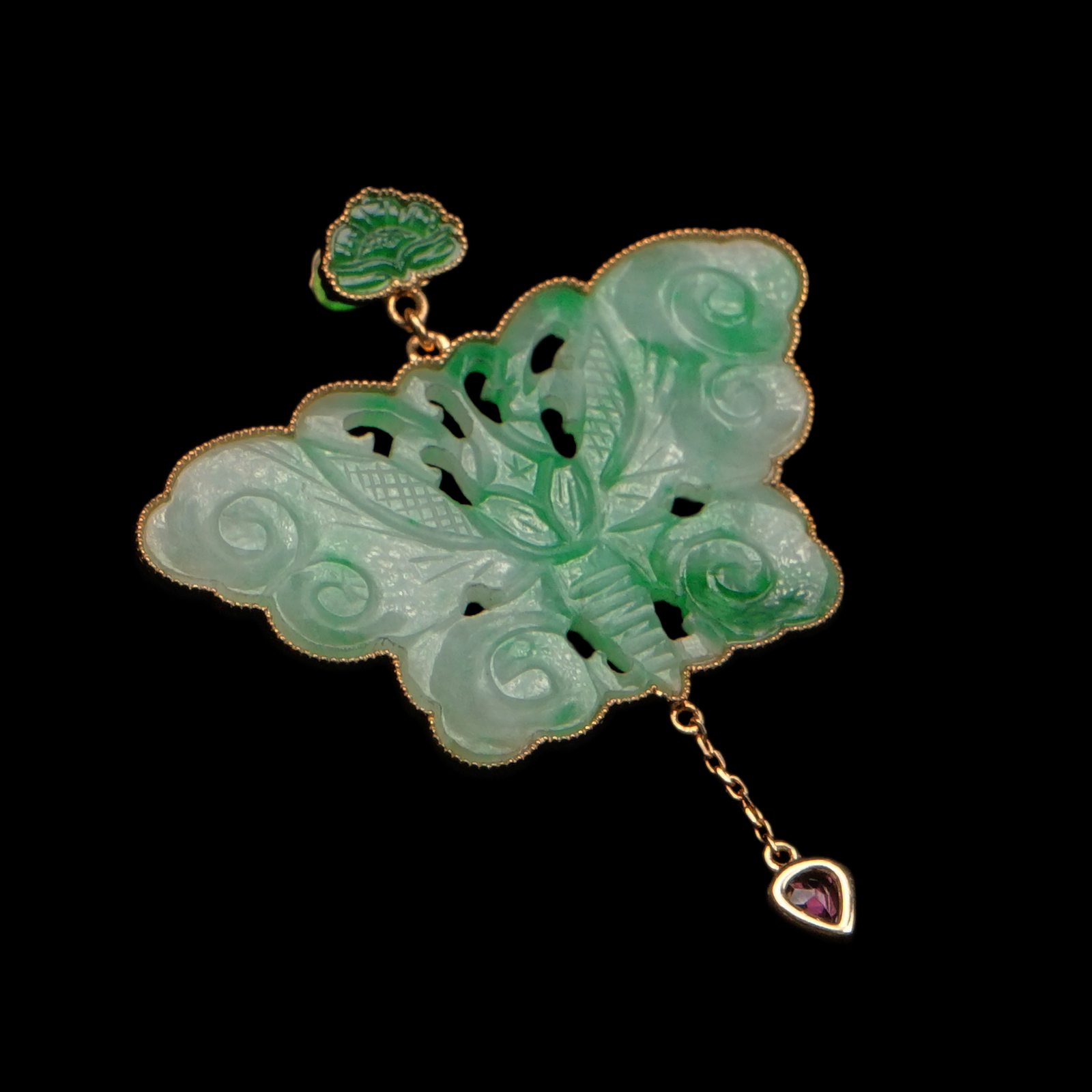 一款清代阳绿俏色翡翠花片设计成的蝴蝶项饰,花片体型大,雕刻工艺细致精湛,身姿优美,色泽悦目动人。细细观摩,有双钱,灵芝,蝙蝠等吉祥图案。