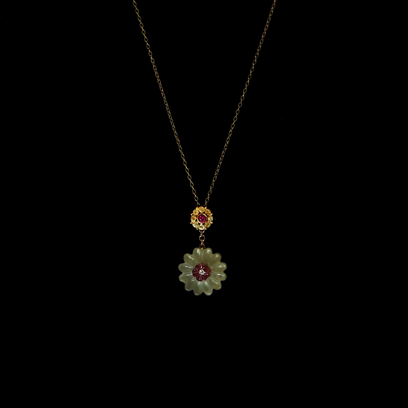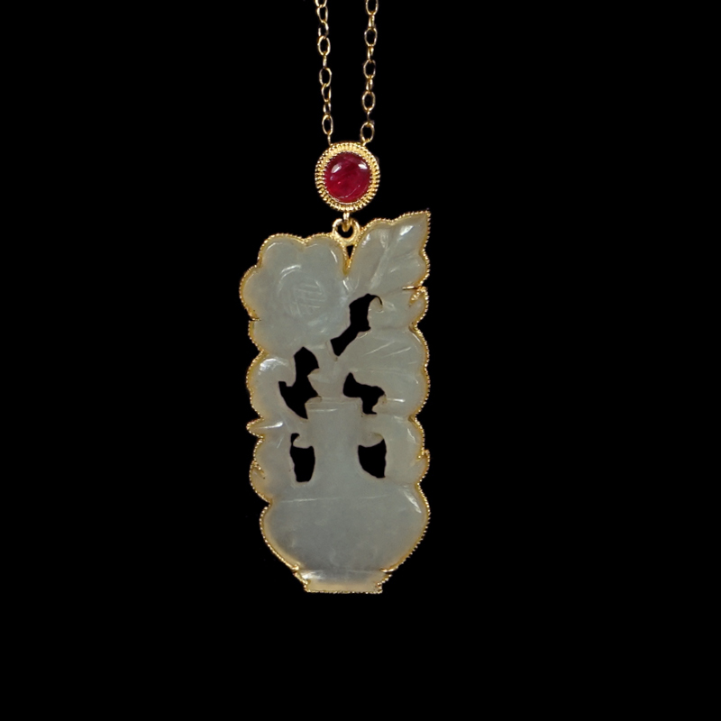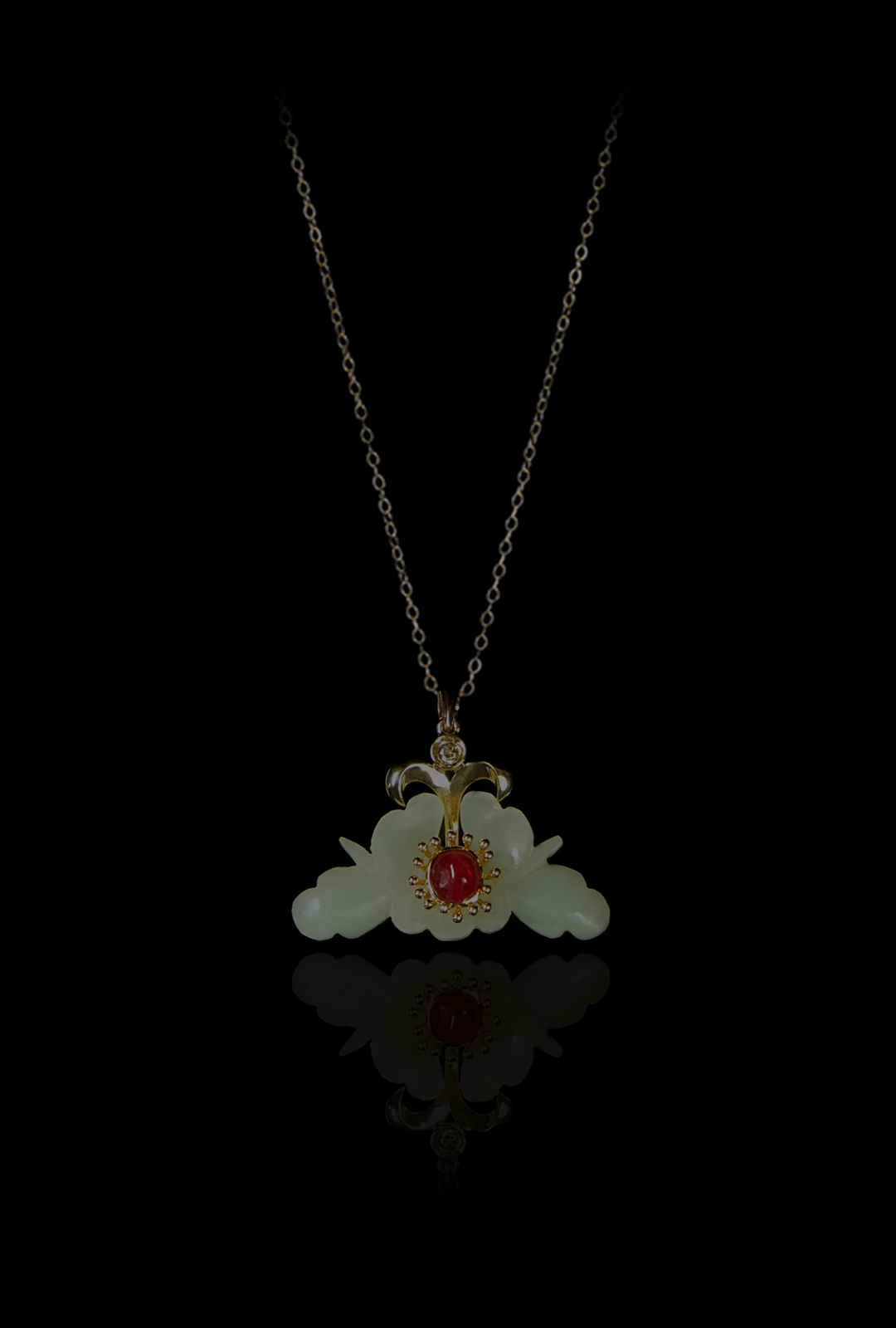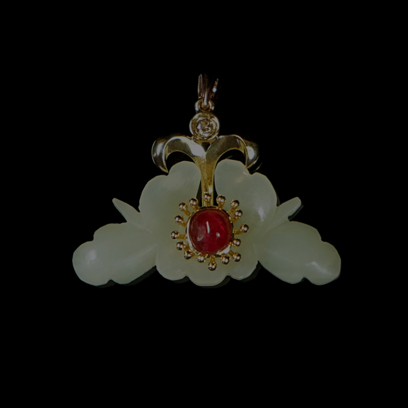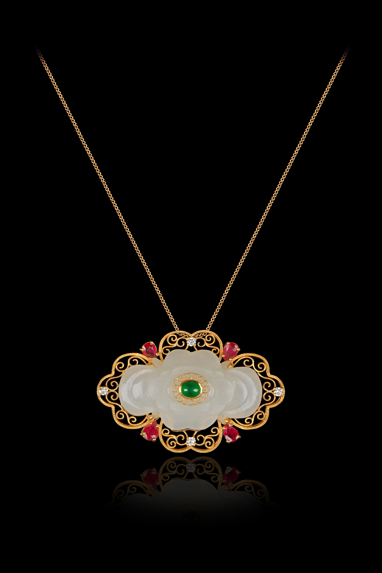 【材质】和田白玉 钻石 红宝 碧玺 18K金