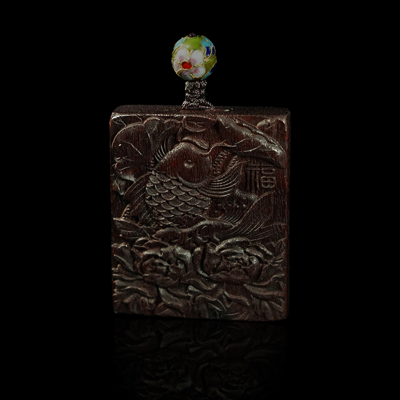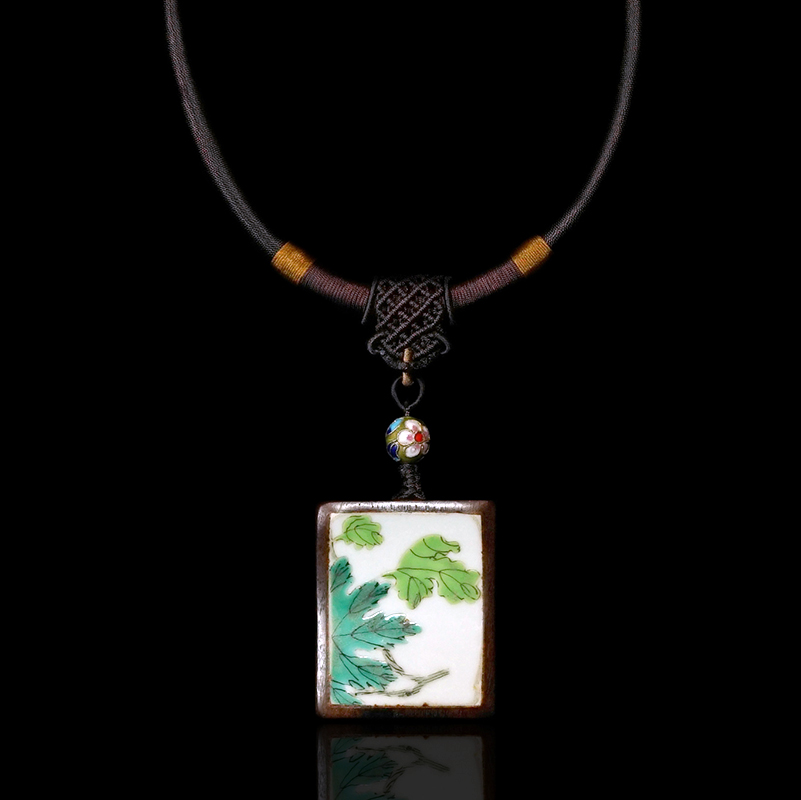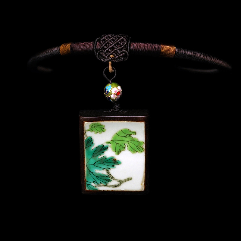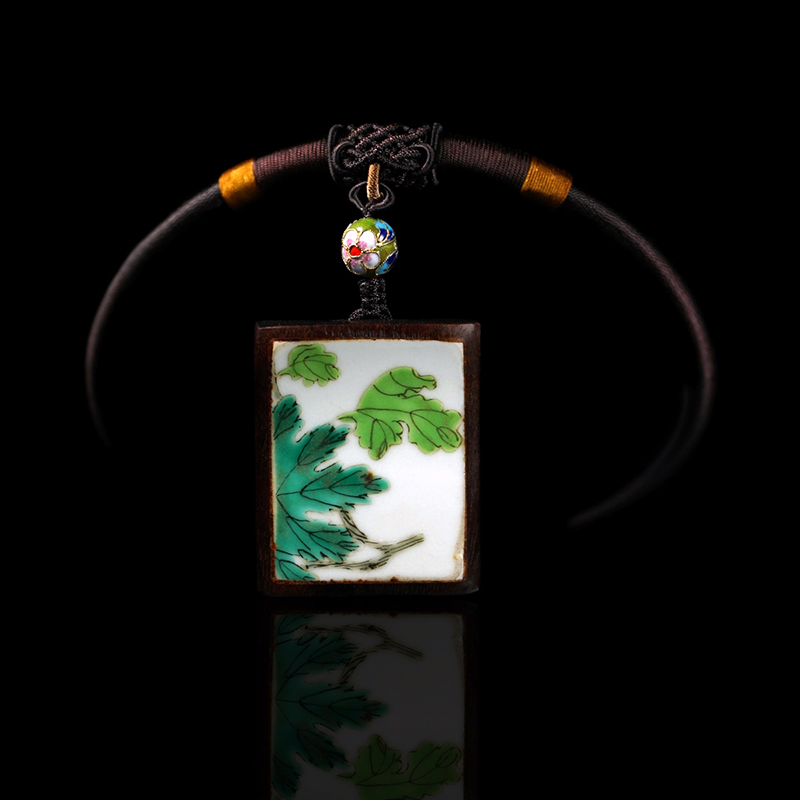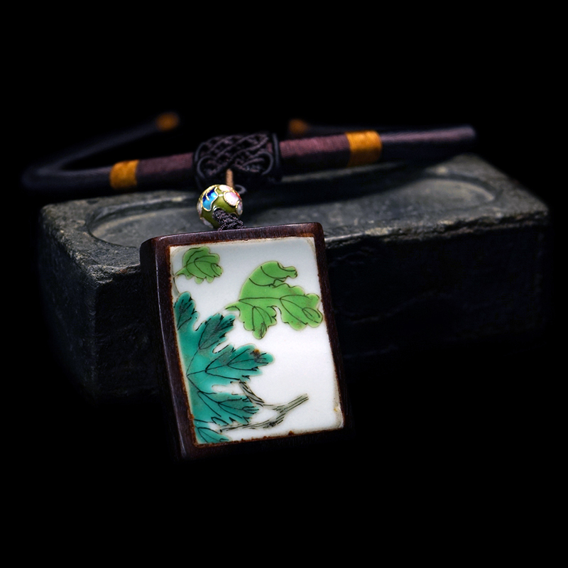 此款瓷片绘画精妙,枝叶翻飞生动,色彩清雅。以红木镶嵌,端庄典雅,反面刻有鱼戏莲莲,相映成趣。