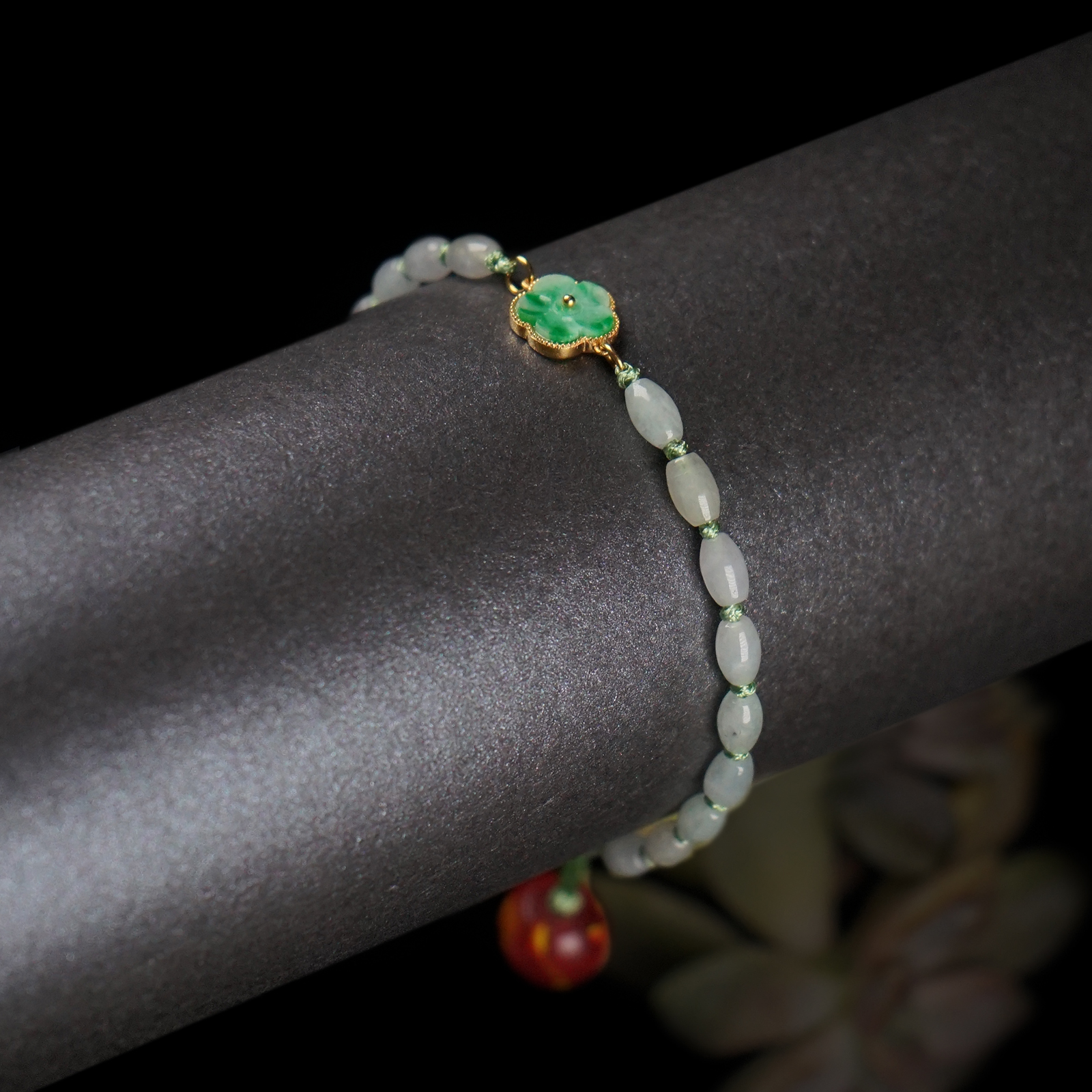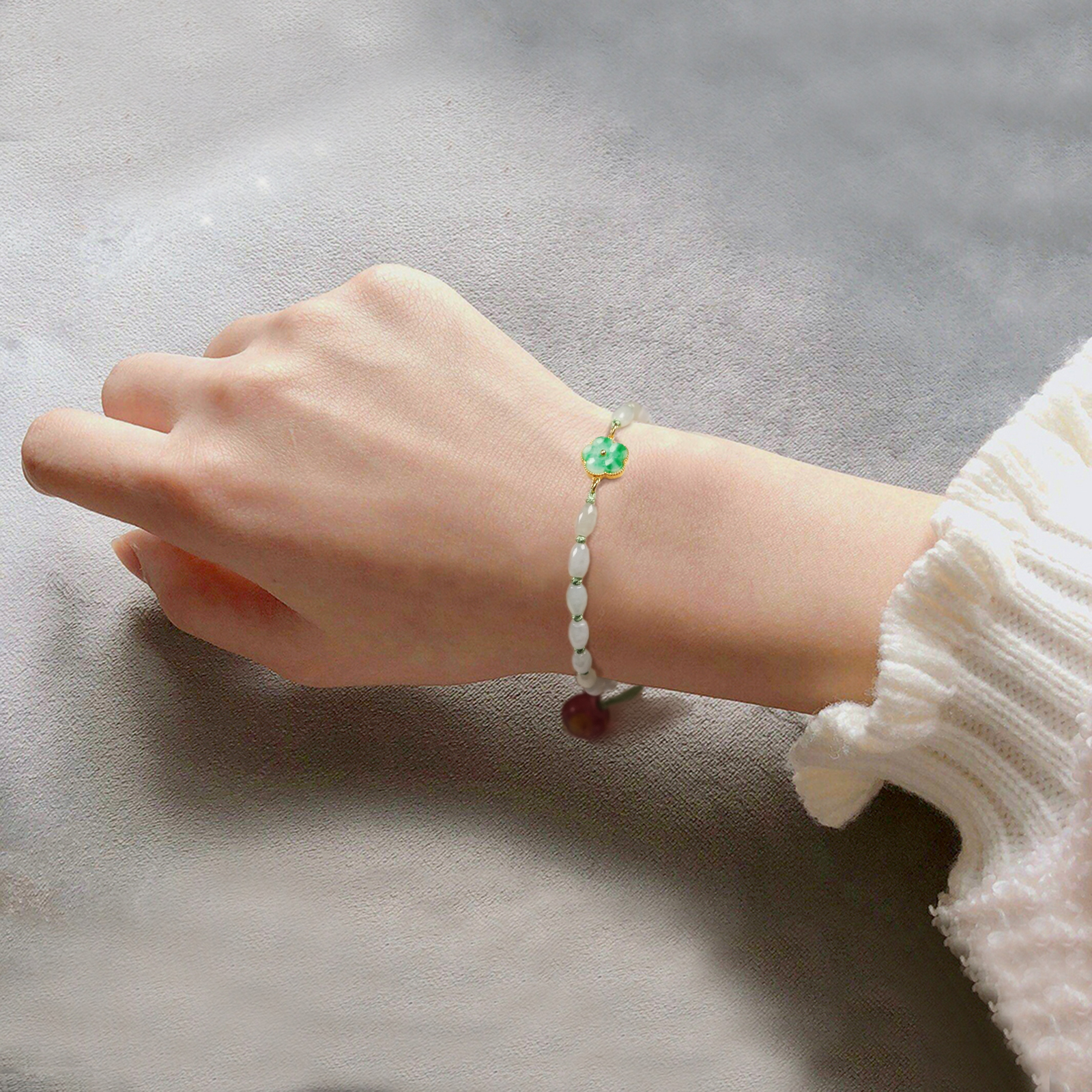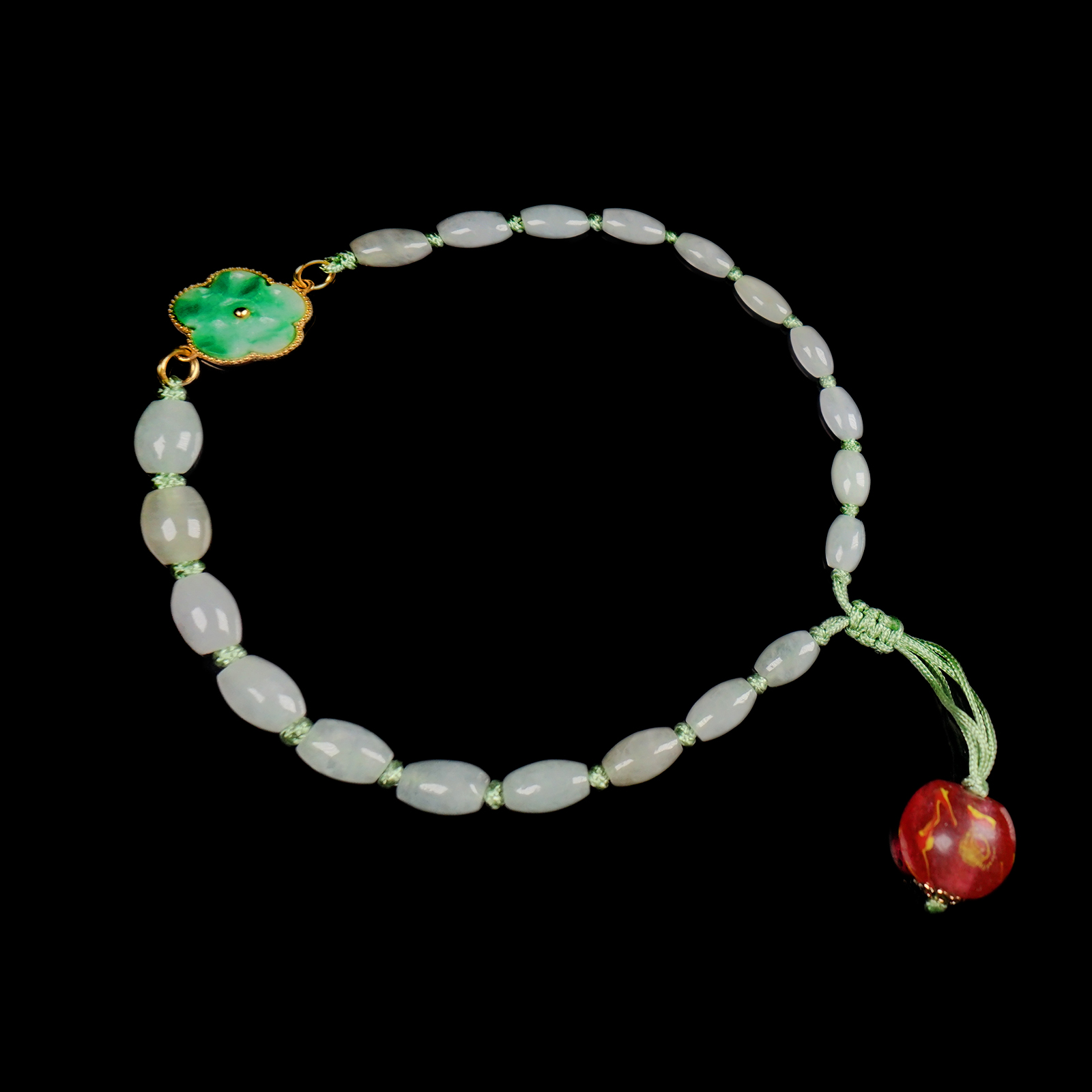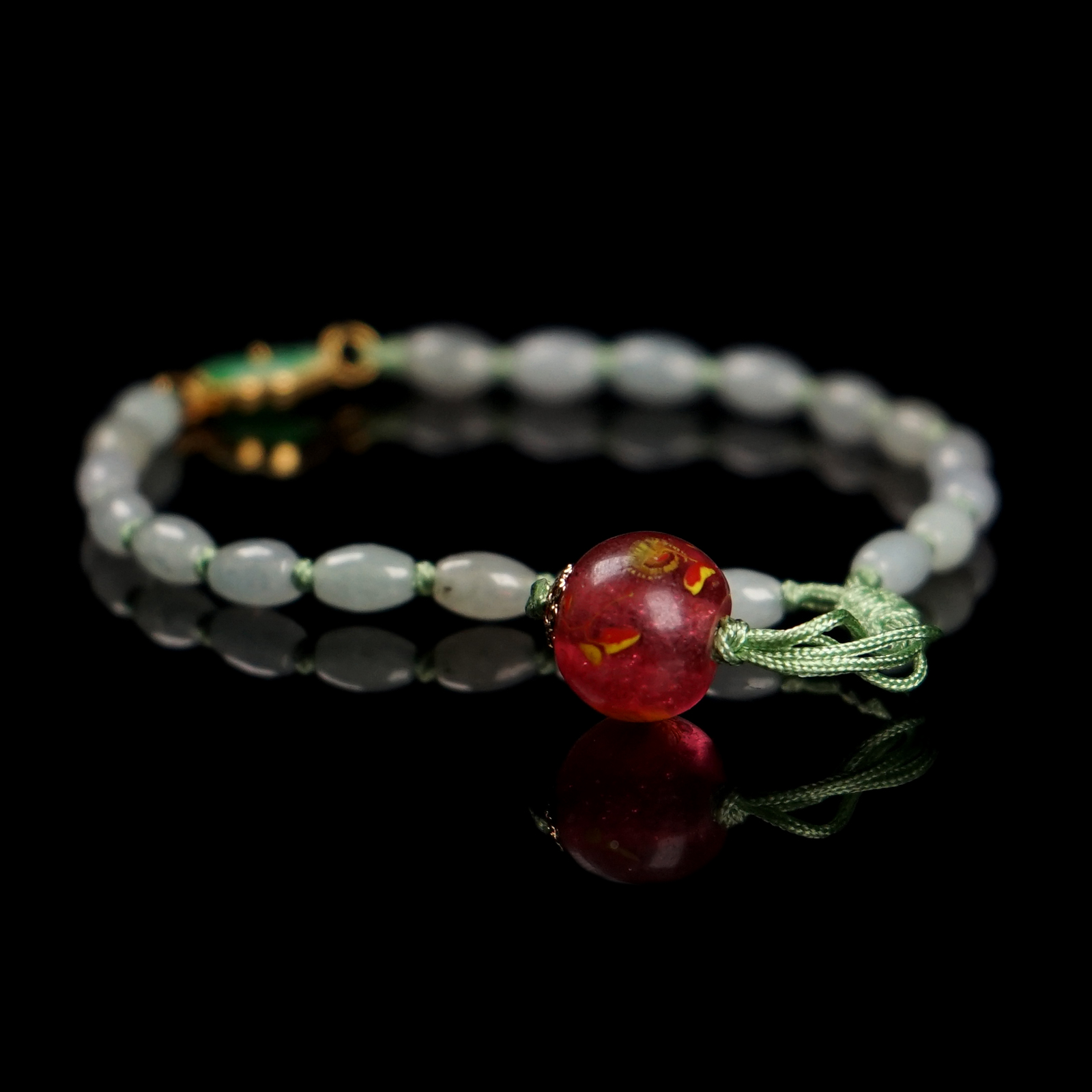 一款用清代翡翠花片和民国粉色绞胎琉璃珠串成的手串,色泽清雅,温柔妩媚,娇俏灵动,以白冰翡翠珠串之,更添莹洁冰爽。