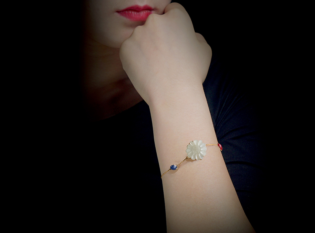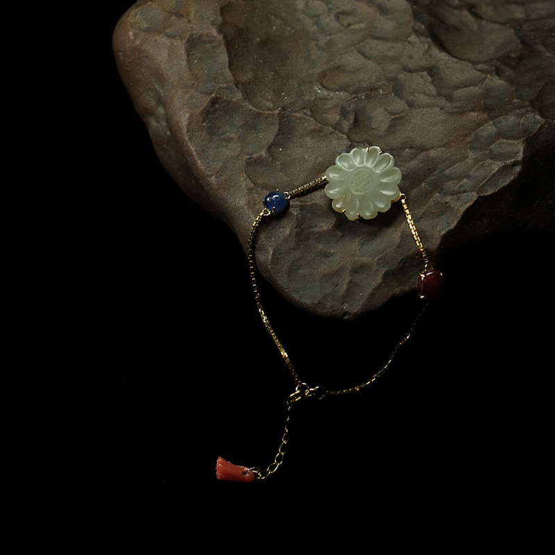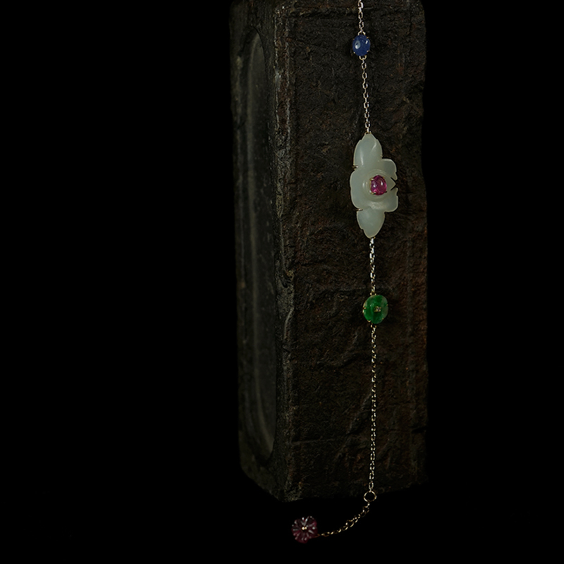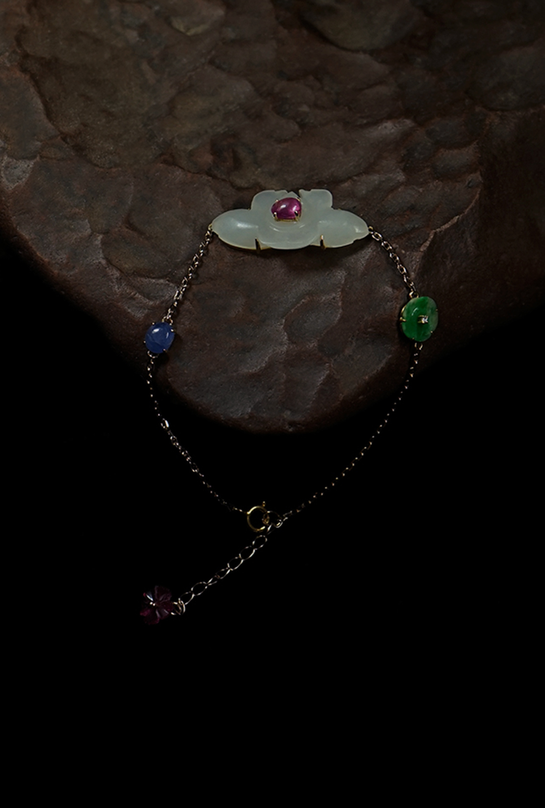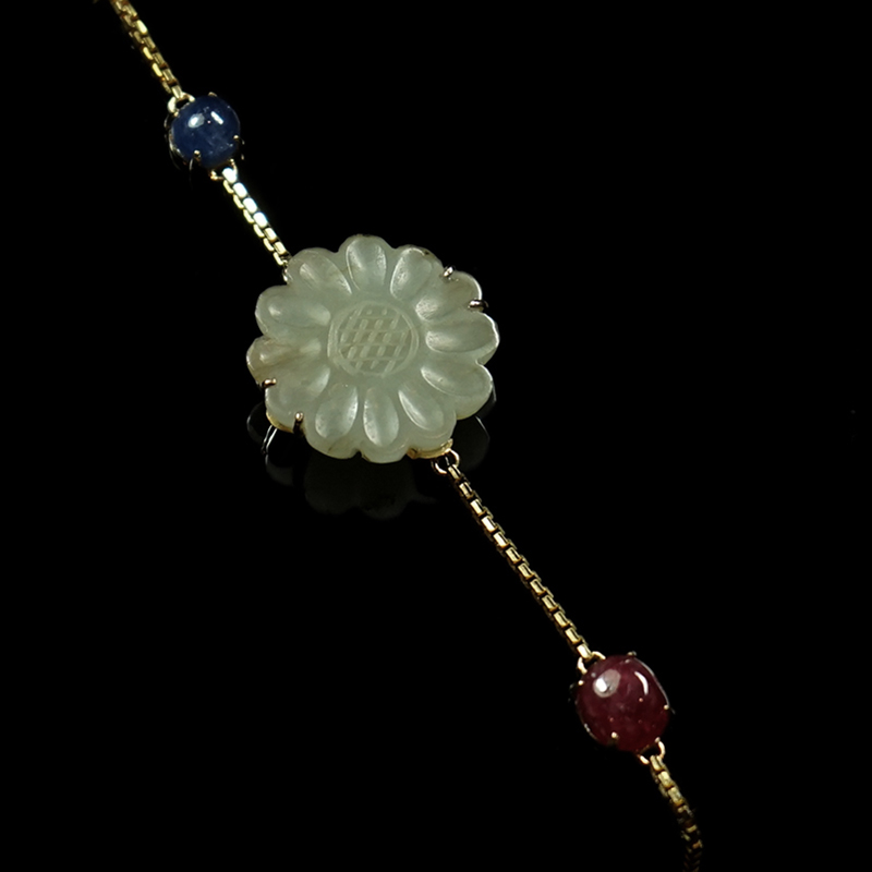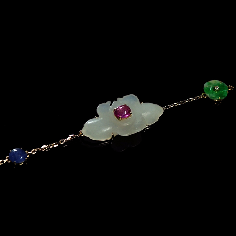 这是一款玉质上佳,达到一级白的无暇细腻的清代和田白玉花,花形优美,品相完整,品质非常的优秀,配上老红蓝宝和老翡翠花,碧玺镶嵌成的一条秀气精致的手链,戴在腕间,秀丽文雅。