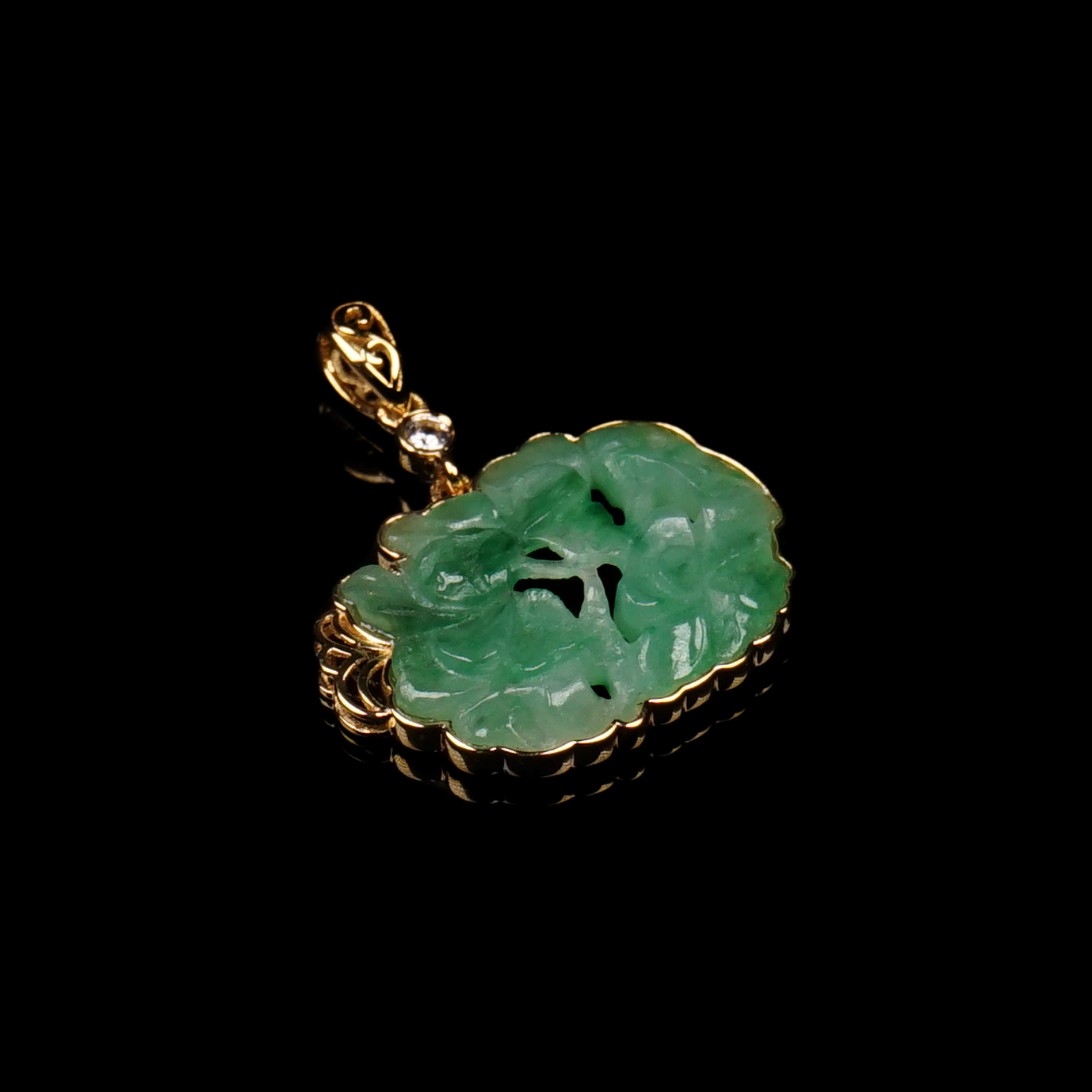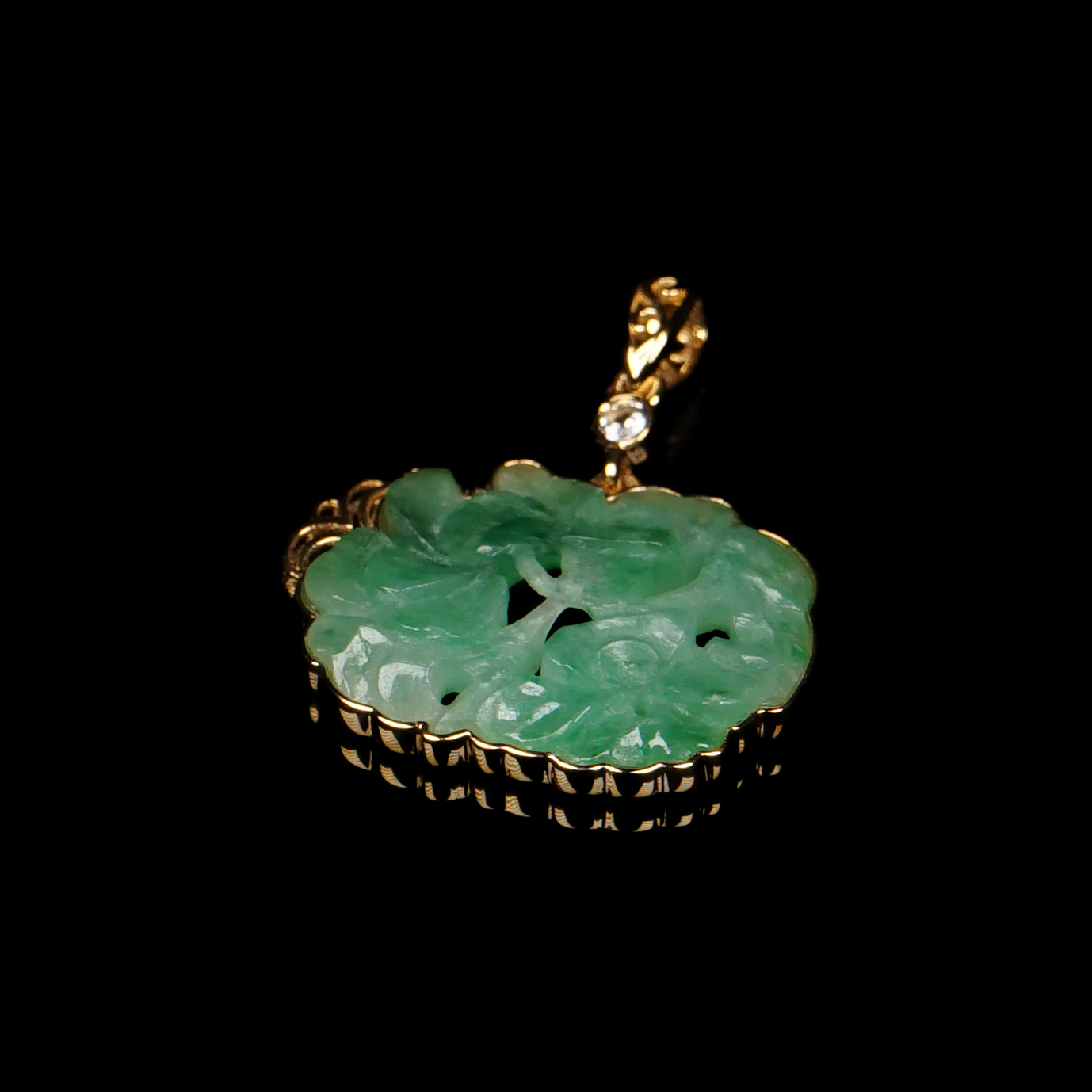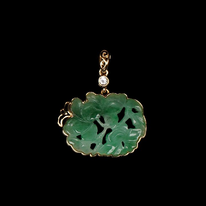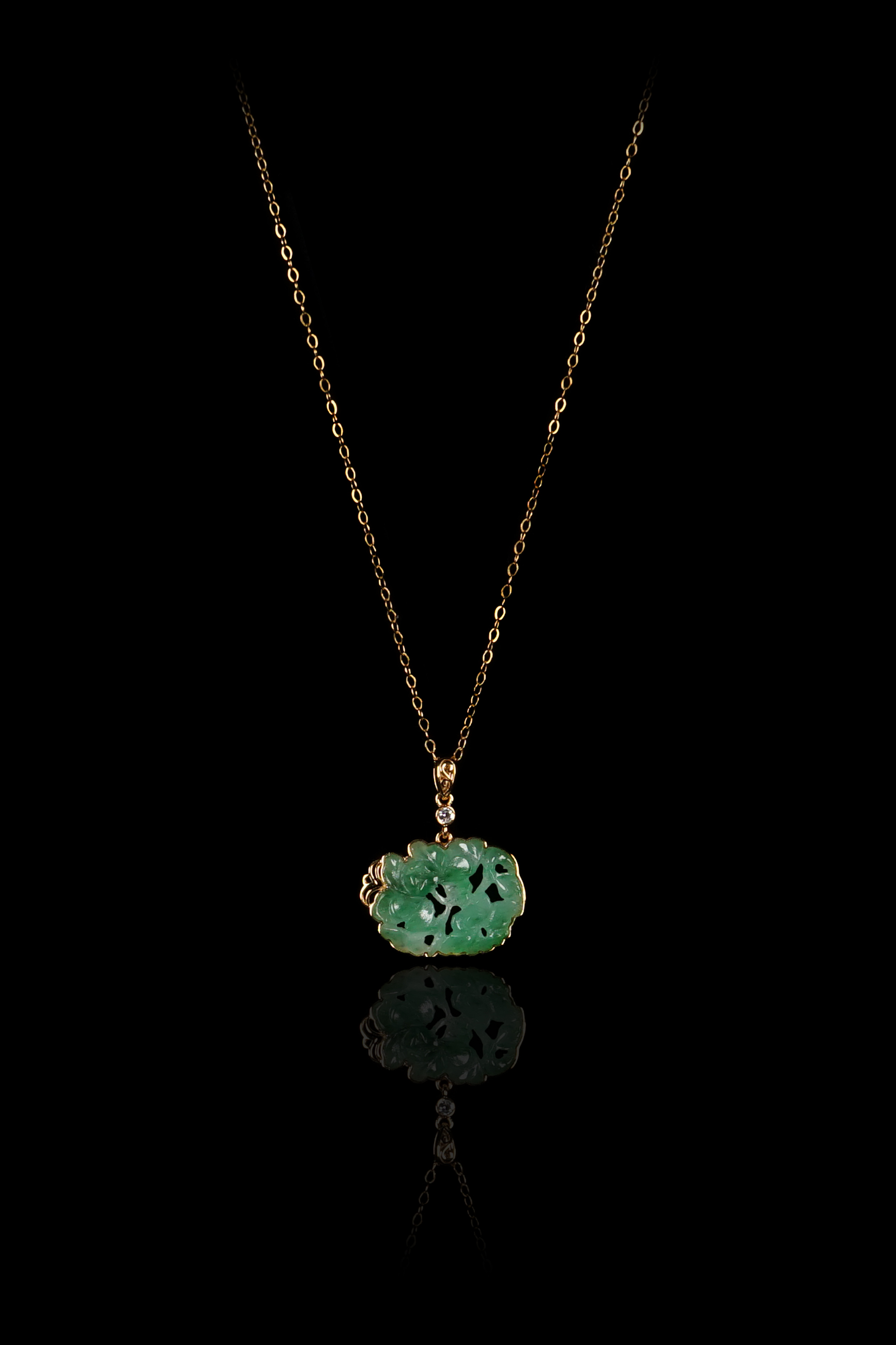一款翠意盎然的日本回流清代翡翠花项饰,虽小却雕刻细致精湛,点缀了白色蓝宝,清丽脱俗。