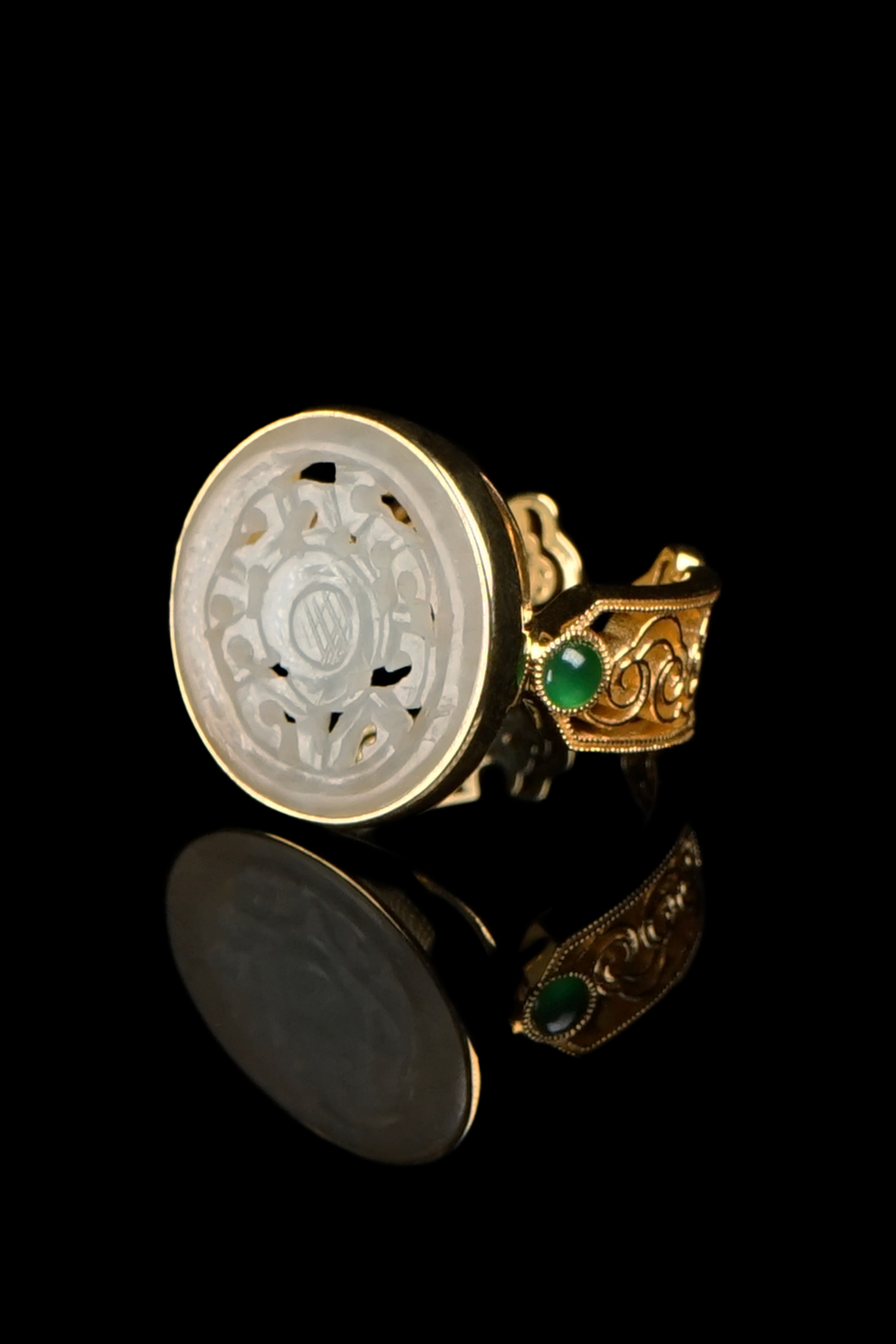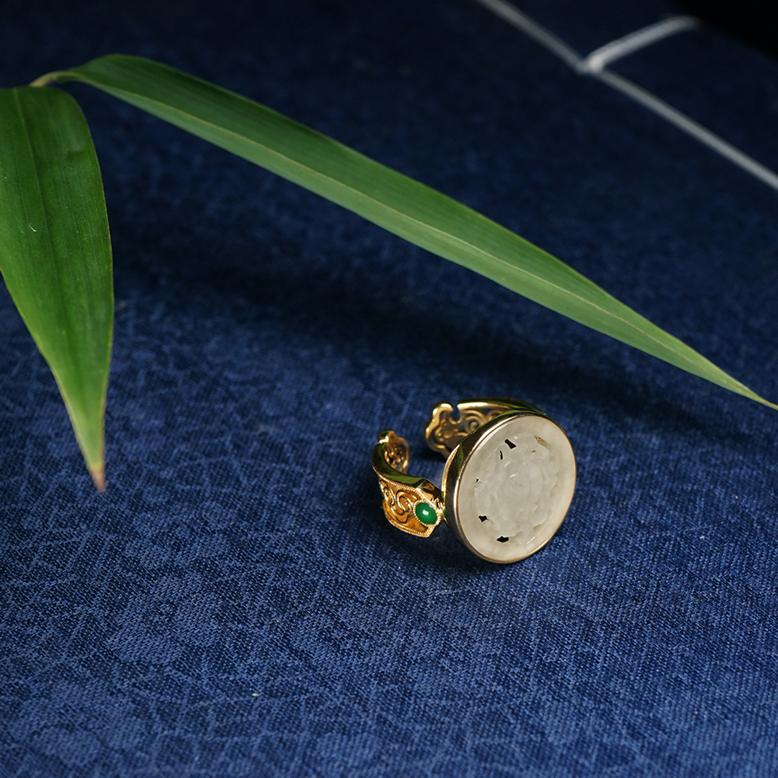 一款玉质一流,白润无暇的清代和田白玉纽扣设计成的戒指。花形精美,不知是哪位大家闺秀之物。