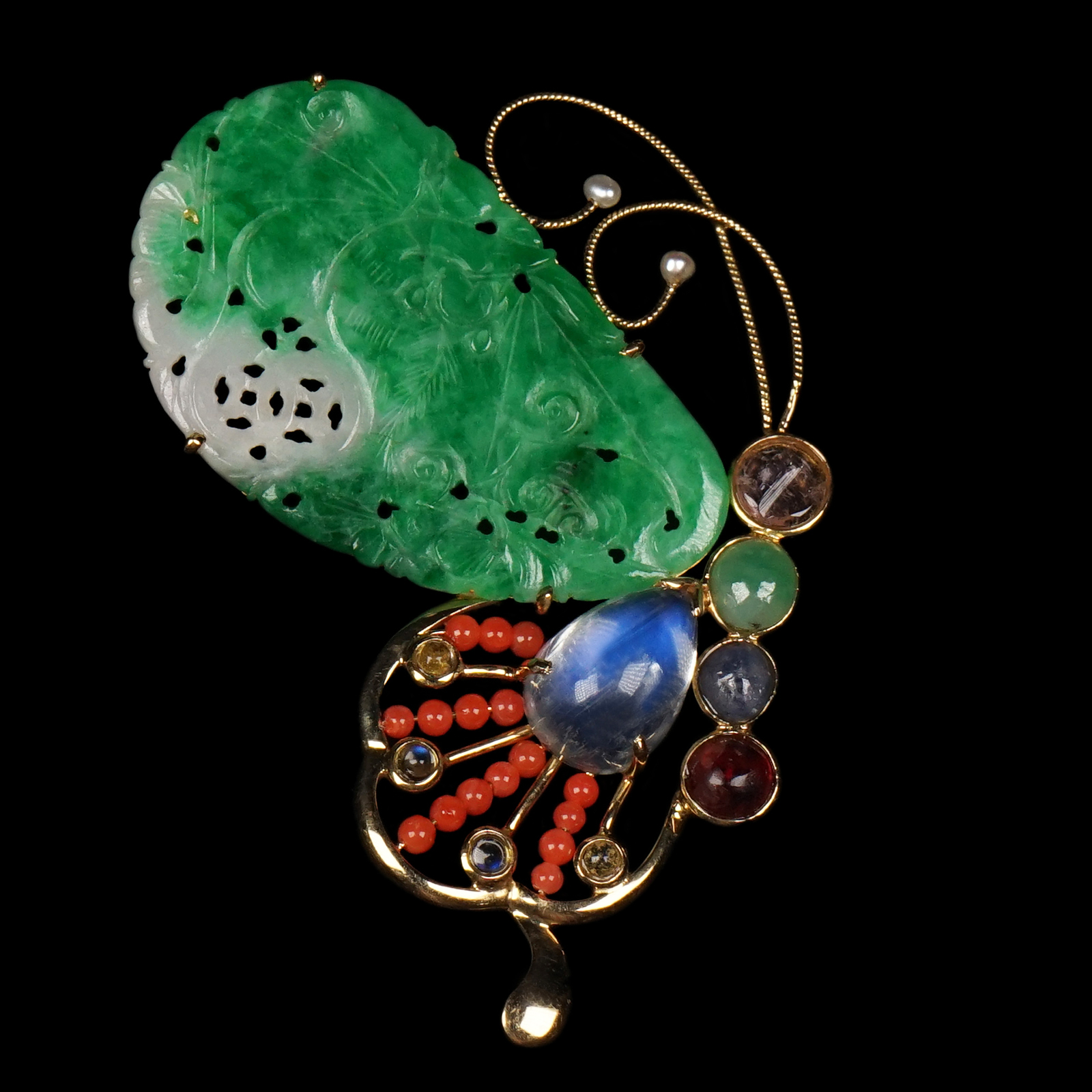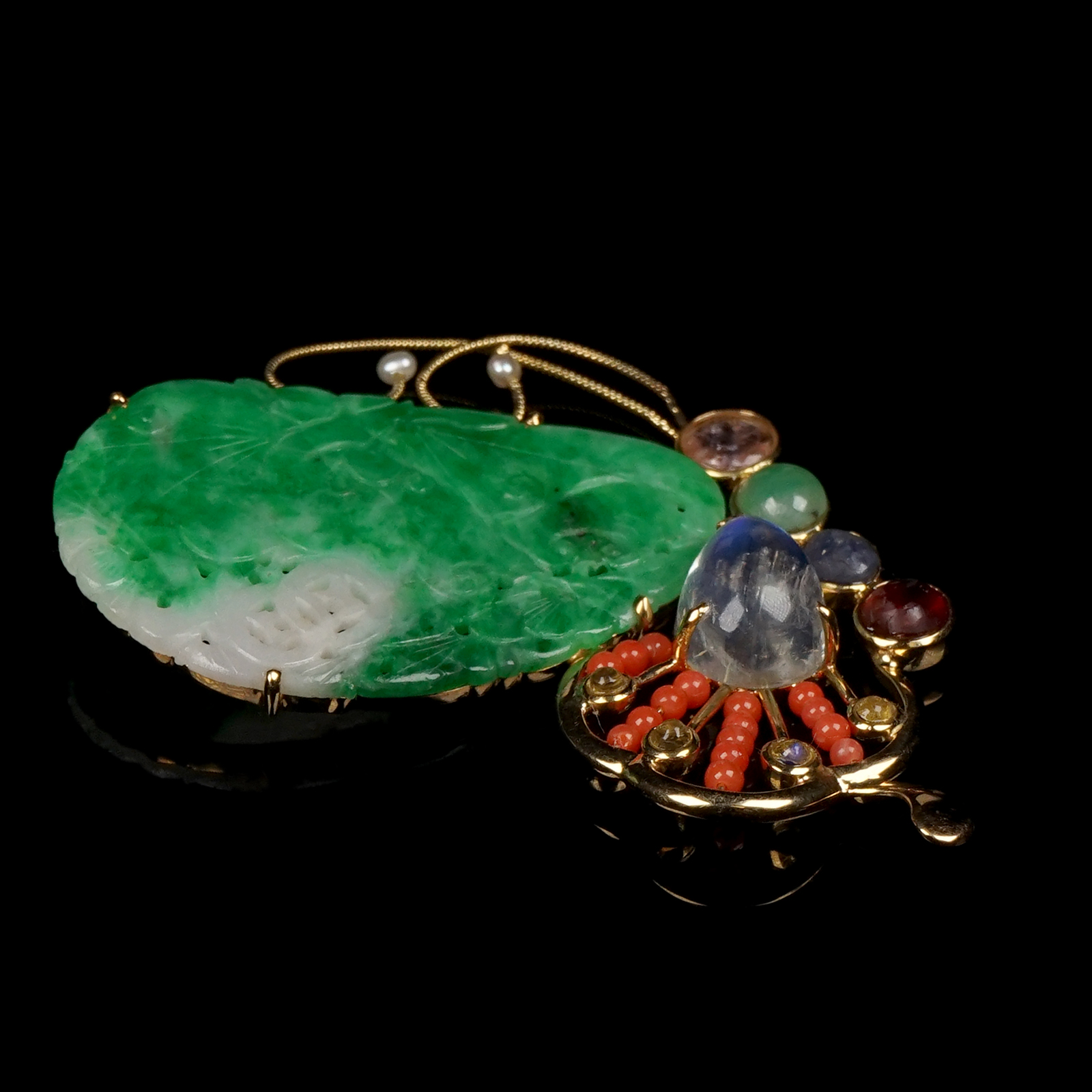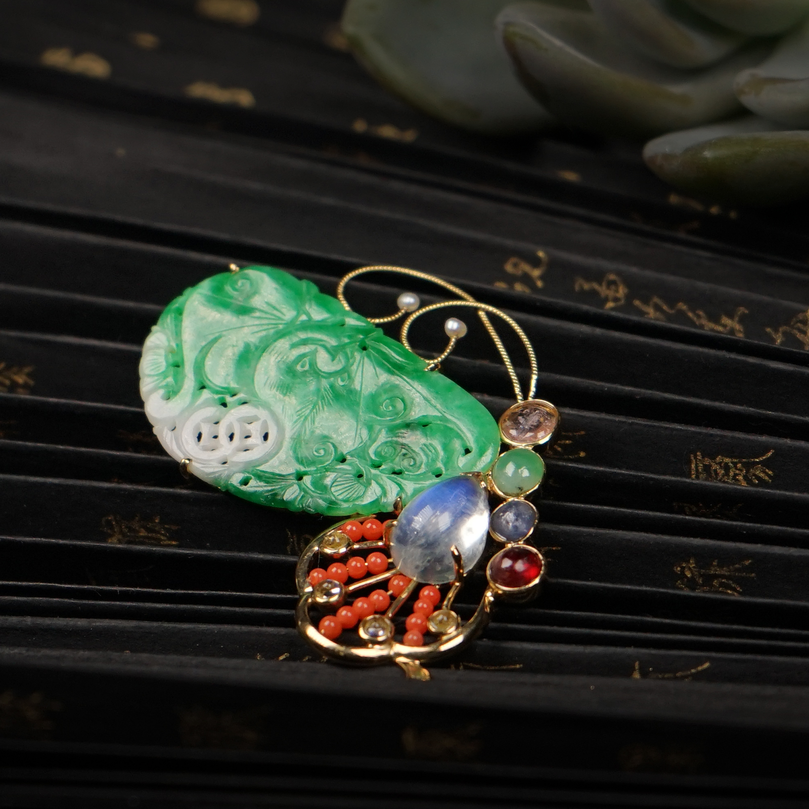 一款有种有色的清代满绿翡翠设计成的项饰胸针两用款。