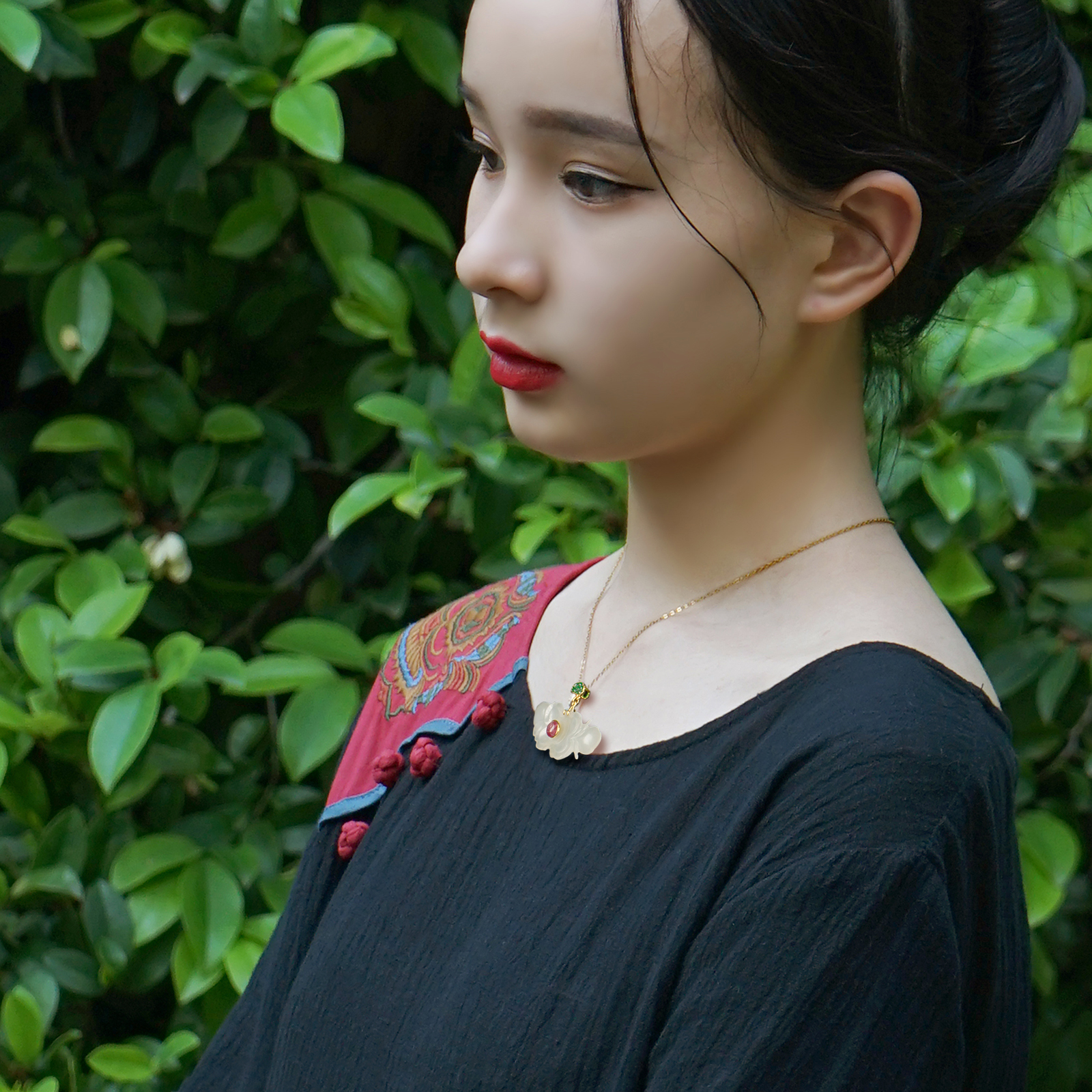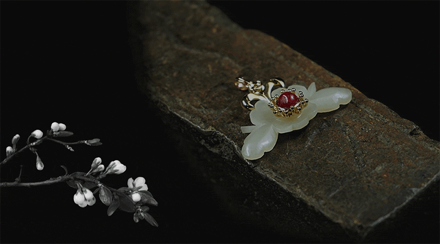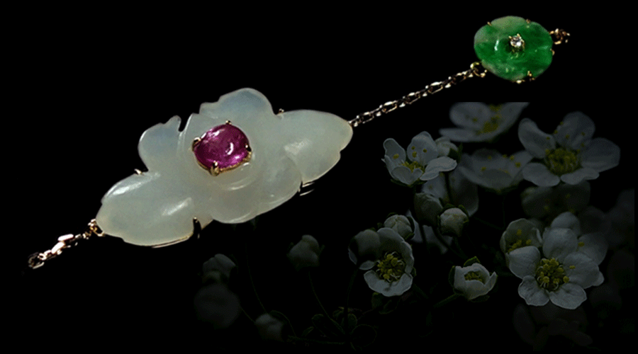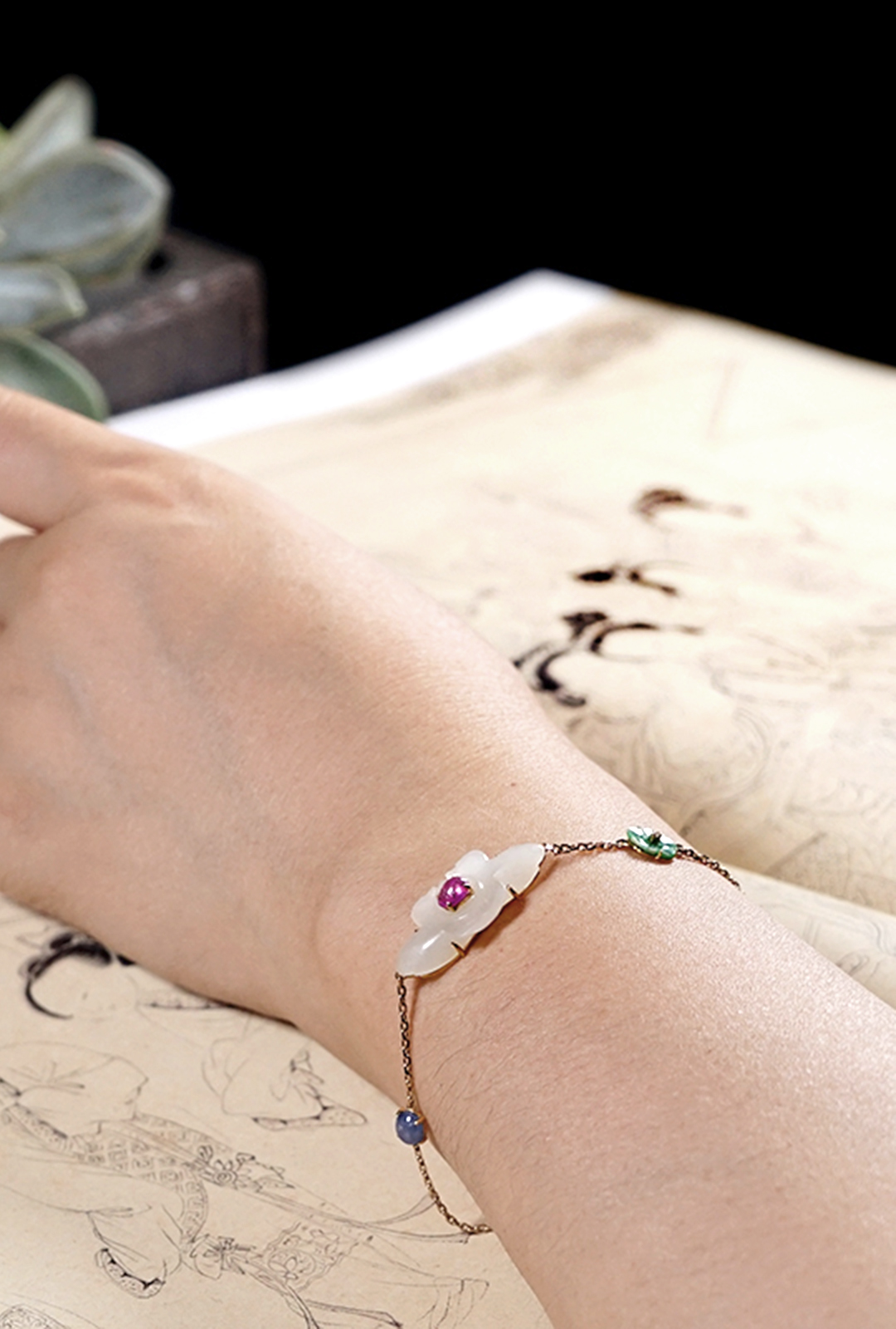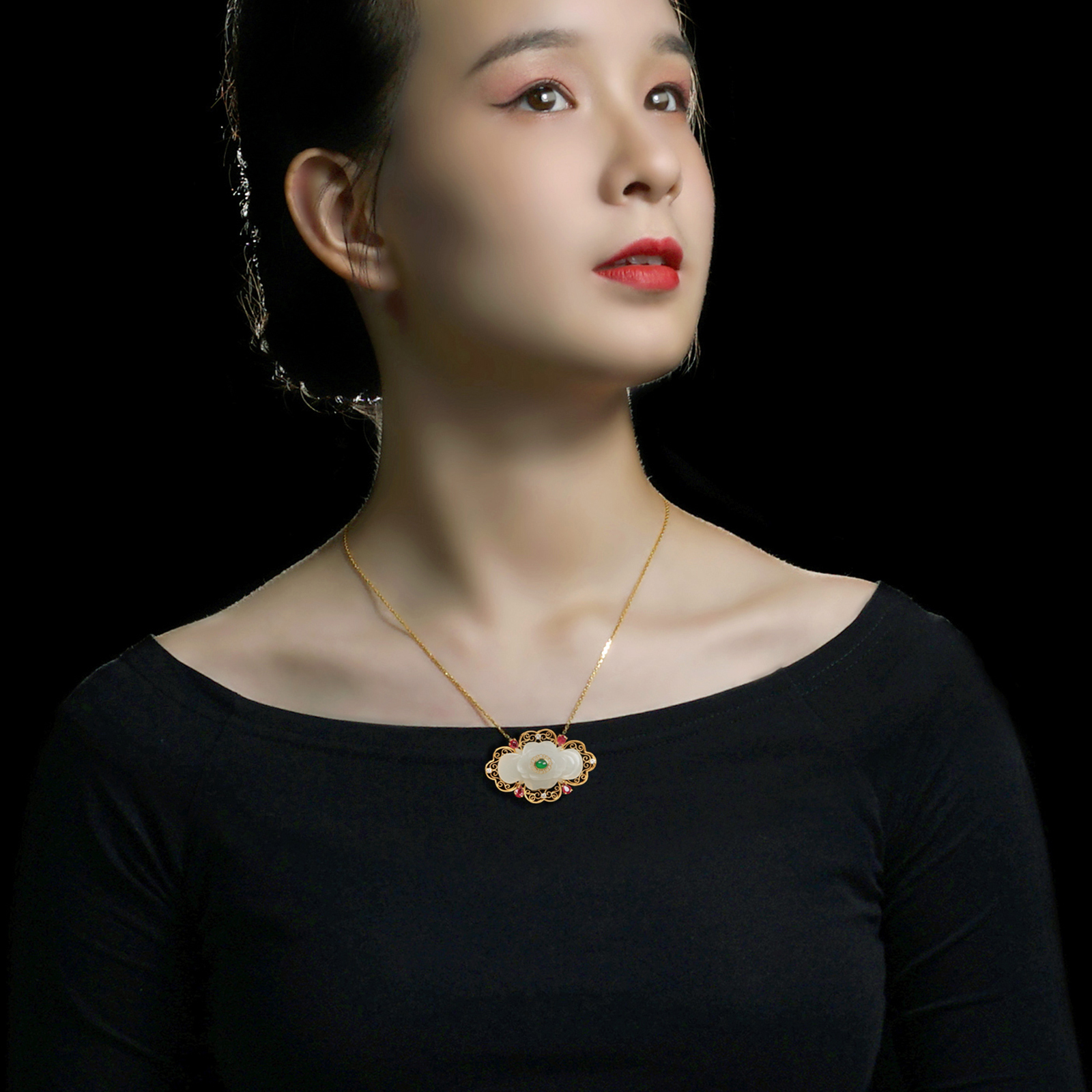 和田白玉洁白无暇,细腻温润,点缀祖母绿,娇媚里平添一份高贵冷静。