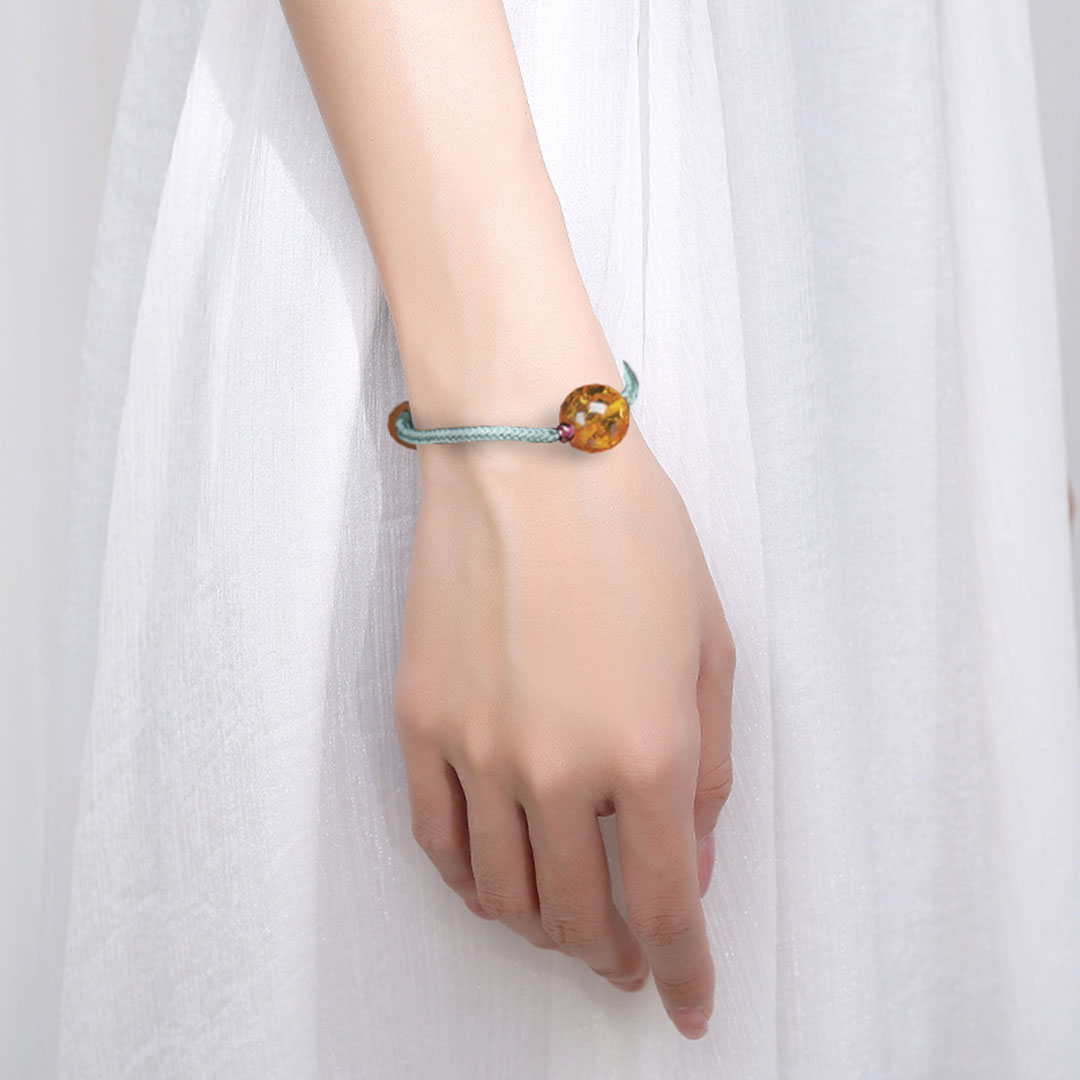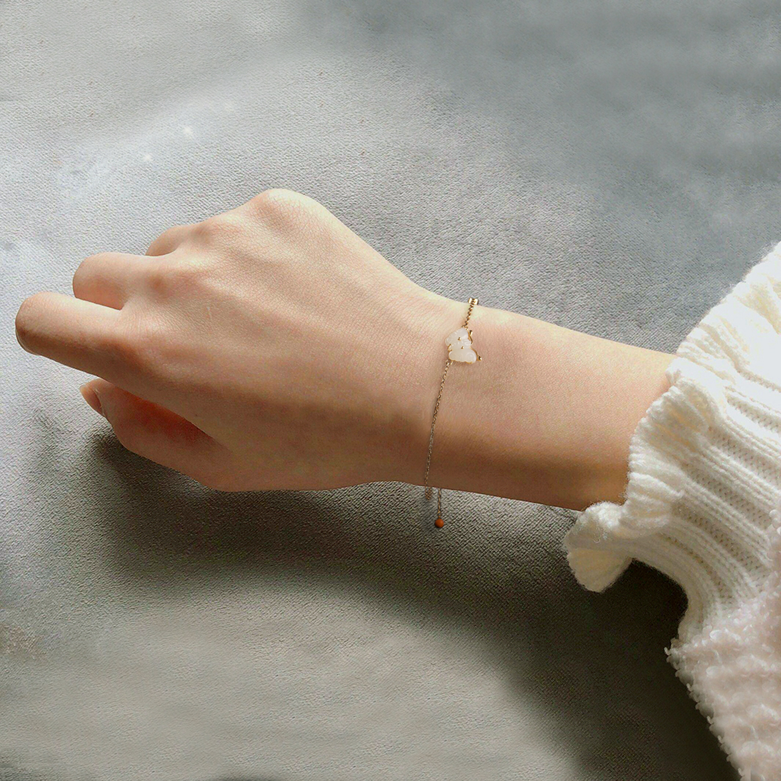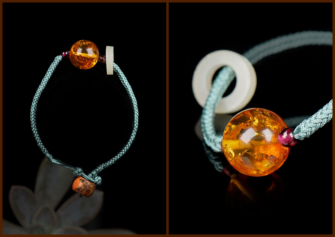 这是一款设计非常别致,上手非常吸引目光的手链。色调金色迷人的花珀珠,以一枚可以滑动的清代和田白玉小环相衬,整款风格又热烈,又沉静,用李敖评价胡因梦的话,又漂亮又漂泊,又迷人又迷茫,又优游又优秀,又不可理解又不可理喻,真的太贴切了。
