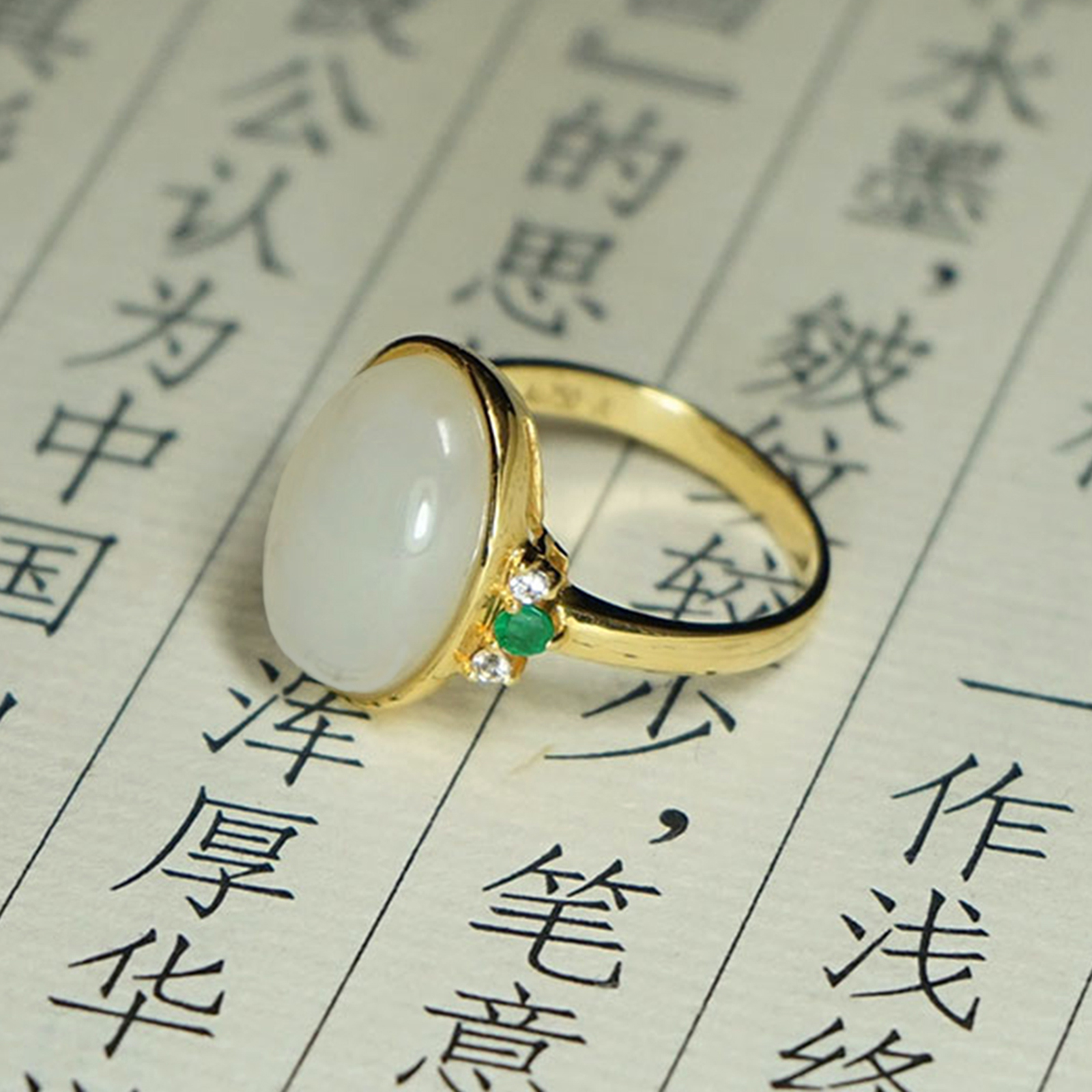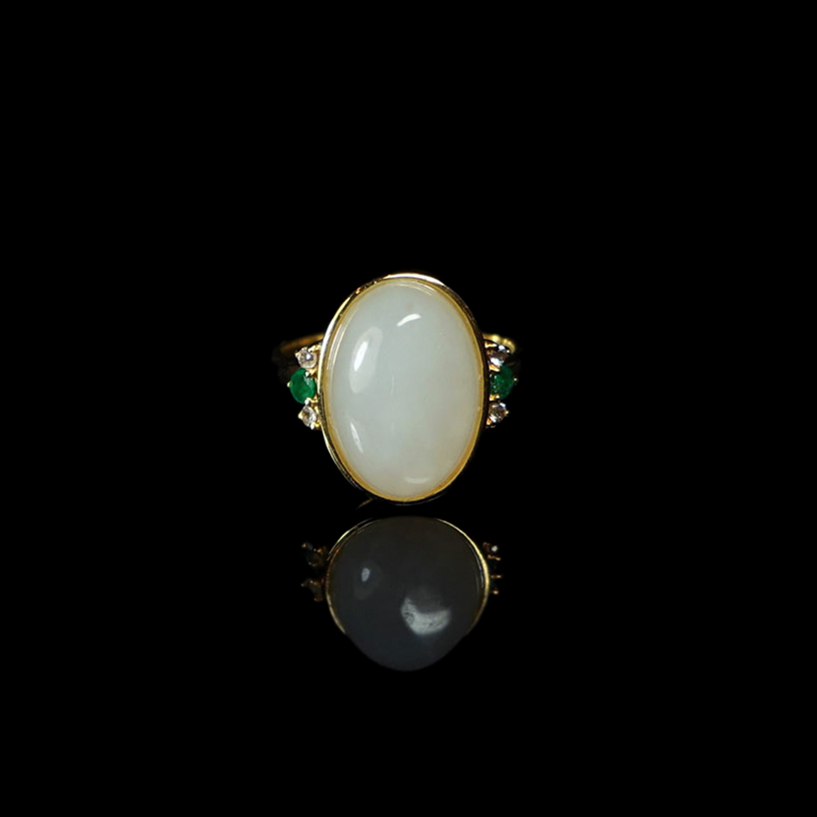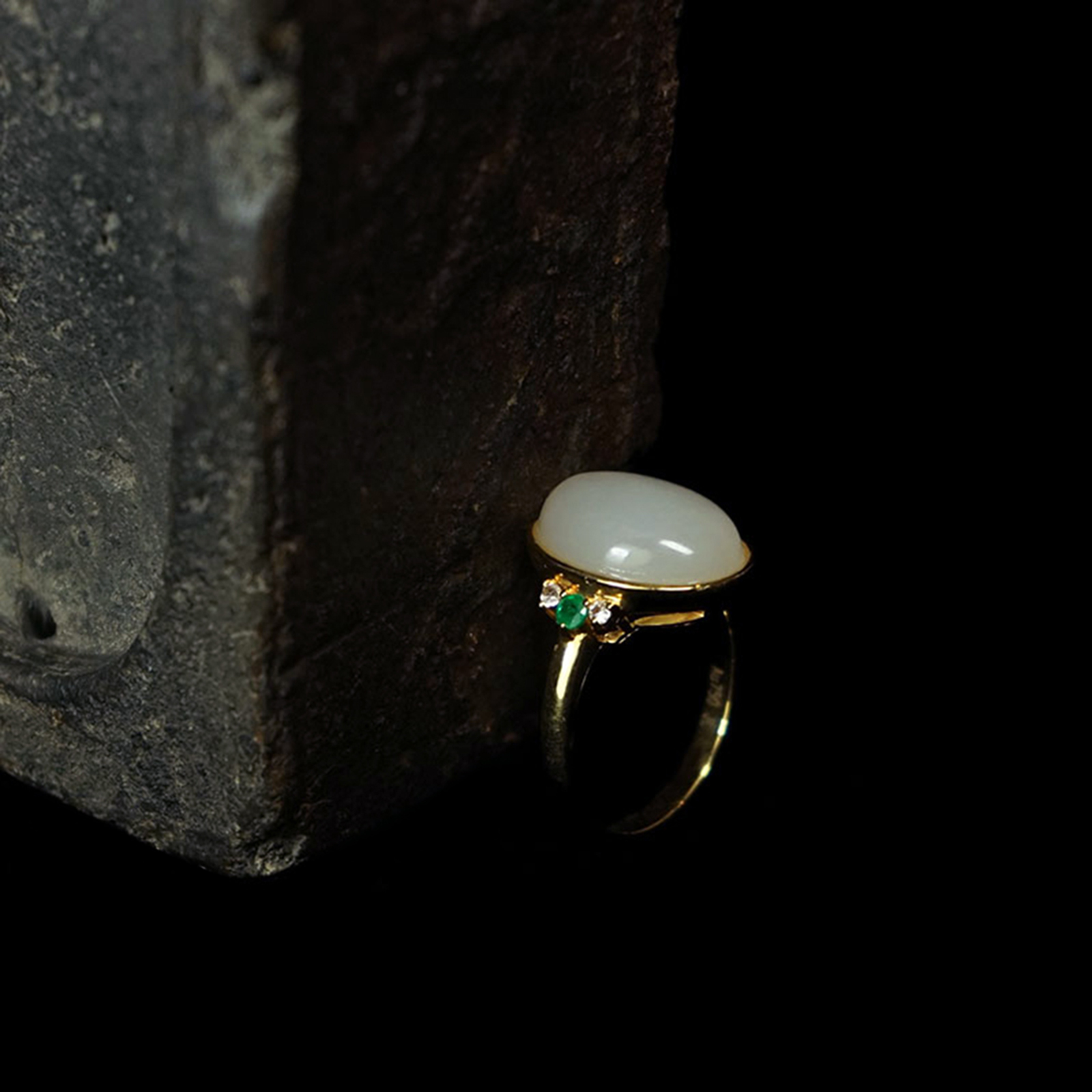 一款上手效果极佳的和田白玉祖母绿戒指。