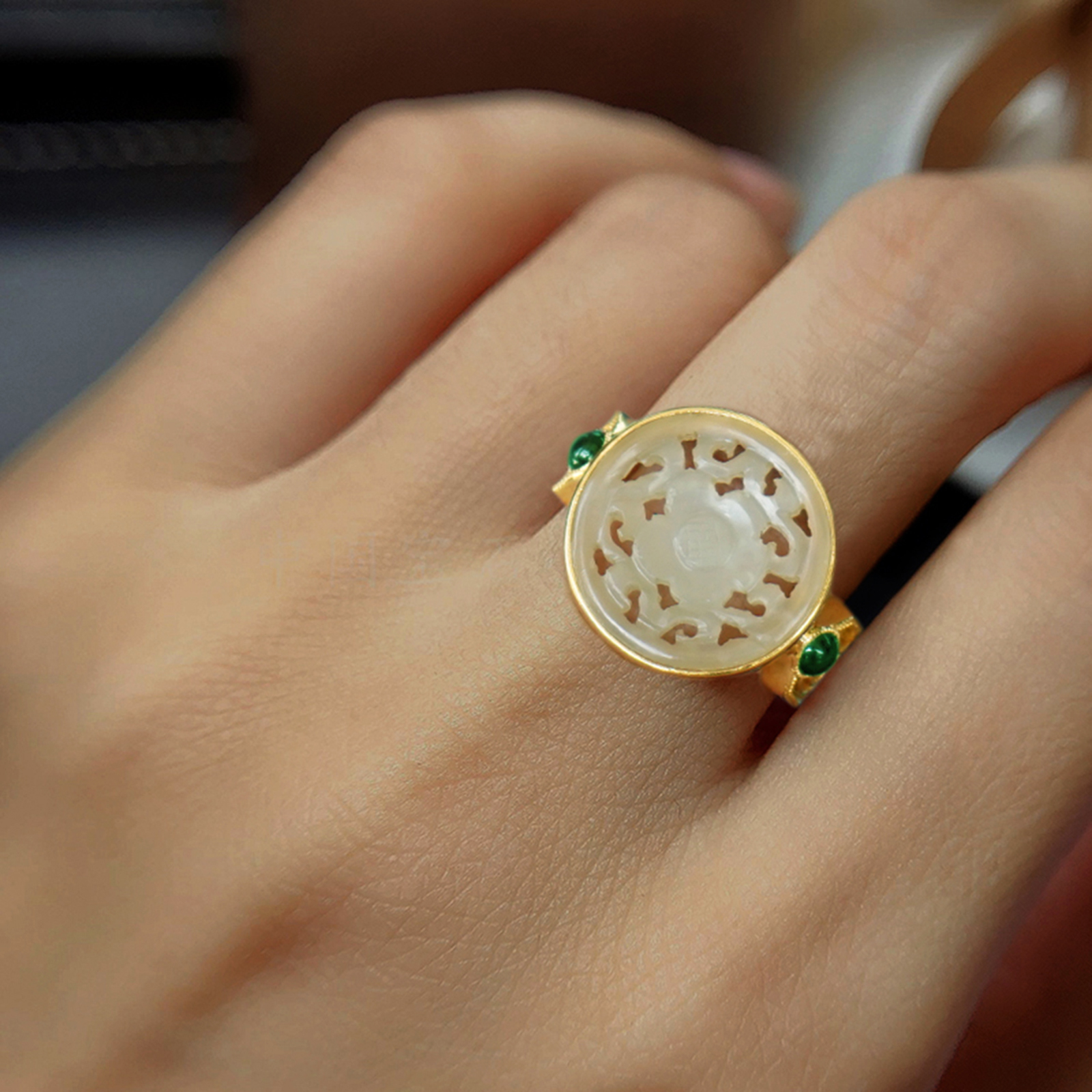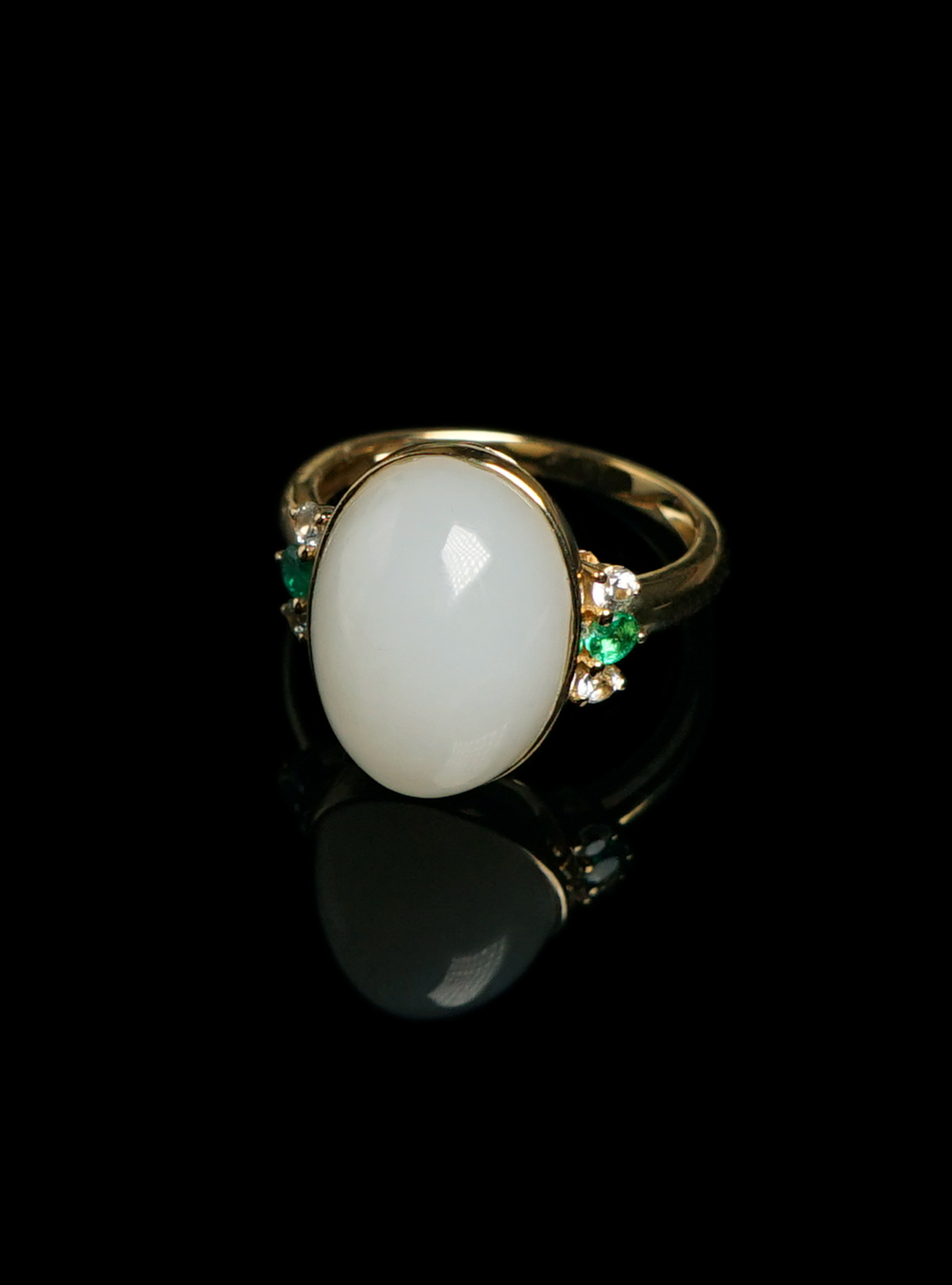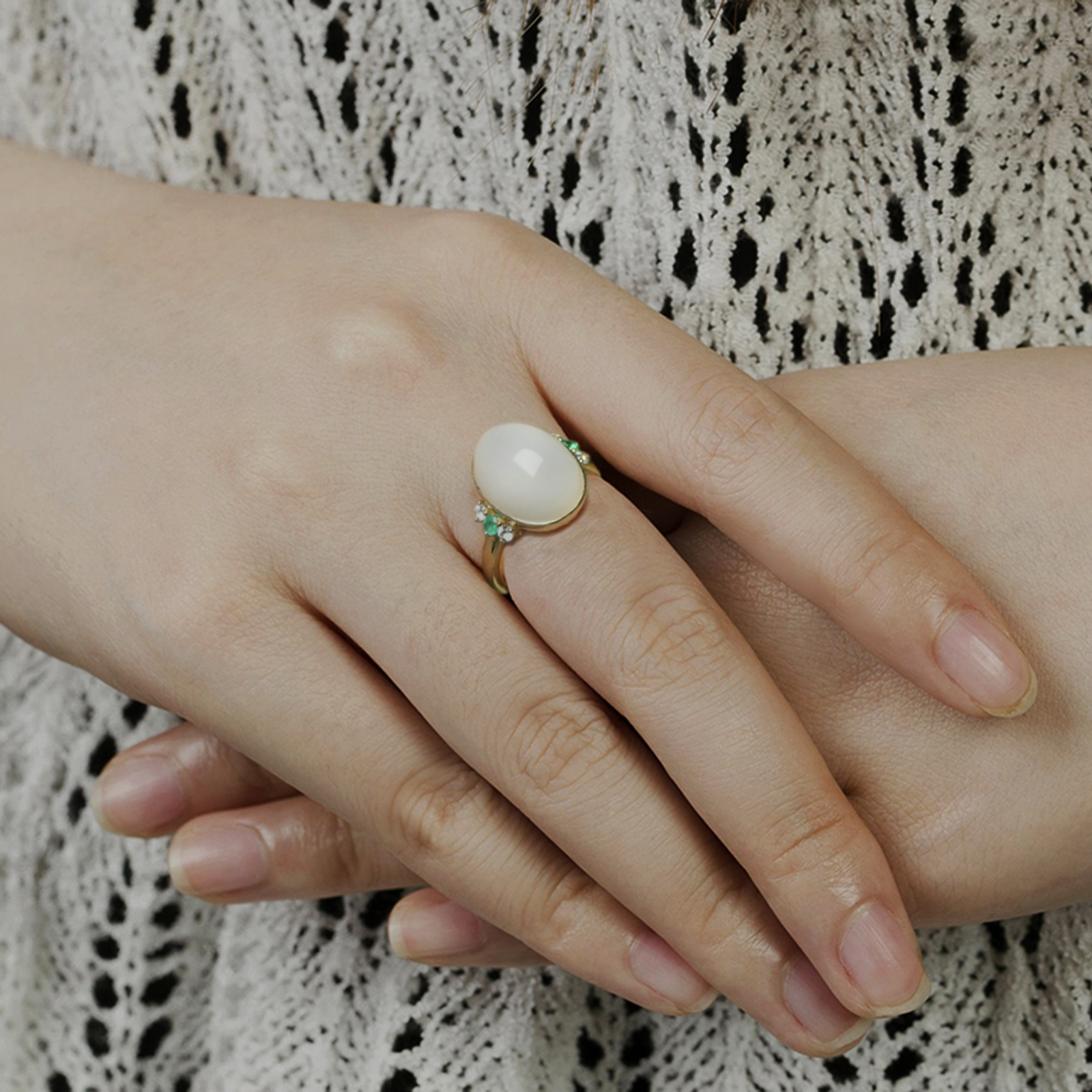 一款上手效果极佳的和田白玉祖母绿戒指。