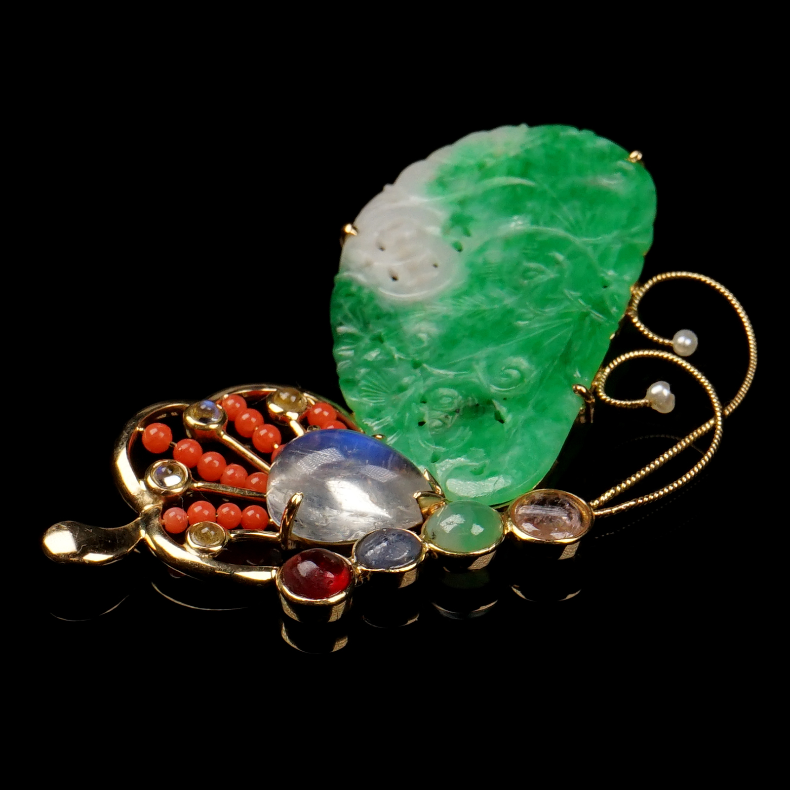 一款清代阳绿翡翠蝴蝶,雕刻工艺细致精湛,身姿优美,色泽悦目动人。