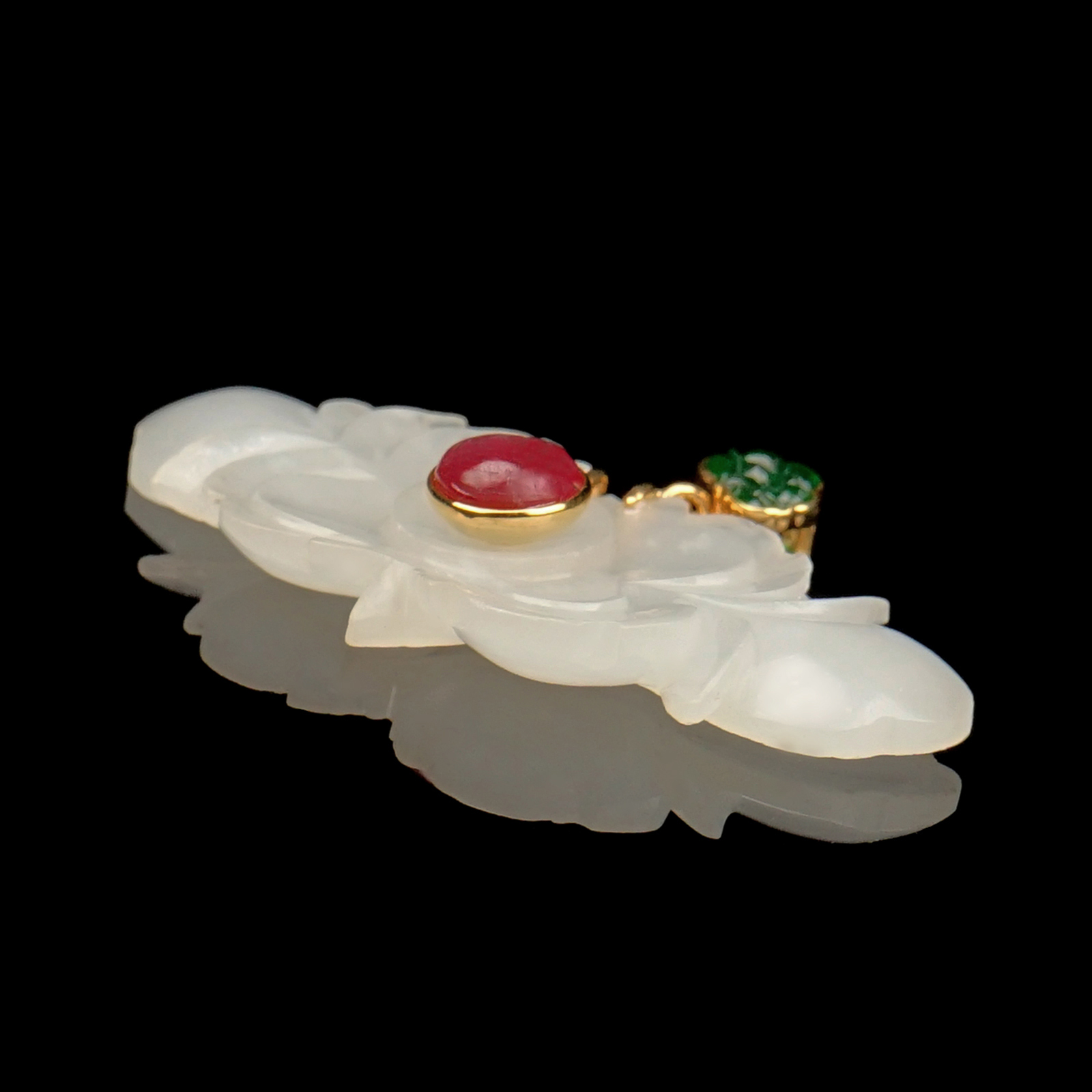 此款清代和田白玉宝相花,玉质一流,细密紧致,洁白莹润,打洼工艺精湛,光气十足。以翡翠红宝相衬,娇艳美丽,是一款不可多得,寓意上佳的小精品。