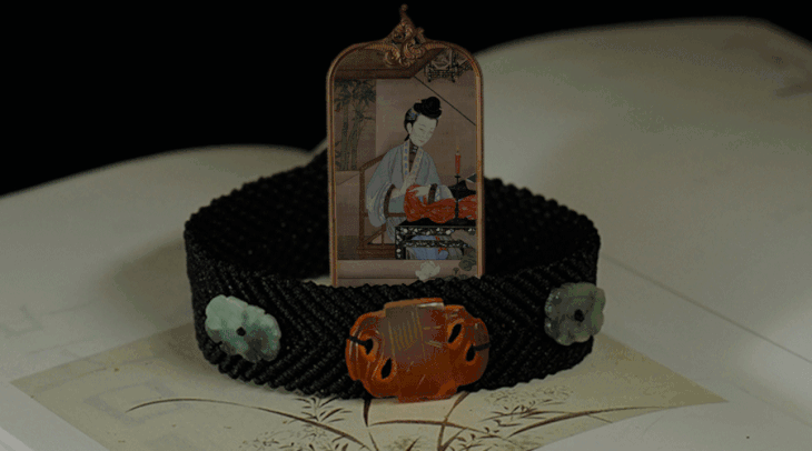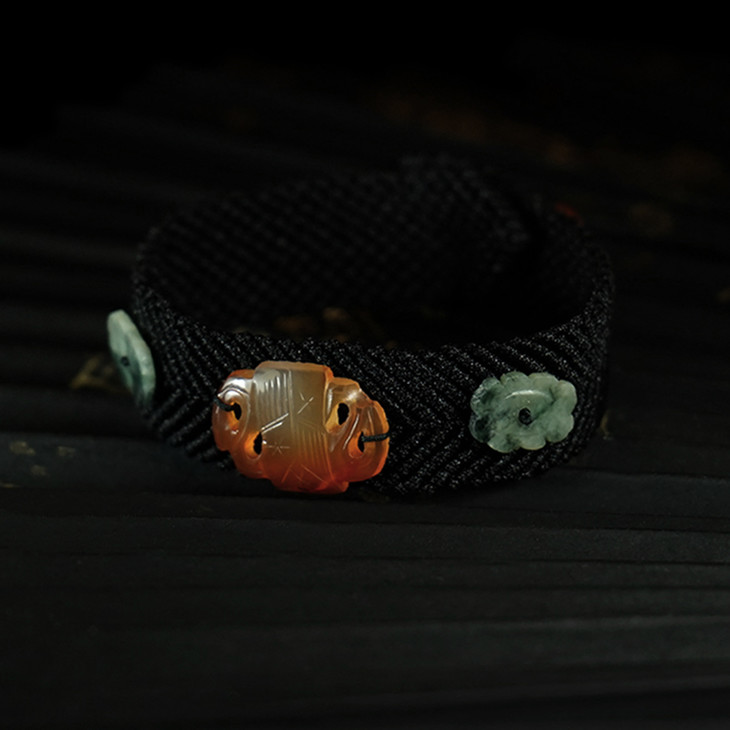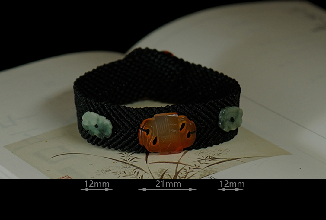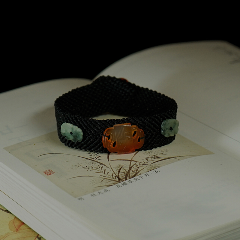 此款腕饰采用典雅的中国绳艺,玛瑙两侧缀老翡翠,收尾处是一粒老玛瑙扣子,整款腕饰古意盎然,又有历史的意蕴。
