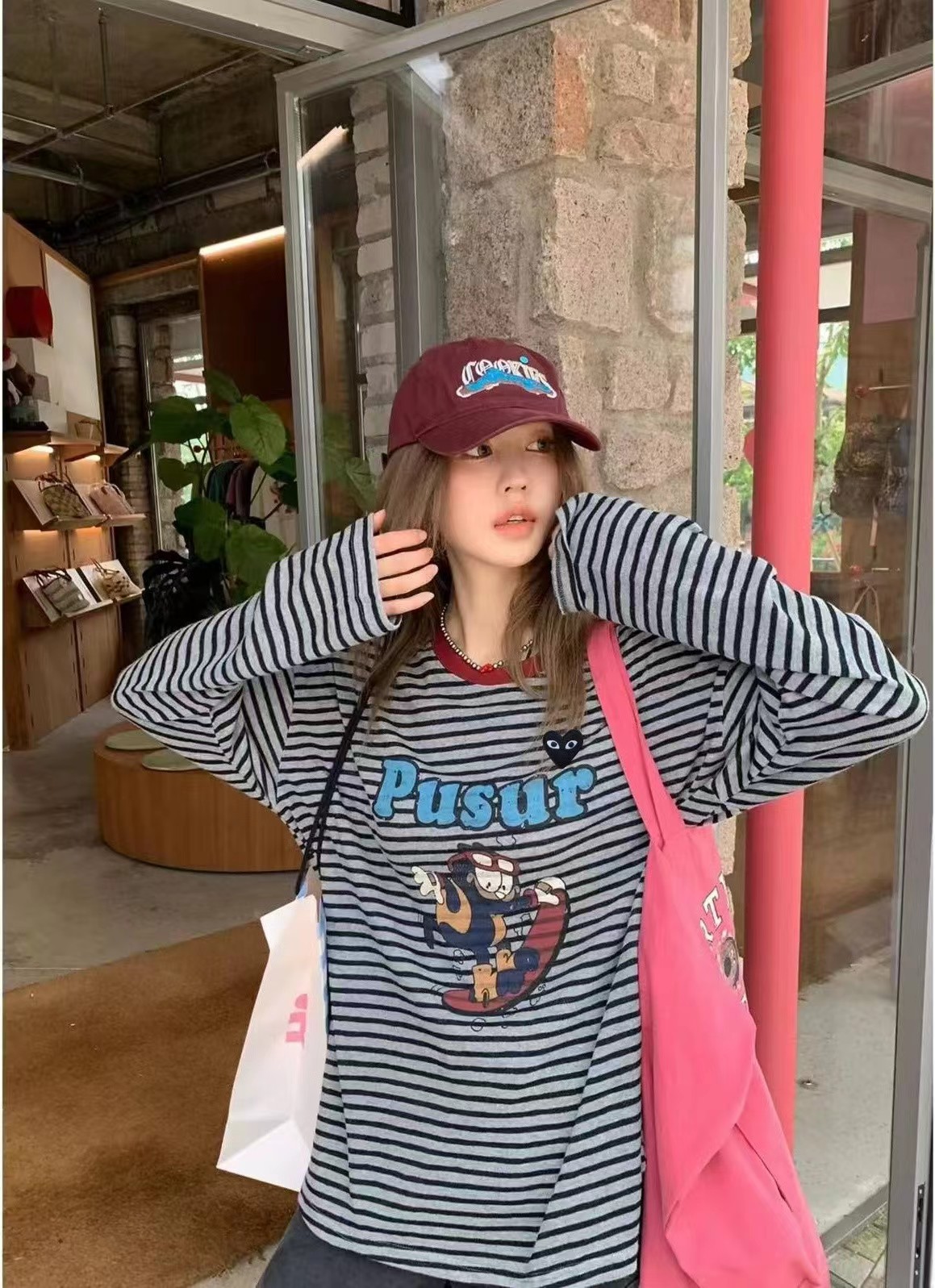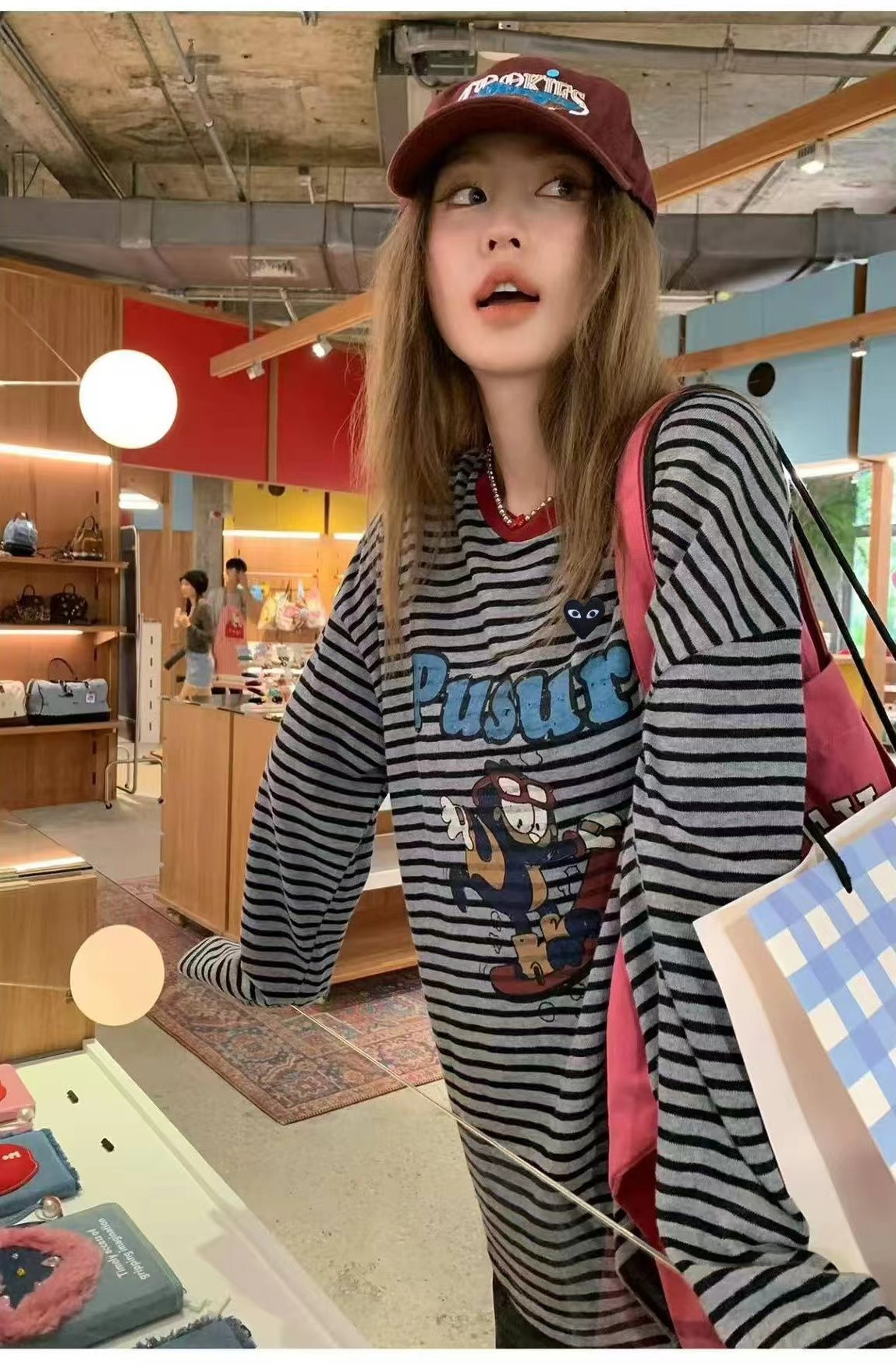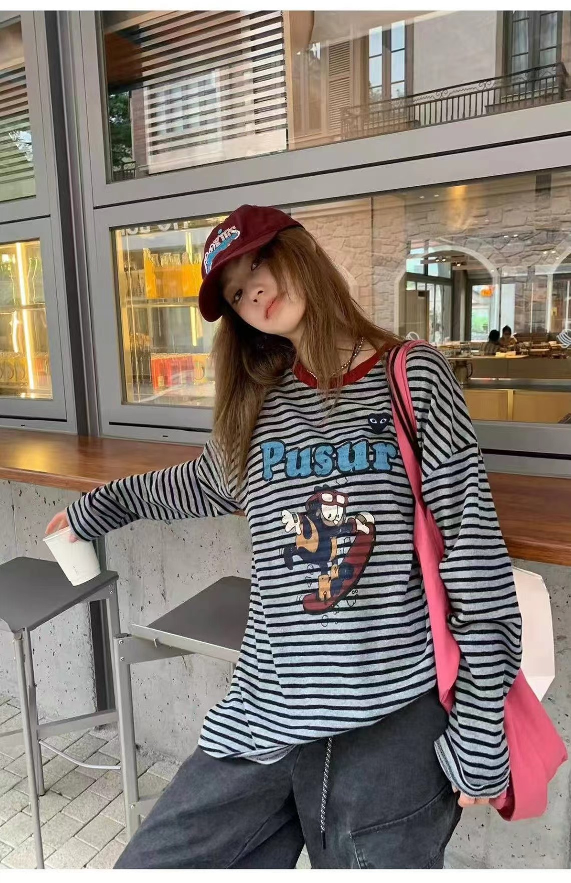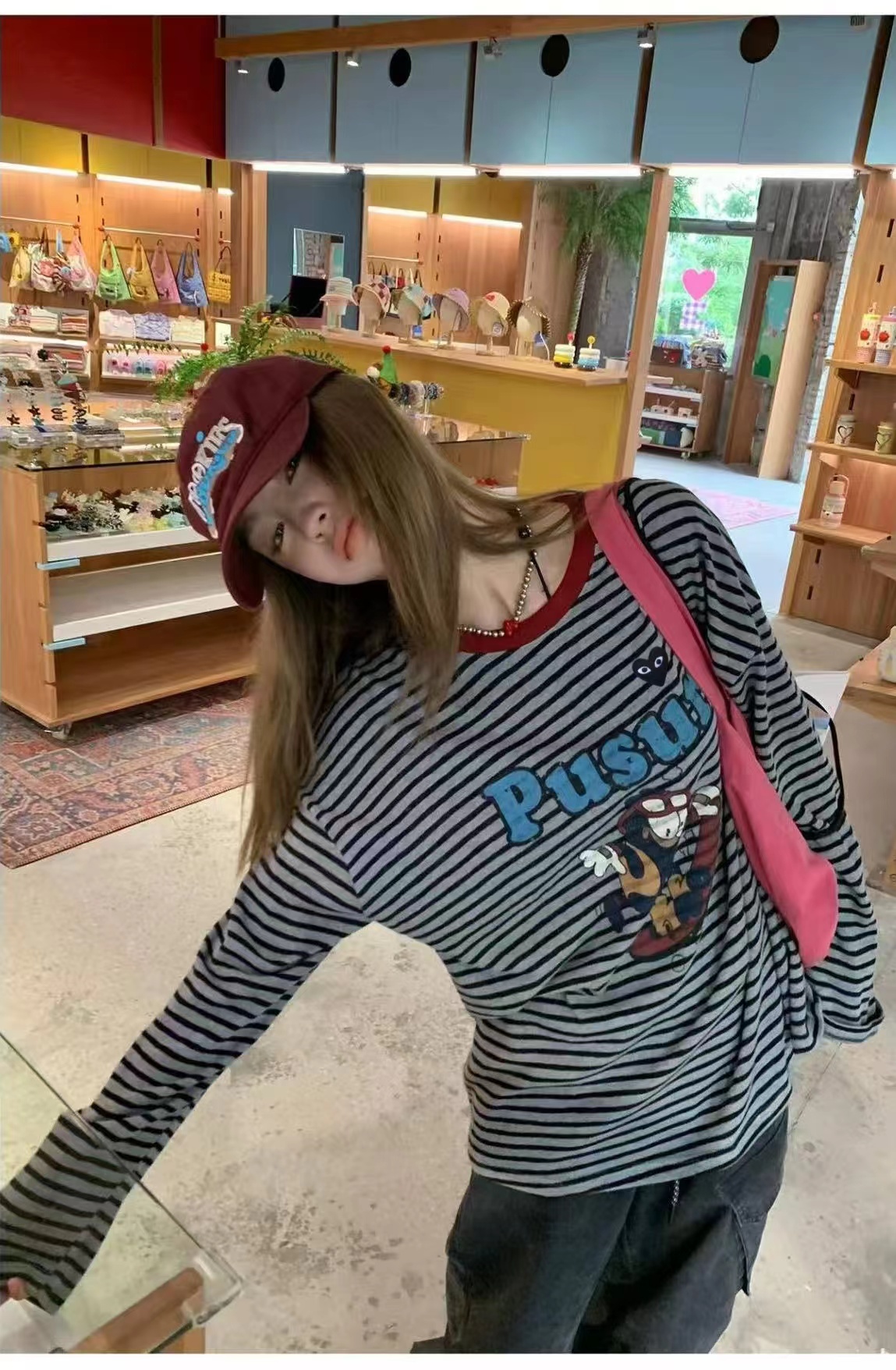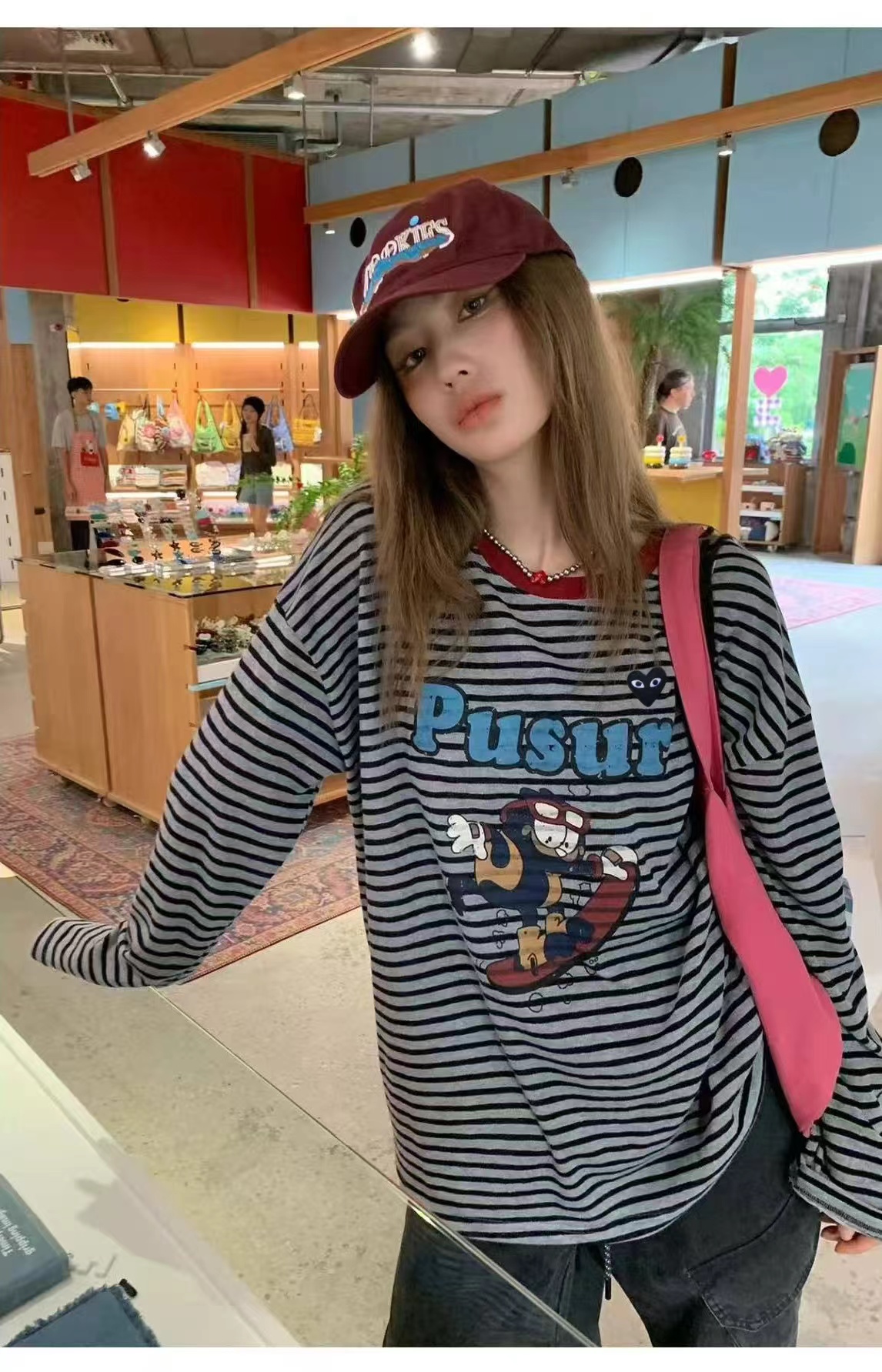 卡通条纹T恤日系复古街头风的活力穿搭,左胸的带眼睛的黑色爱心刺绣,灰底+黑细条纹,复古慵懒,视觉显瘦酒红色罗纹圆领,撞色点缀,提升复古氛围正面印有卡通滑板形象,充满美式街头童趣感宽松落肩剪裁,慵懒随性,适合下装失踪或搭配裤装正面有字母刺绣,与领口颜色呼应,打造美式复古感,修饰脸型叠戴在领口,增加层次感柔和甜美的配色,中和了条纹与卡通的跳脱感,增添温柔氛围休闲随性,强化日常出街感