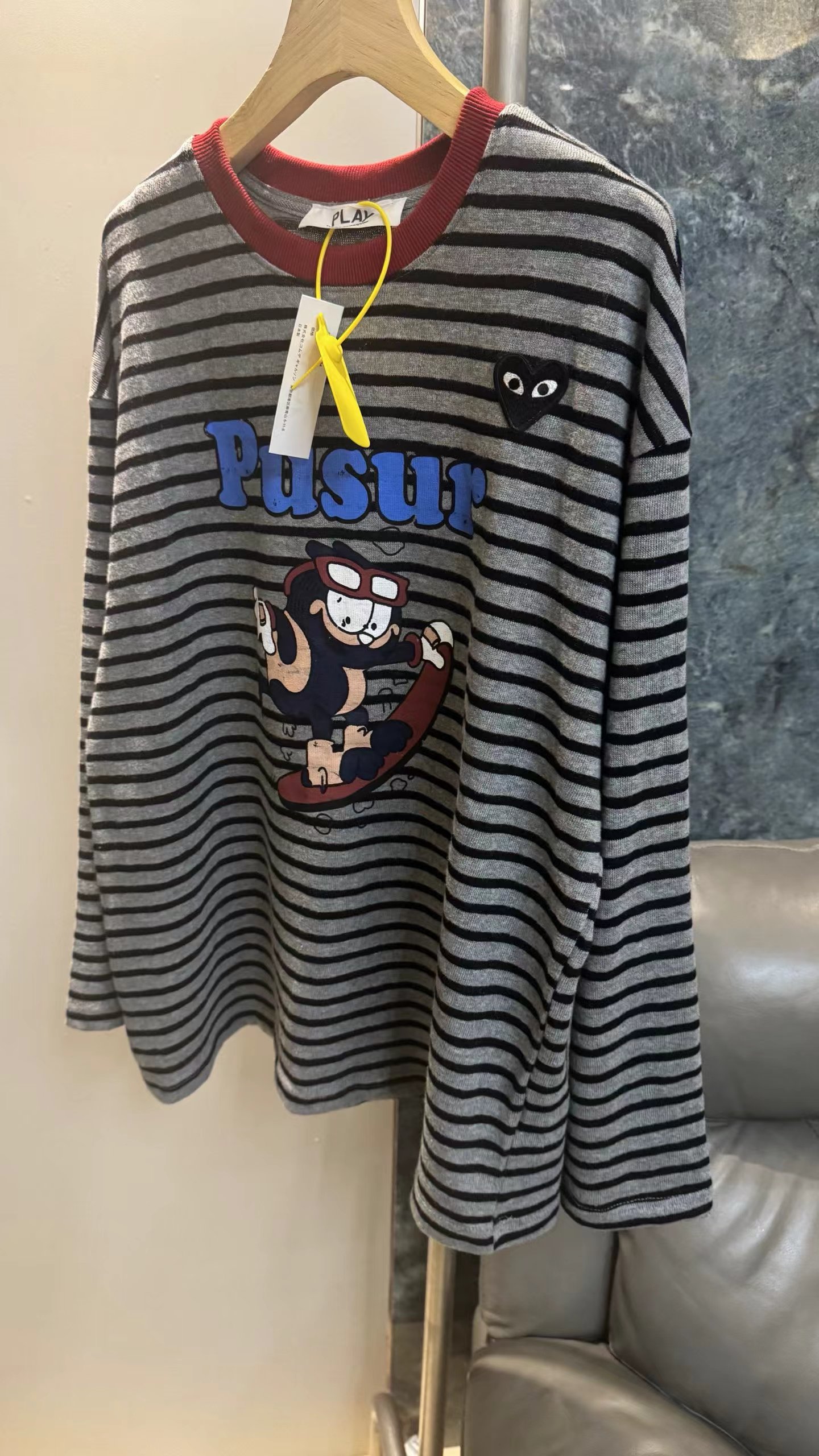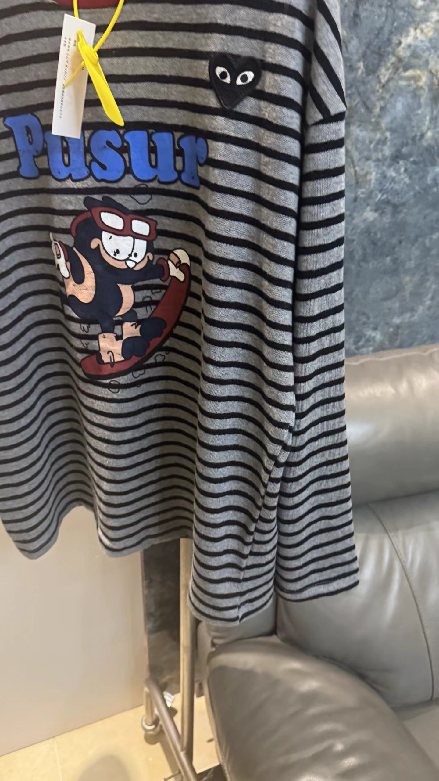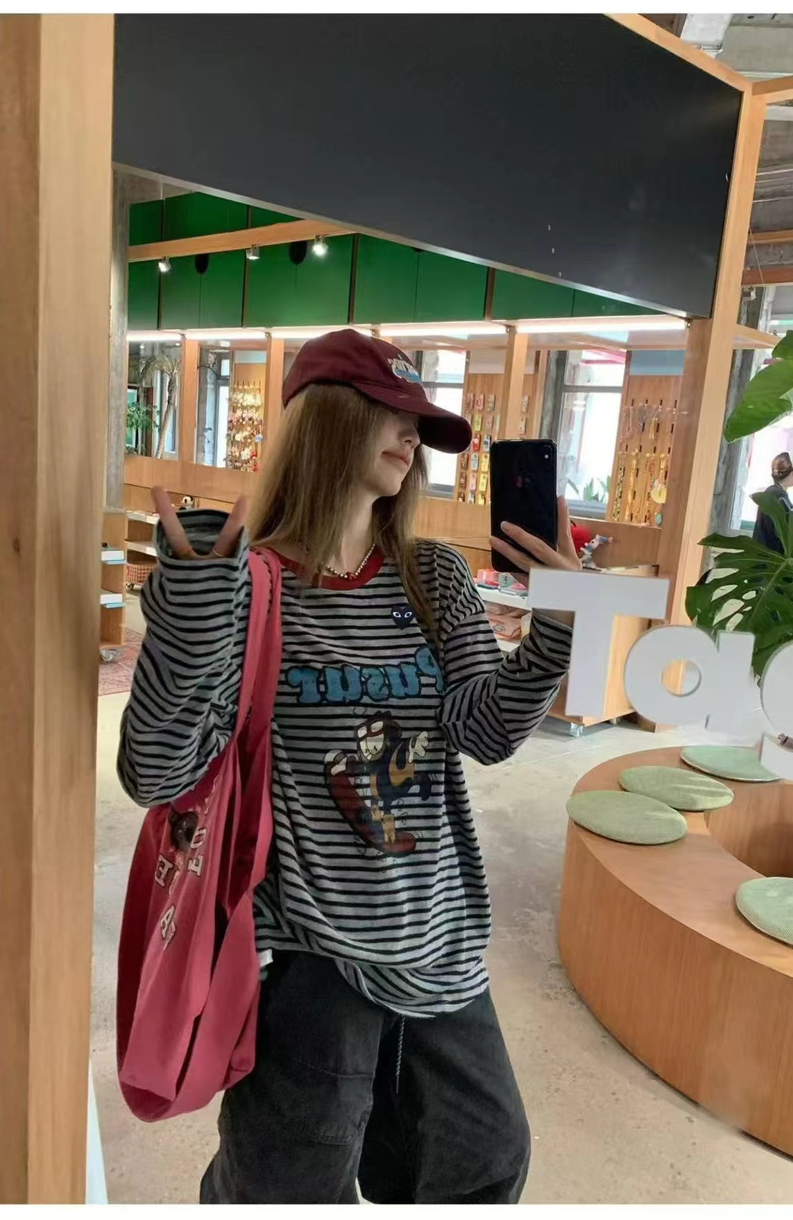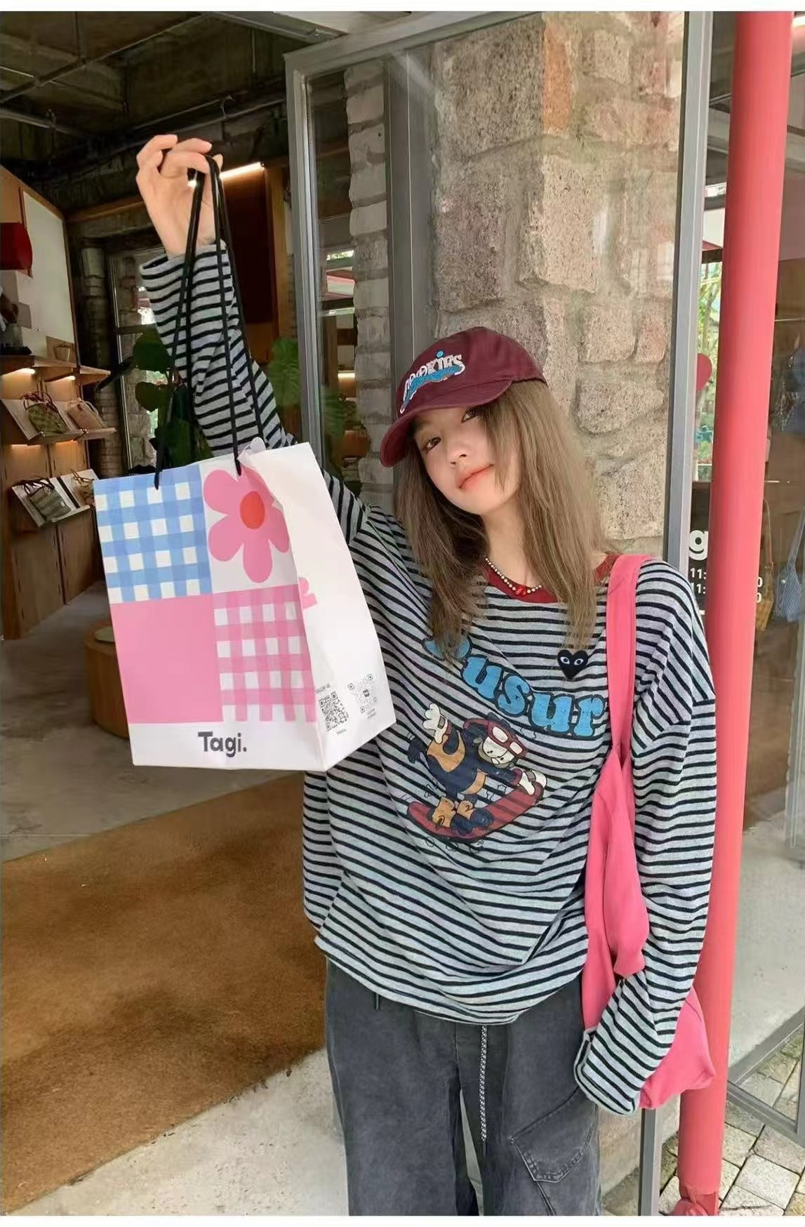 卡通条纹T恤日系复古街头风的活力穿搭,左胸的带眼睛的黑色爱心刺绣,灰底+黑细条纹,复古慵懒,视觉显瘦酒红色罗纹圆领,撞色点缀,提升复古氛围正面印有卡通滑板形象,充满美式街头童趣感宽松落肩剪裁,慵懒随性,适合下装失踪或搭配裤装正面有字母刺绣,与领口颜色呼应,打造美式复古感,修饰脸型叠戴在领口,增加层次感柔和甜美的配色,中和了条纹与卡通的跳脱感,增添温柔氛围休闲随性,强化日常出街感