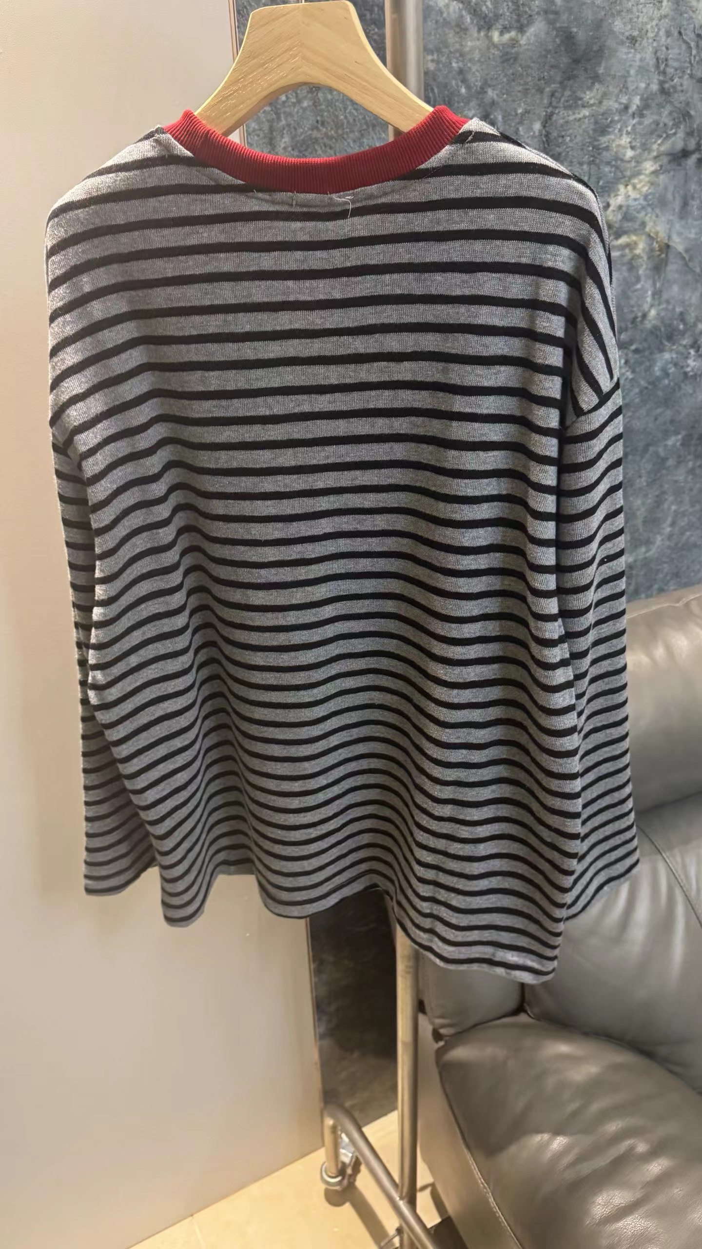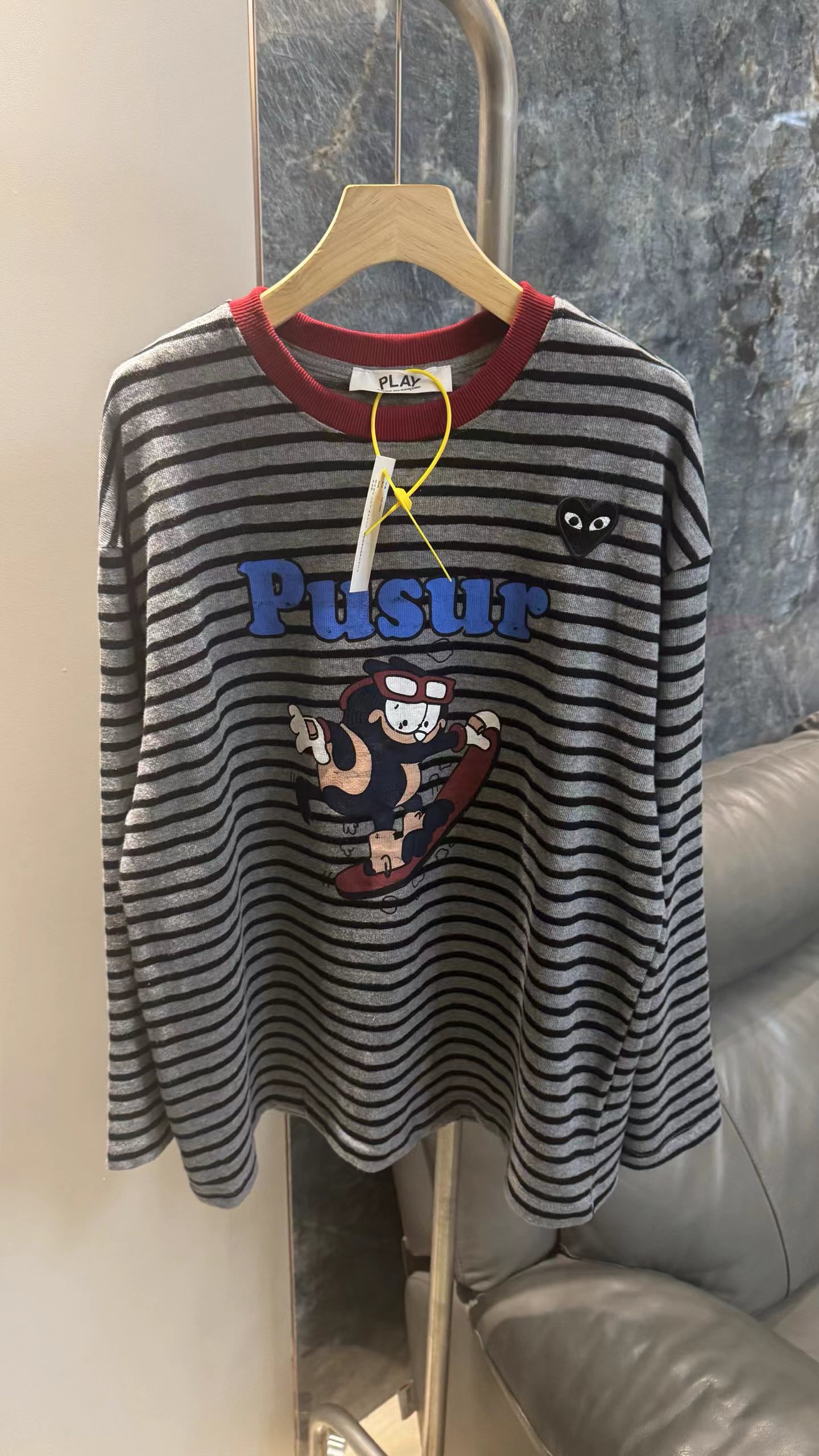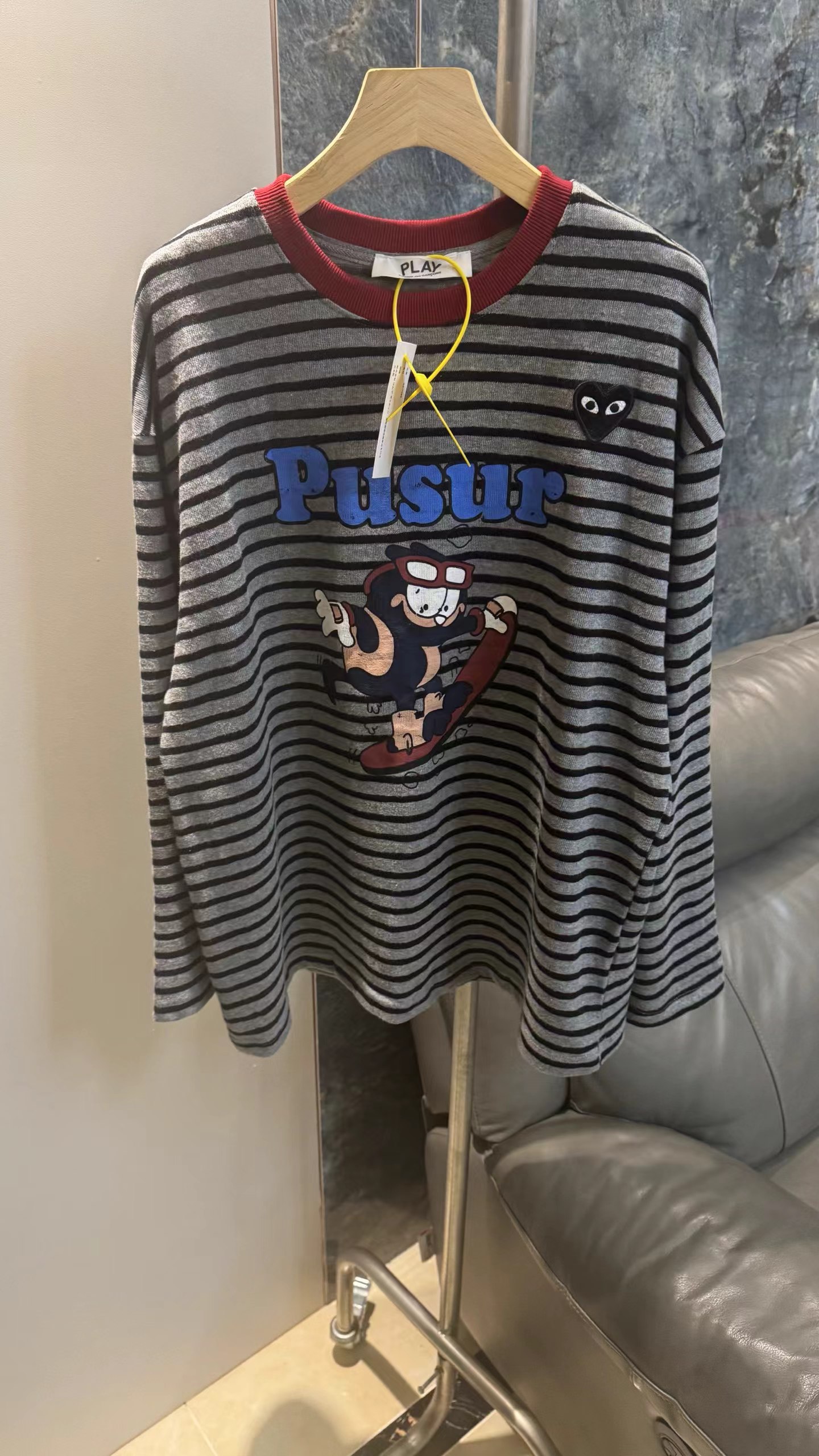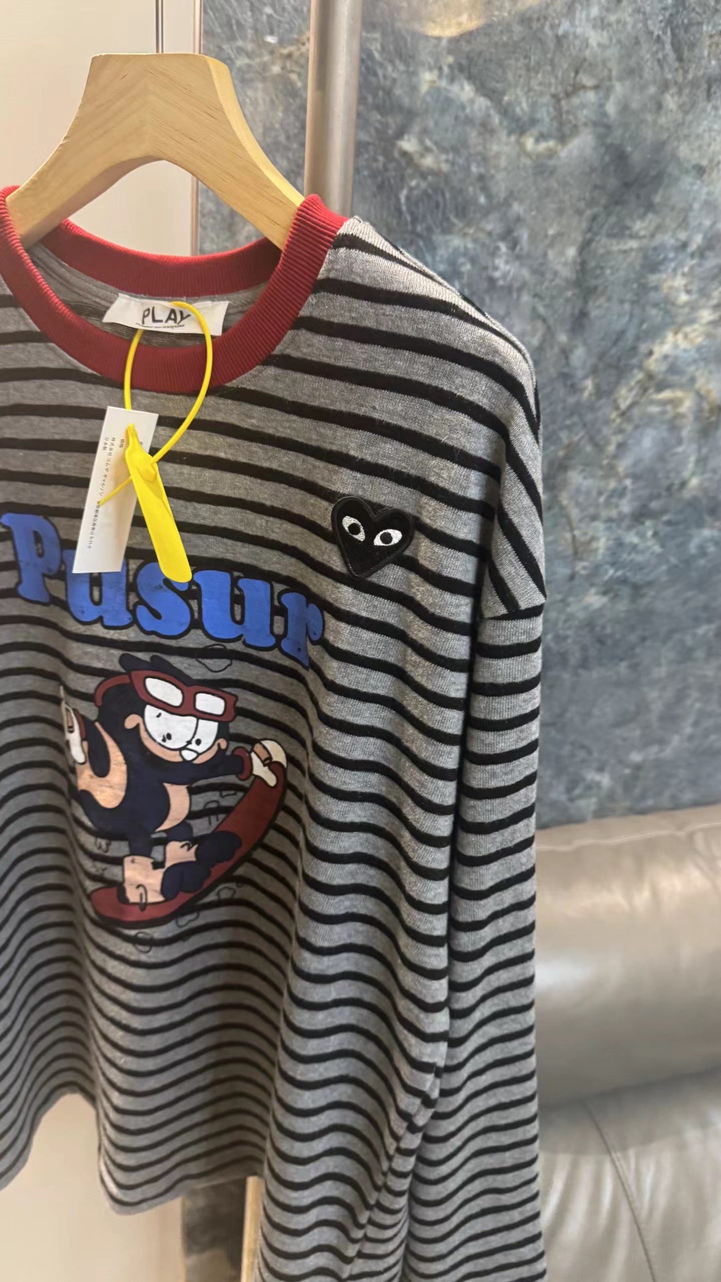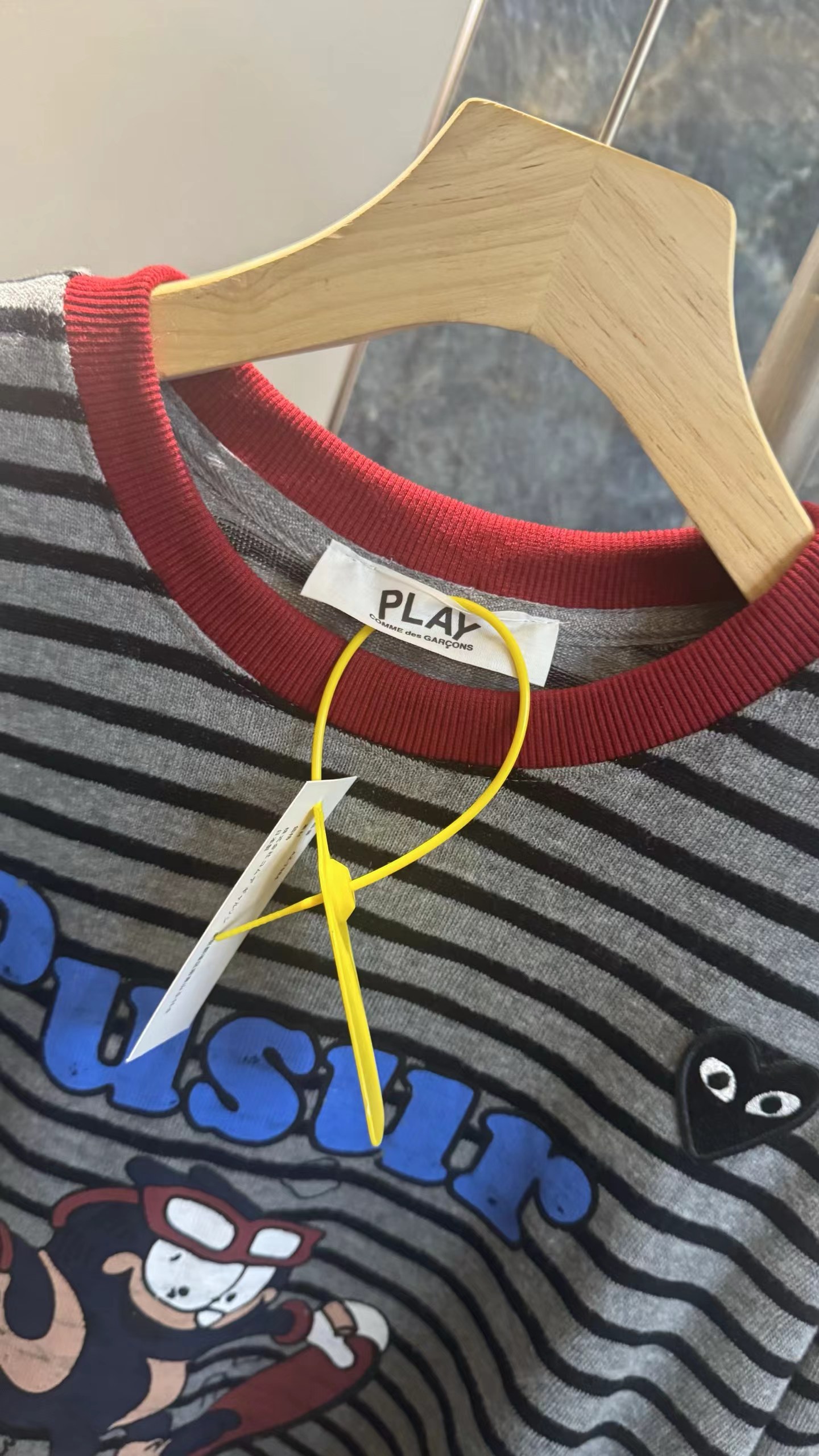 卡通条纹T恤日系复古街头风的活力穿搭,左胸的带眼睛的黑色爱心刺绣,灰底+黑细条纹,复古慵懒,视觉显瘦酒红色罗纹圆领,撞色点缀,提升复古氛围正面印有卡通滑板形象,充满美式街头童趣感宽松落肩剪裁,慵懒随性,适合下装失踪或搭配裤装正面有字母刺绣,与领口颜色呼应,打造美式复古感,修饰脸型叠戴在领口,增加层次感柔和甜美的配色,中和了条纹与卡通的跳脱感,增添温柔氛围休闲随性,强化日常出街感