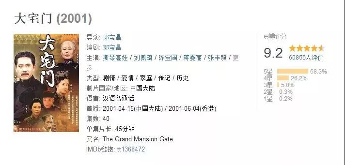 《大宅门》是一部讲述百年老字号“百草厅”药铺的兴衰故事、以及医药世家白府三代人宅门恩怨的电视剧,以17.74点的收视率夺得2001年央视年度收视冠军,至今仍在豆瓣上历史类大陆剧榜中占第二,经典毋庸置疑。