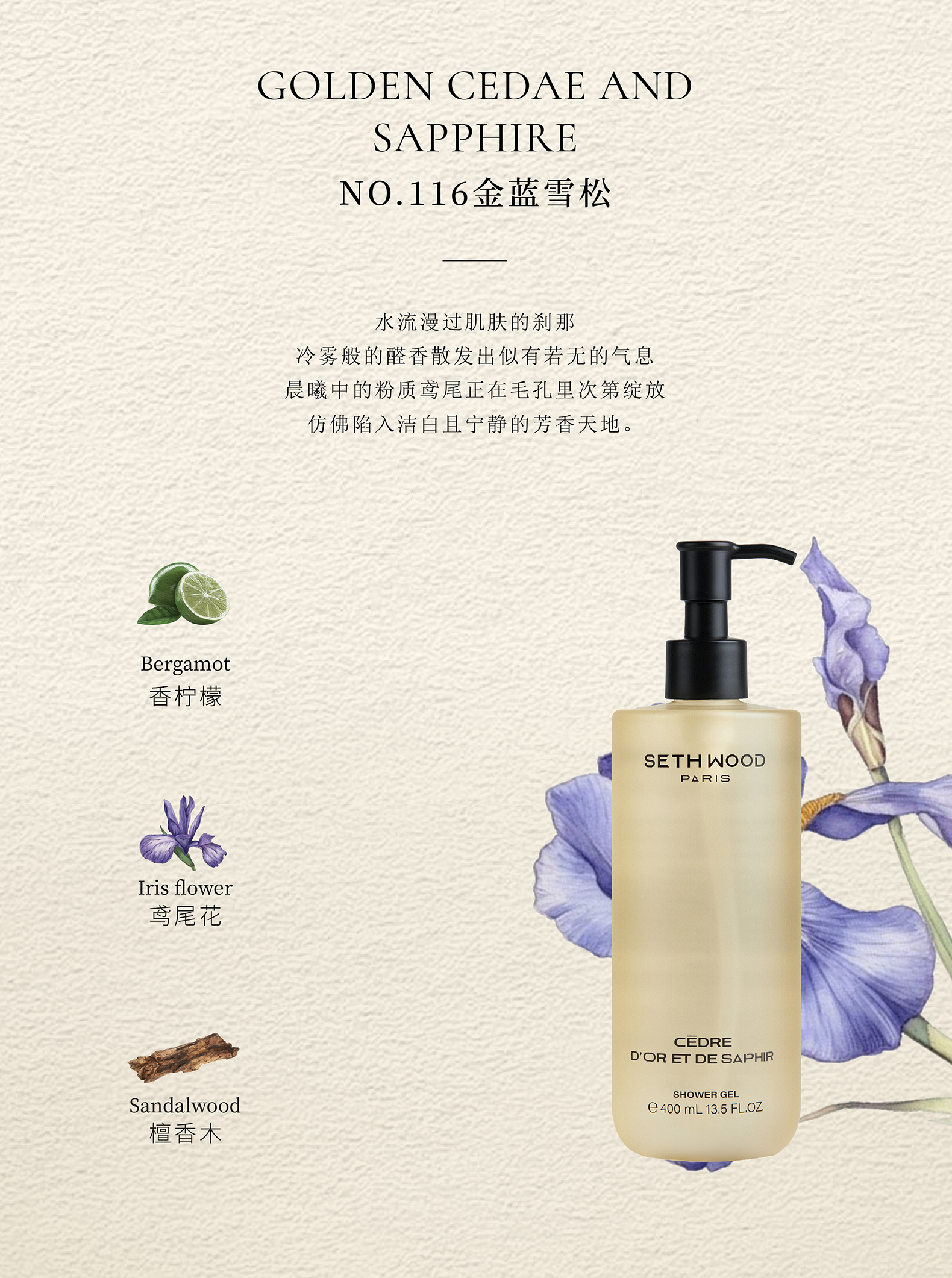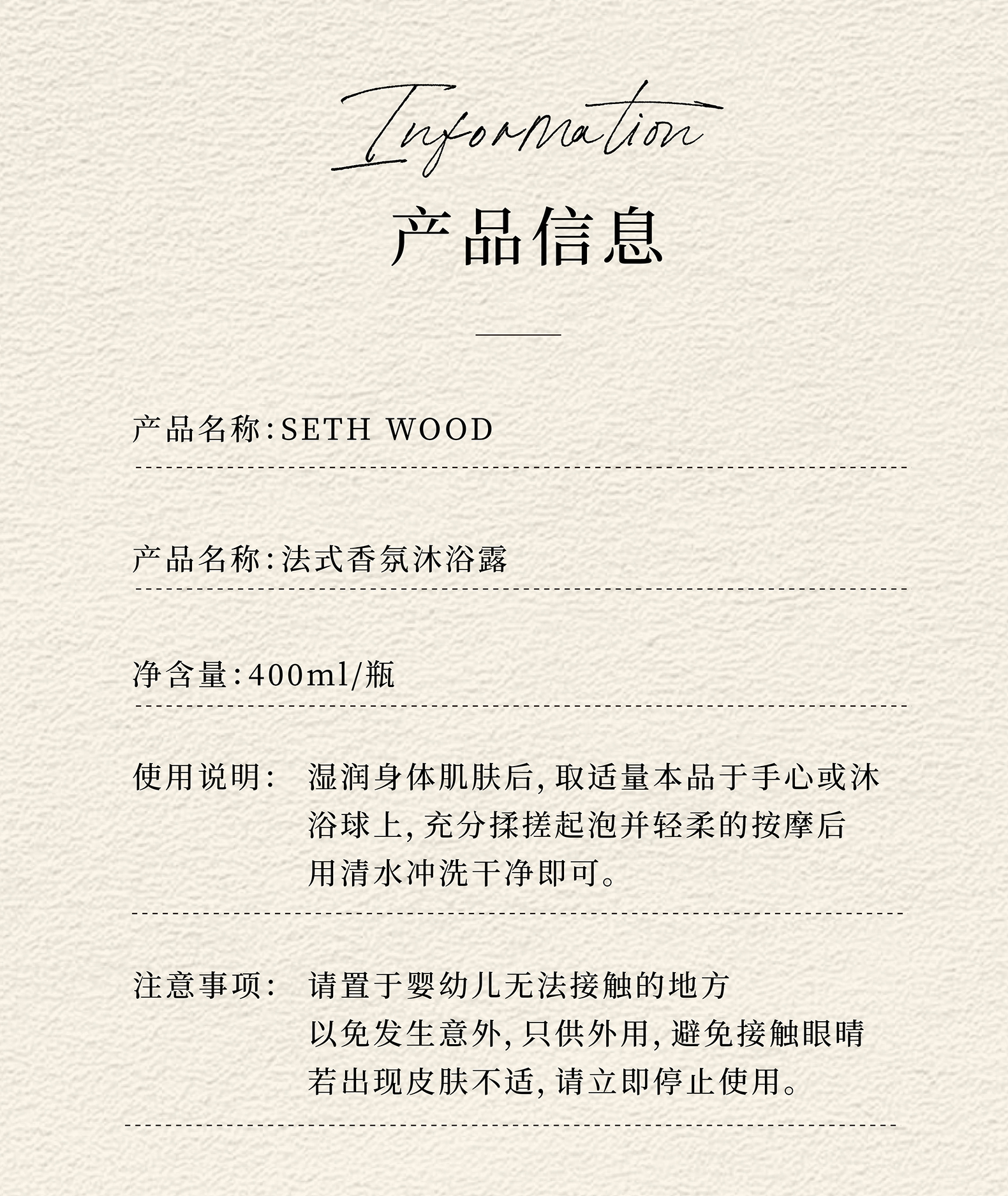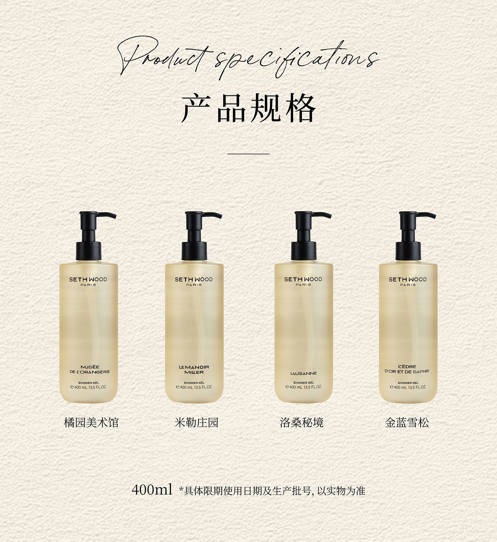 【品名】SETH WOOD塞斯伍德 香氛沐浴露 绵密泡沫 补水保湿 400ml/瓶 【规格】400ml/瓶 【产地】法国 【发货包装】独立包装 【发货地】浙江 【发货快递】中通、申通随机发 【补邮费地区】新疆、西藏、青海+15元 内蒙古、宁夏、甘肃、海南+10元 【发货时效】48-72小时,周末节假日顺延 |