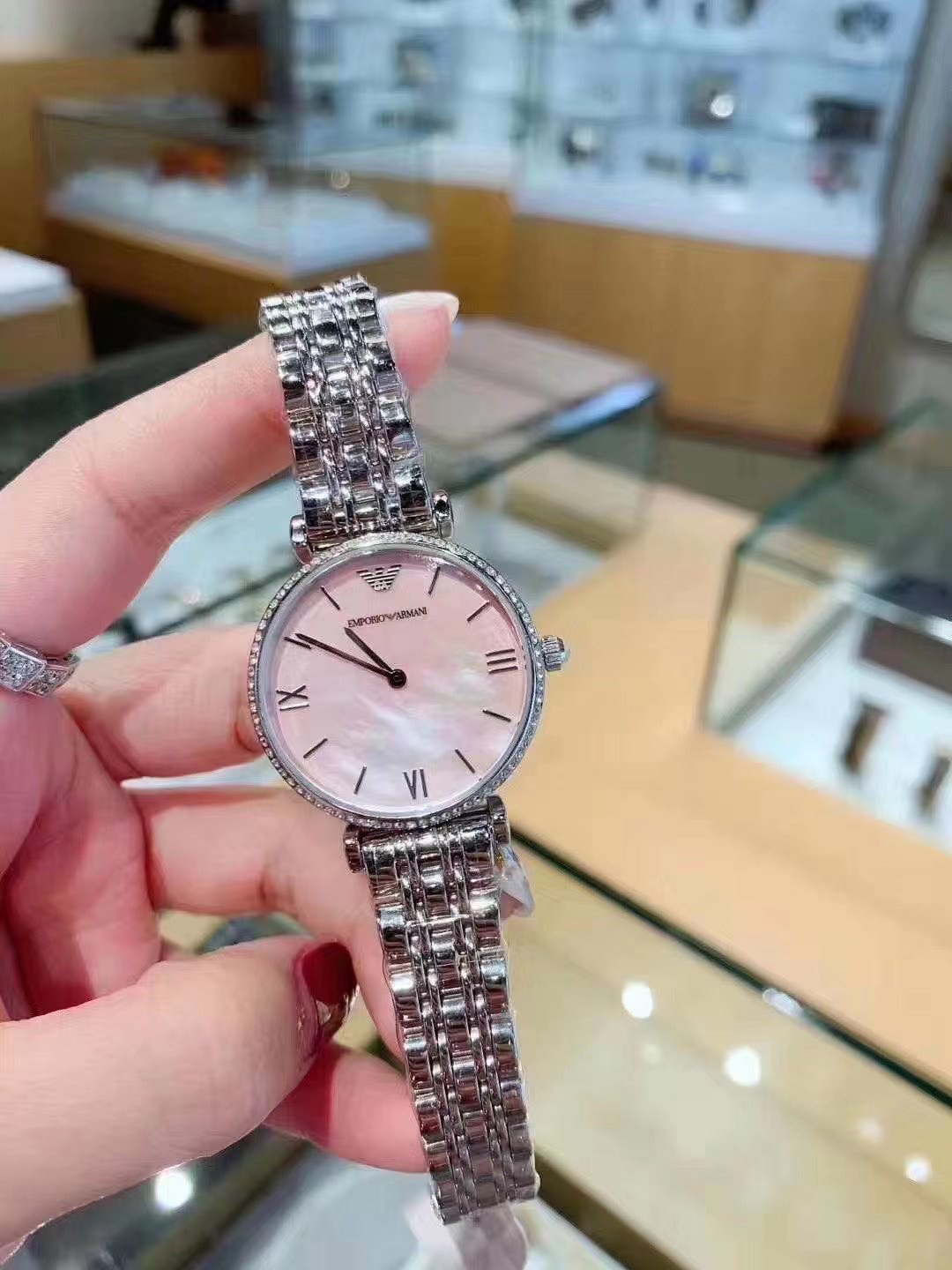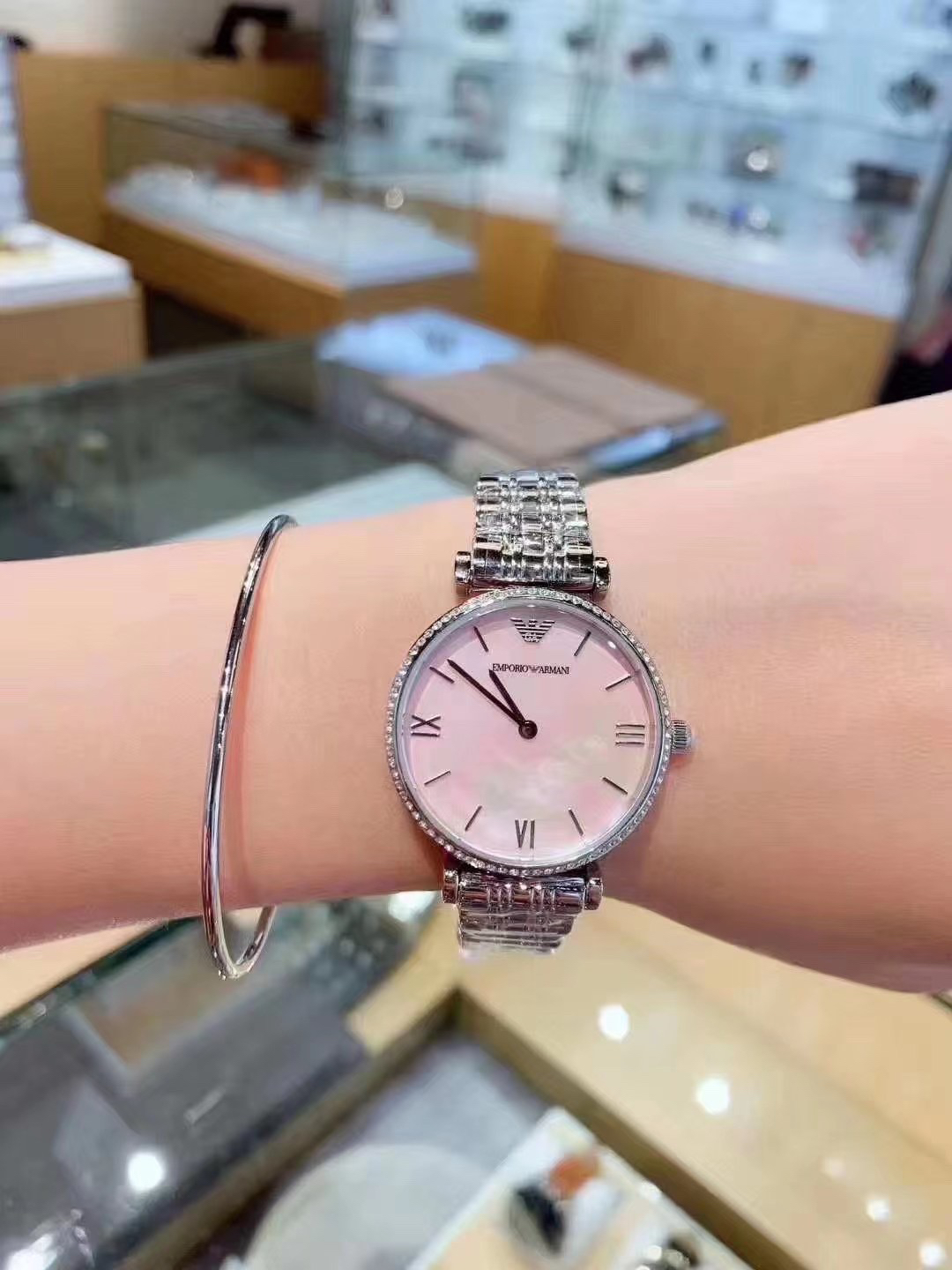 Armani阿玛尼女款手表,施华洛世奇水晶表盘,淡粉色天然贝母表盘,不同角度折射不同颜色,外圈镶钻,薄身表盘,精钢表带,32mm。
