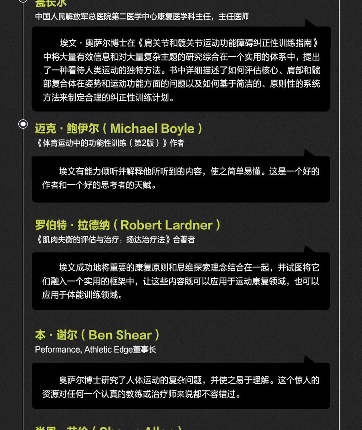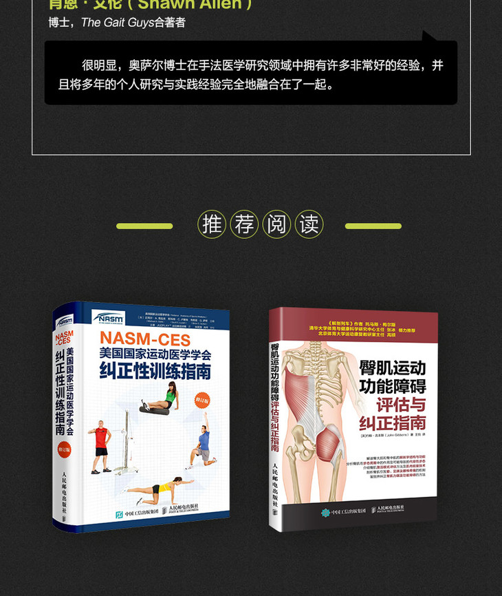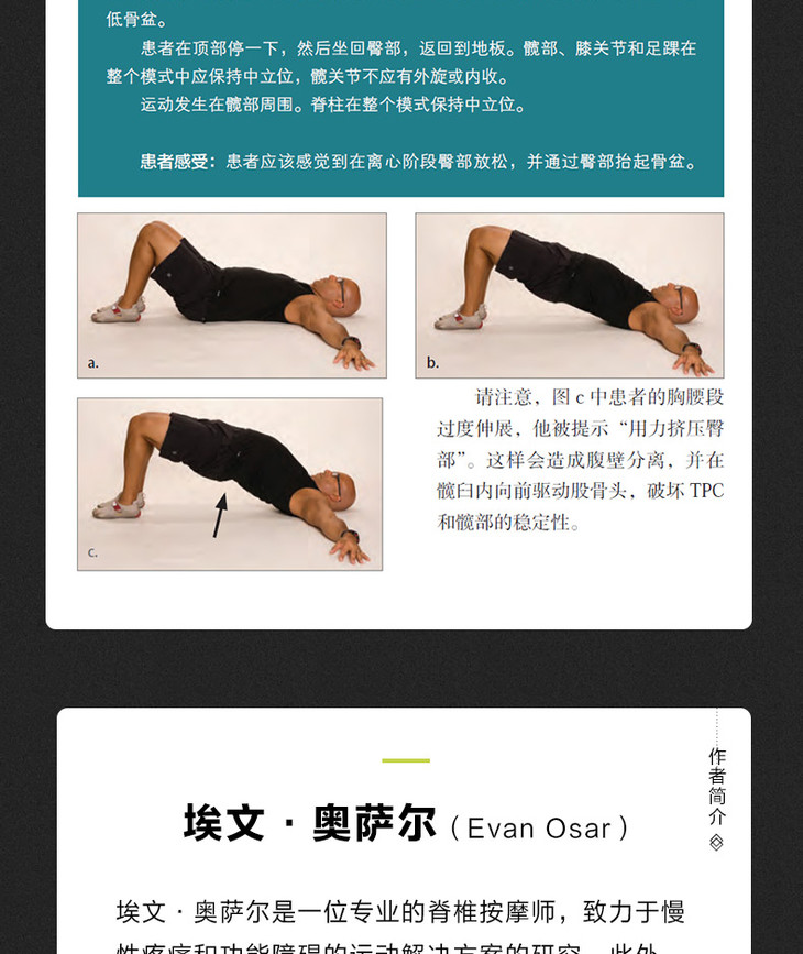 埃文·奥萨尔(Evan Osar) 埃文·奥萨尔是一位专业的脊椎按摩师,致力于慢性疼痛和功能障碍的运动解决方案的研究。此外,奥萨尔博士是一位关于“姿势、稳定性、纠正性训练及运动表现提升方案”的作者和国际讲师。