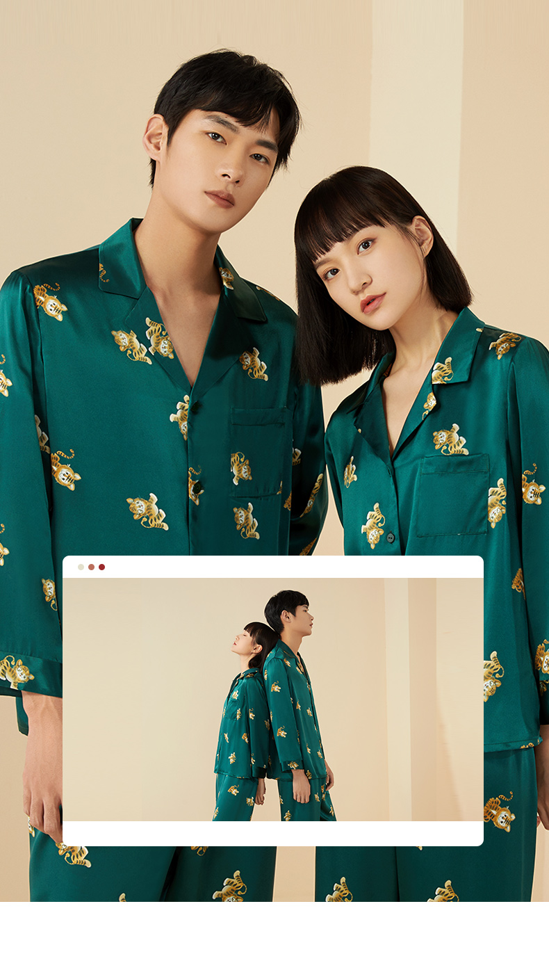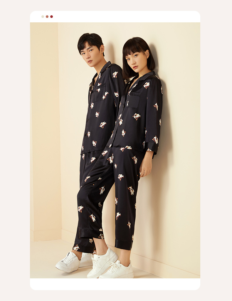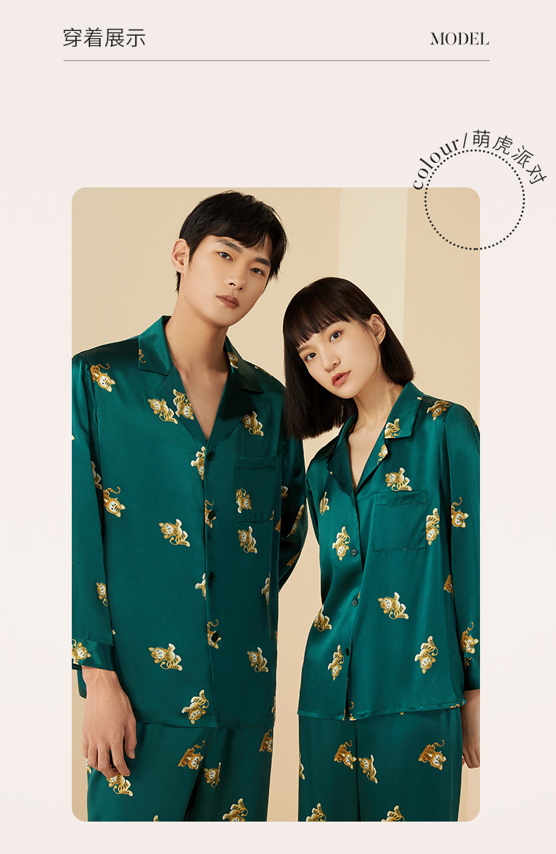 金三塔情侣100%桑蚕丝真丝睡衣 萌趣狐狸狗狗老虎印花男女家居服衣裤套 YSFCA213