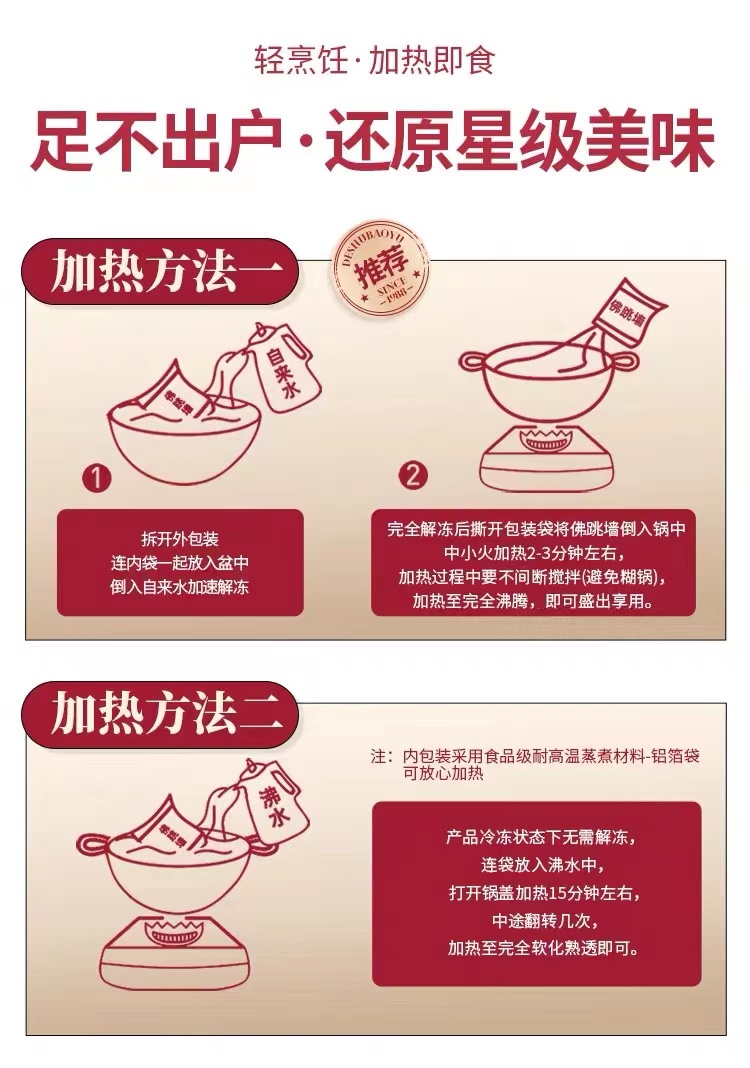 【品名】鲜捕头佛跳墙 【规格】250g*5盒 【保质期】12个月 【储存方法】-18℃以下冷冻保存 【产地】山东 【发货地】山东 【发货快递】顺丰/京东 【不发货区域】新疆,西藏,港澳台地区不发 【发货时效】48小时,节假日顺延 |